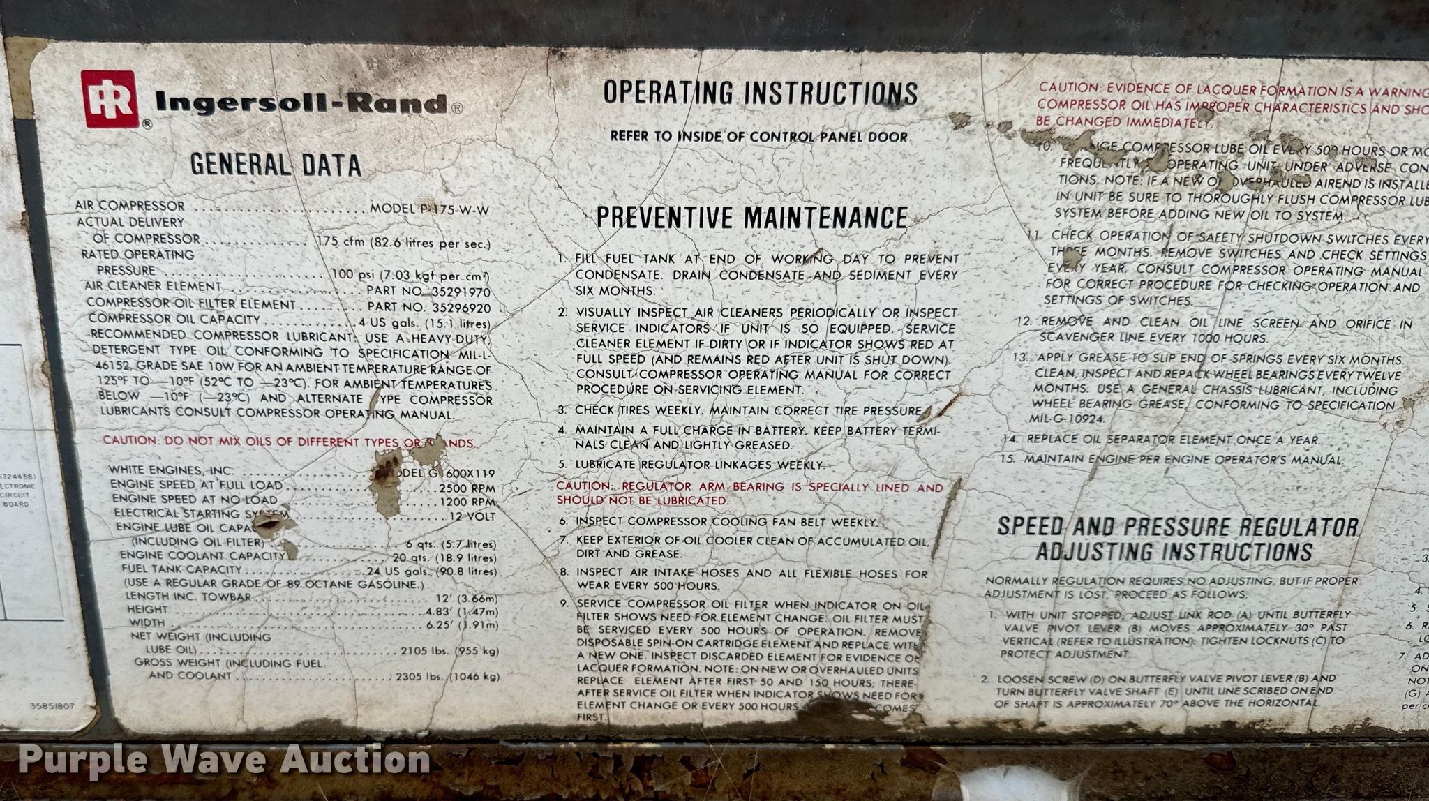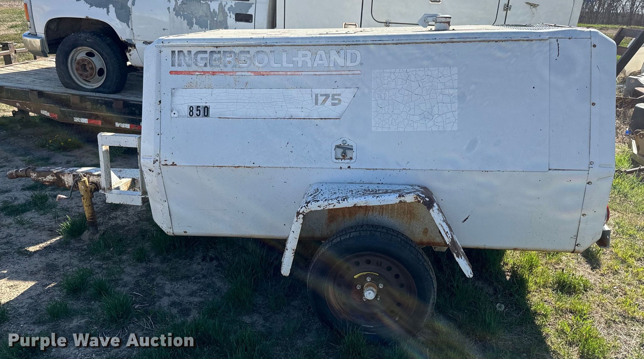 Ingersoll Rand 175 air compressor. Hours: 1,321 on meter, Serial: 115402-U80-919. Engine White Engines G600X119, Cylinders: 4, Fuel type: Gas. Features Air compressor Ingersoll Rand P175-W-W, CFM: 175, PSI: 100. Trailer Ball hitch size: 2", Suspension: Spring, Axles: Single, Tire size: 215/75R15, Tire size: T145/80D16. Notes Dead battery. This is worksite support equipment and will not come with a title. Transfer of ownership documentation will be a bill of sale. Agri Trails Coop. Chapman, KS 67431