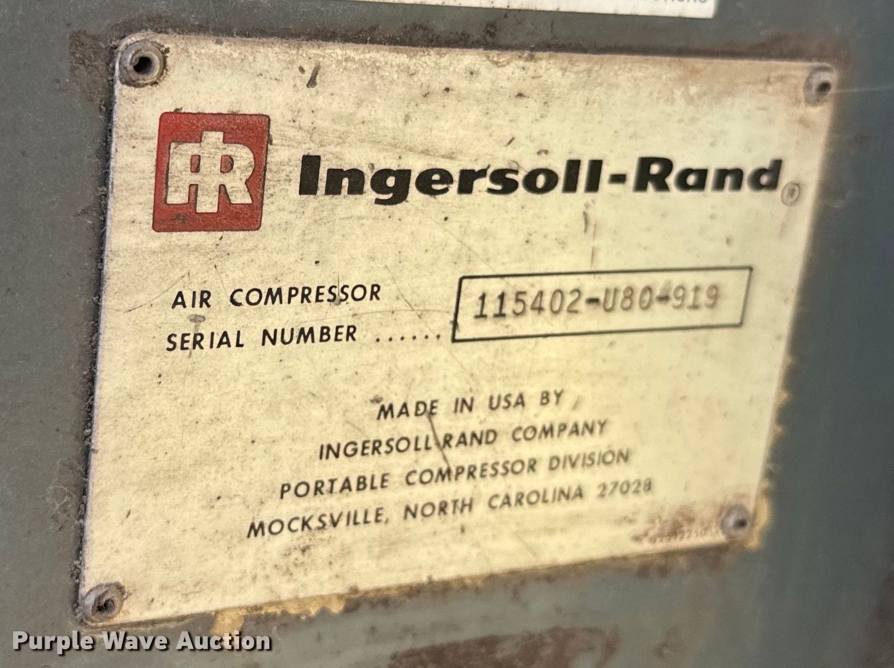 Purple Wave is selling a used Air Compressor in Kansas. This item is a Ingersoll Rand 175 air compressor with the following: Hours: 1,321 on meter, Serial: 115402-U80-919