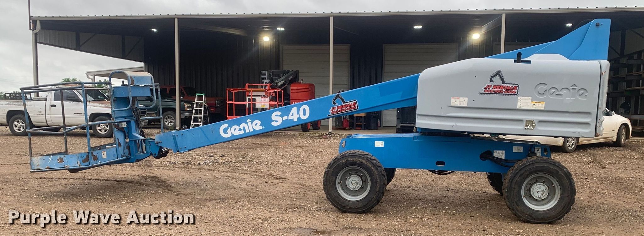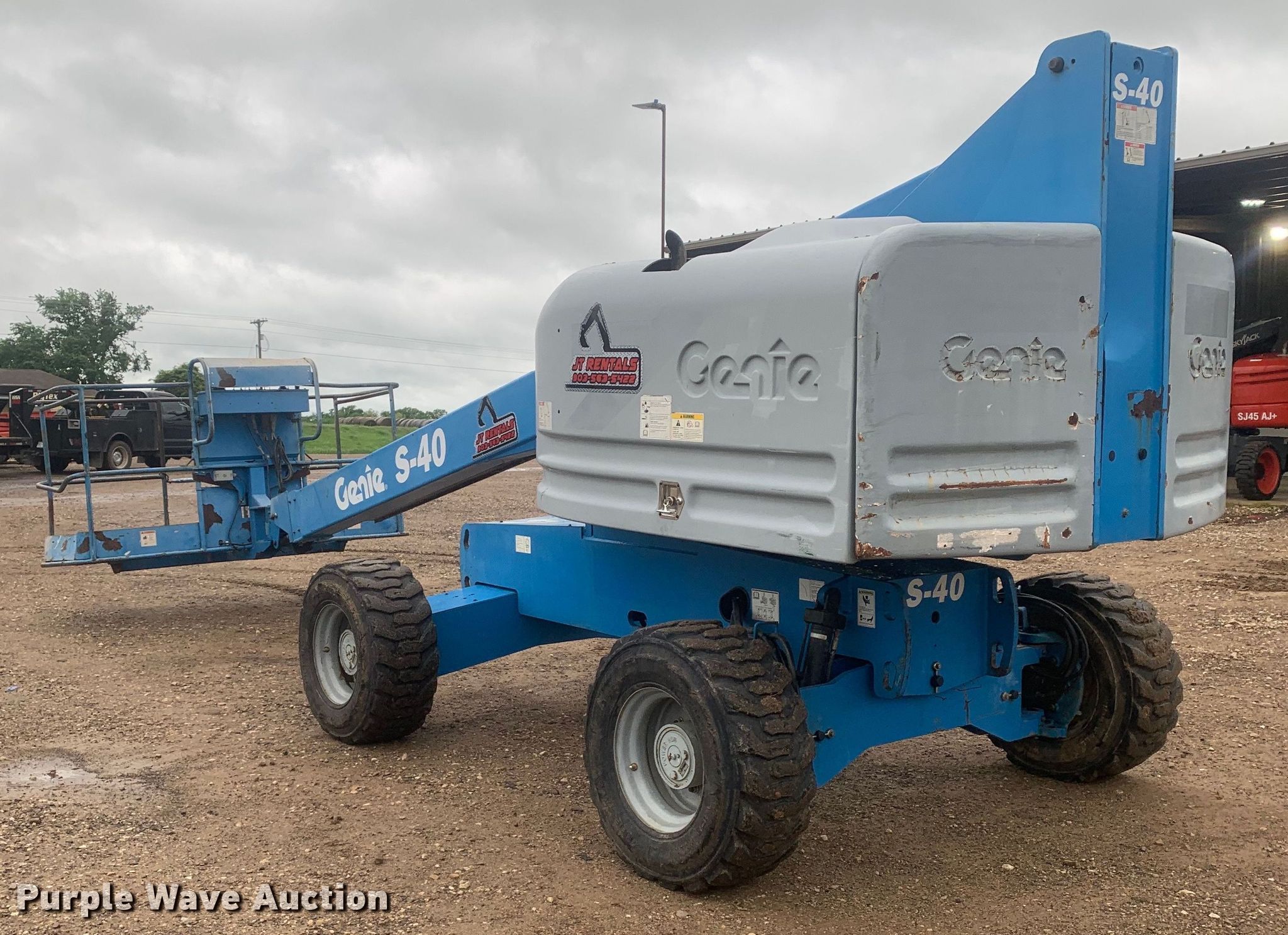 Purple Wave is selling a used Boom Lift in Texas. This item is a 2012 Genie S40 boom lift with the following: Hours: 4,187 on meter, Miles or hours may vary, unit still in use, Serial: S4012-17353