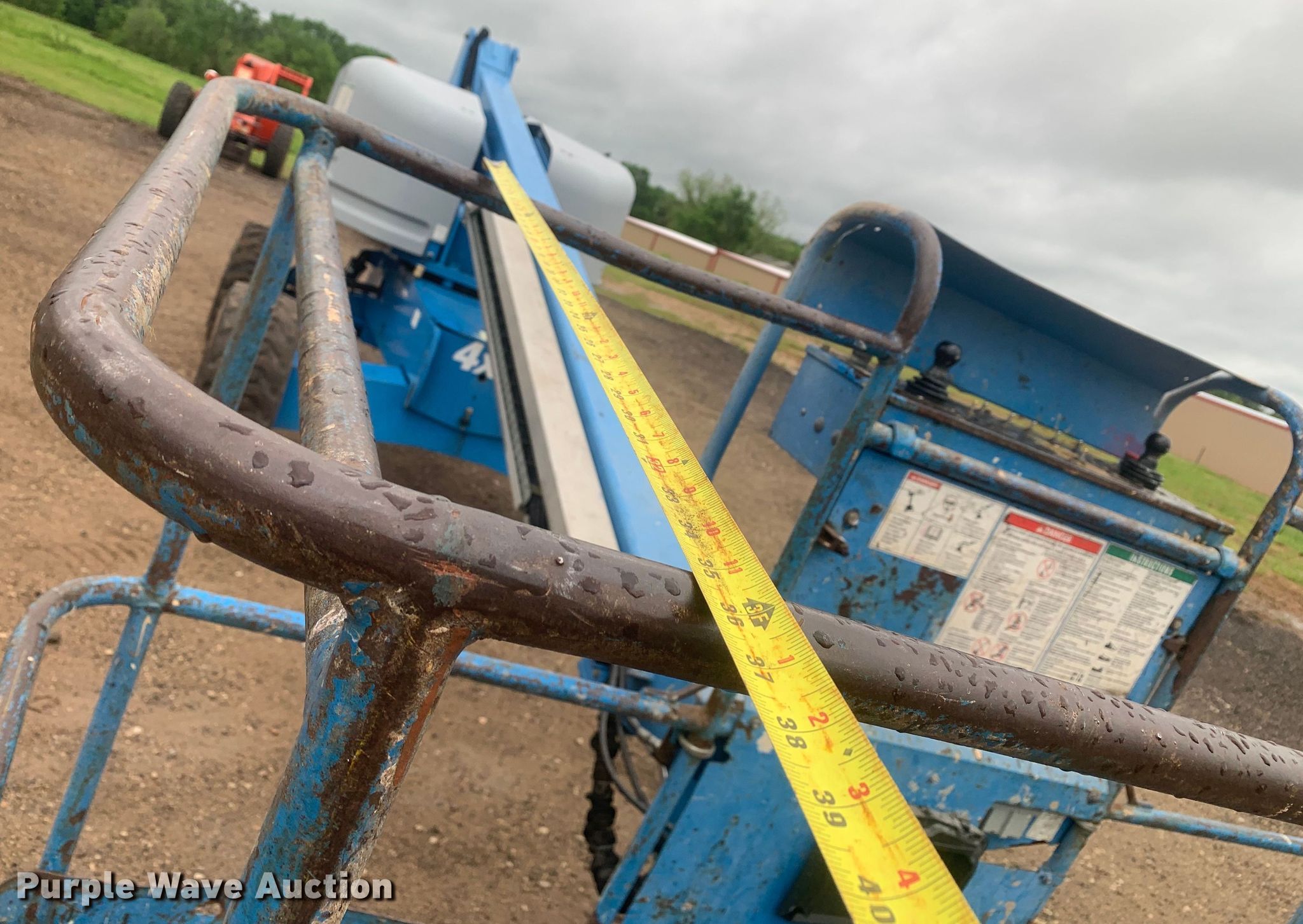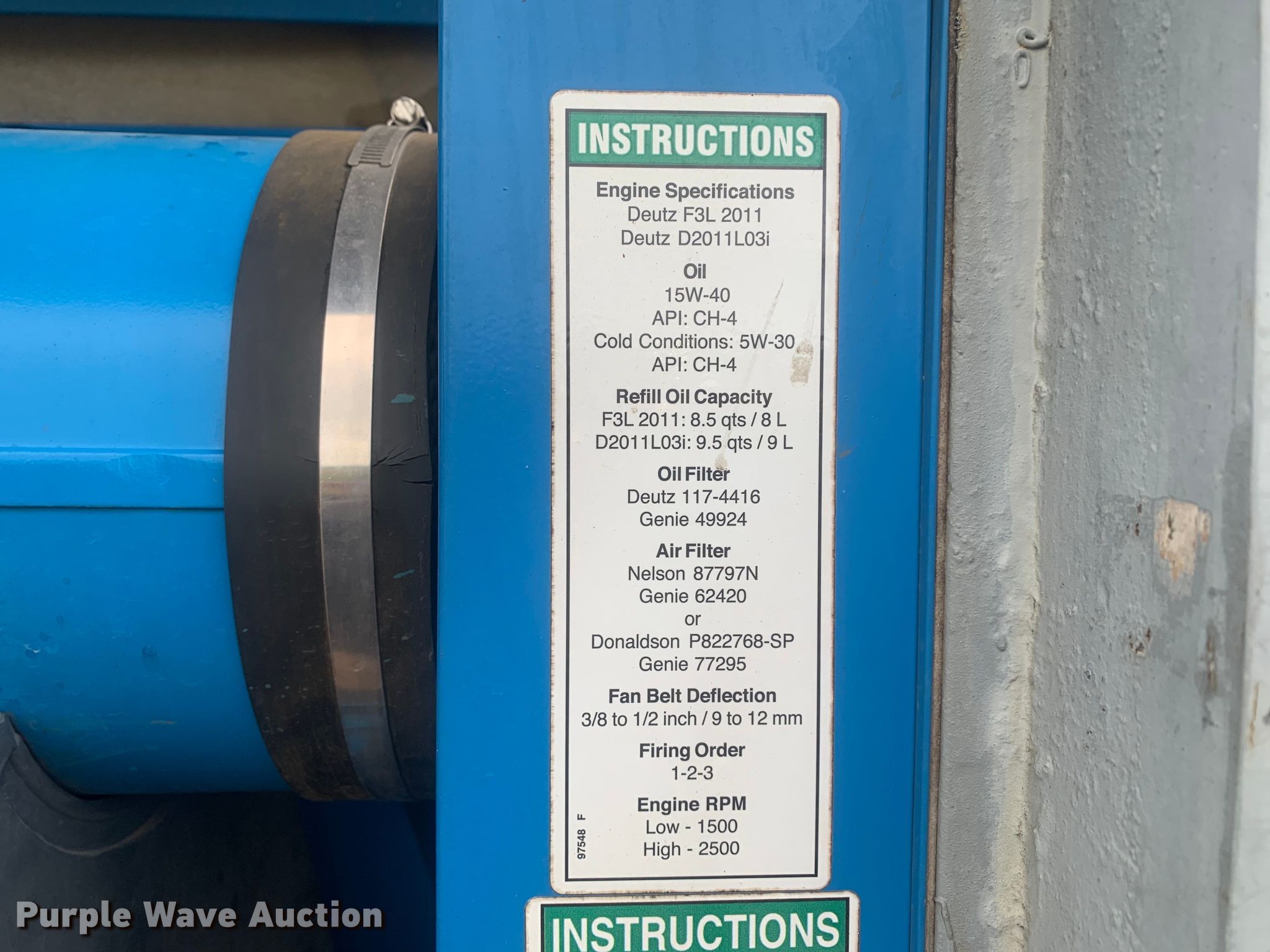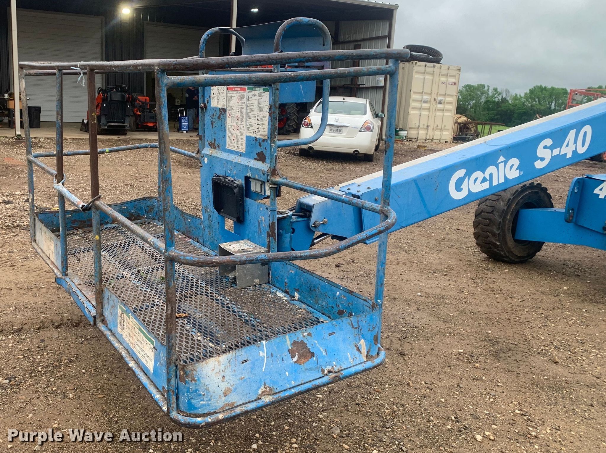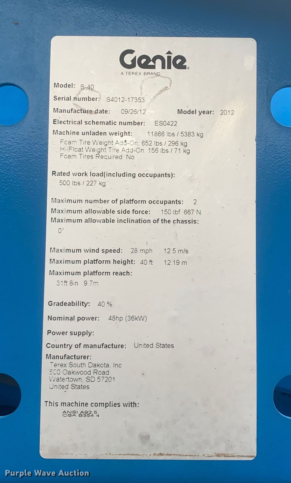 2012 Genie S40 boom lift. Hours: 4,187 on meter, Miles or hours may vary, unit still in use, Serial: S4012-17353. Engine Deutz D2011L03i, Displacement: 2.3L, Cylinders: 3, Fuel type: Diesel, kW: 19. Chassis Four wheel drive. Features Rough terrain, Maximum lift capacity: 500 lbs, Maximum reach length: 31' 8", Maximum lift height: 40', Hydraulic leveling, Platform: 92" L x 36" W, Controls: Platform, Ground, Platform rotation: Hydraulic. Tires Tire size: 12-16.5. Mt Vernon, TX 75457