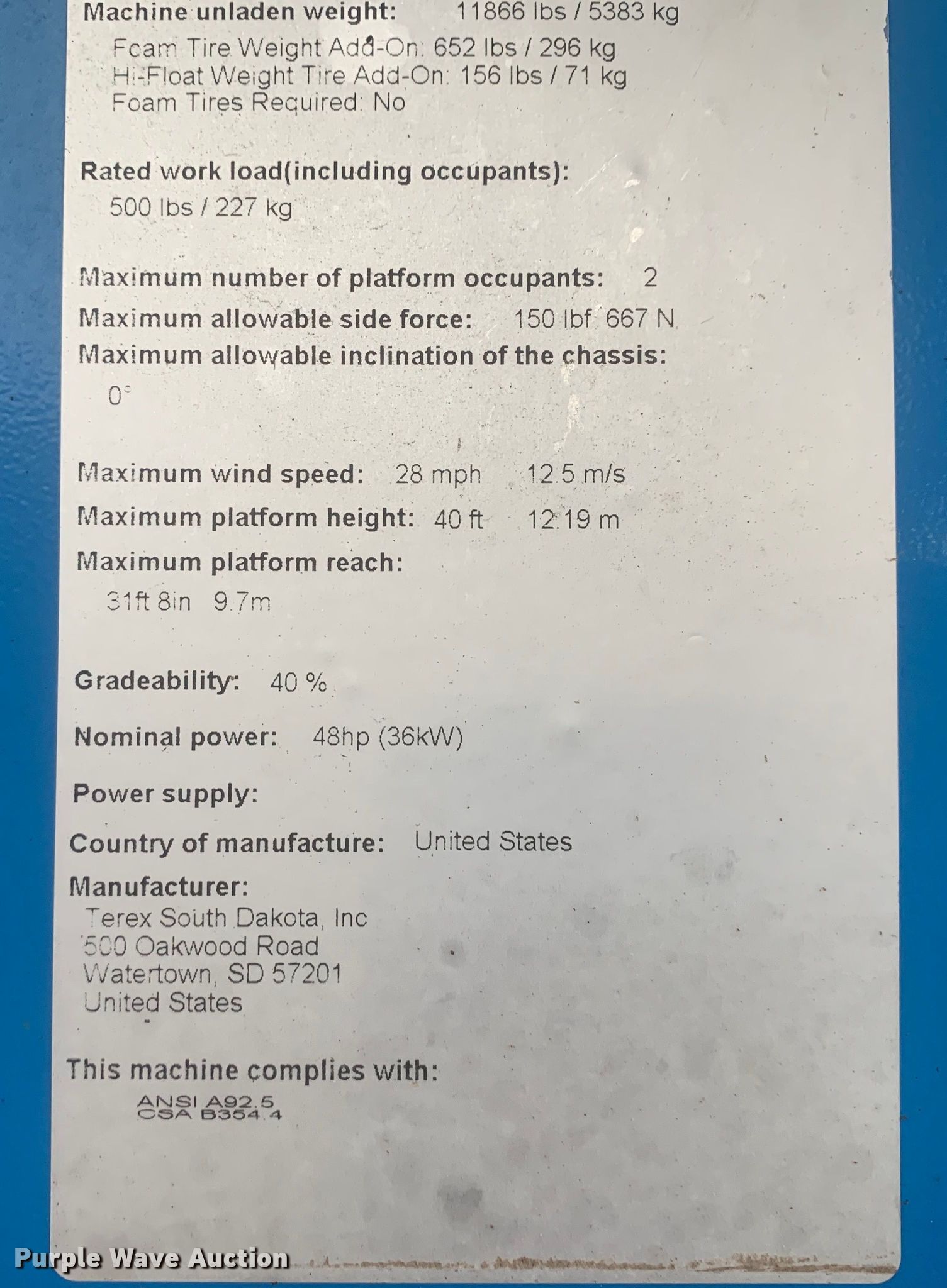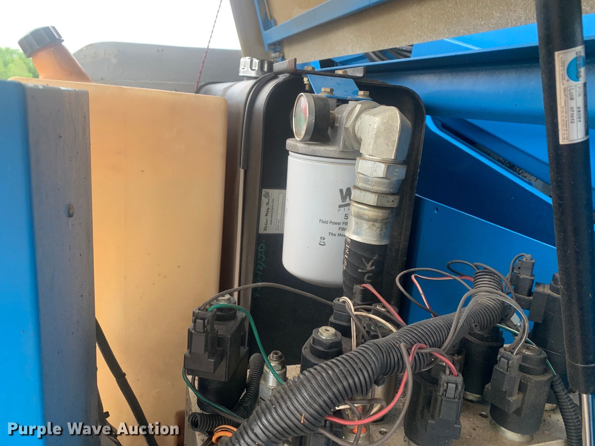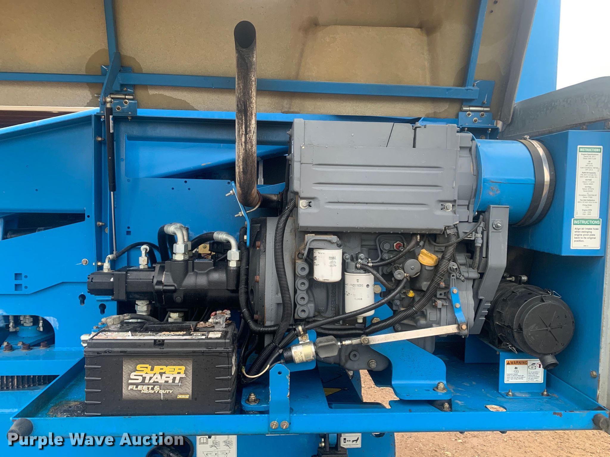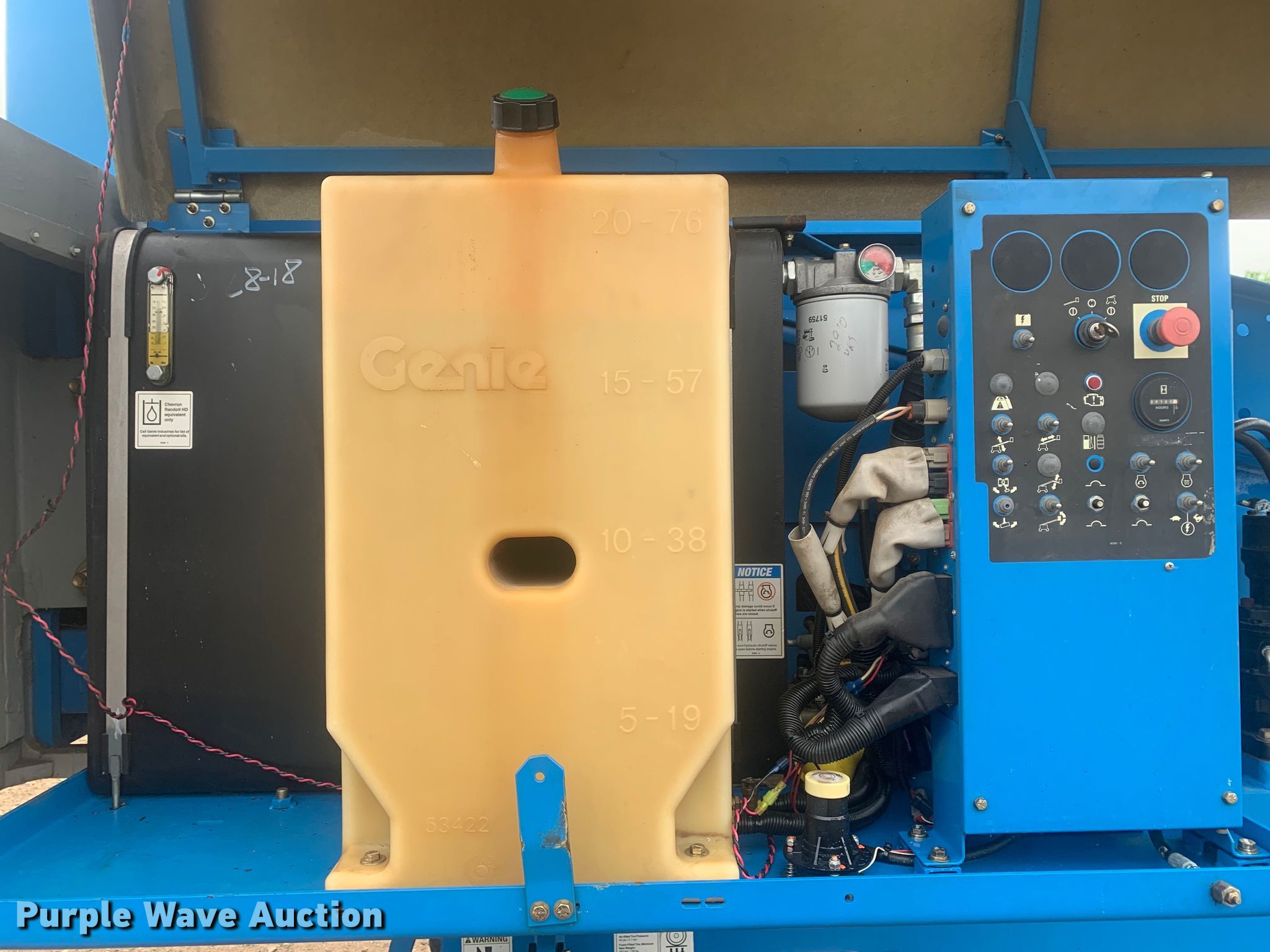 2012 Genie S40 boom lift. Hours: 4,187 on meter, Miles or hours may vary, unit still in use, Serial: S4012-17353. Engine Deutz D2011L03i, Displacement: 2.3L, Cylinders: 3, Fuel type: Diesel, kW: 19. Chassis Four wheel drive. Features Rough terrain, Maximum lift capacity: 500 lbs, Maximum reach length: 31' 8", Maximum lift height: 40', Hydraulic leveling, Platform: 92" L x 36" W, Controls: Platform, Ground, Platform rotation: Hydraulic. Tires Tire size: 12-16.5. Mt Vernon, TX 75457