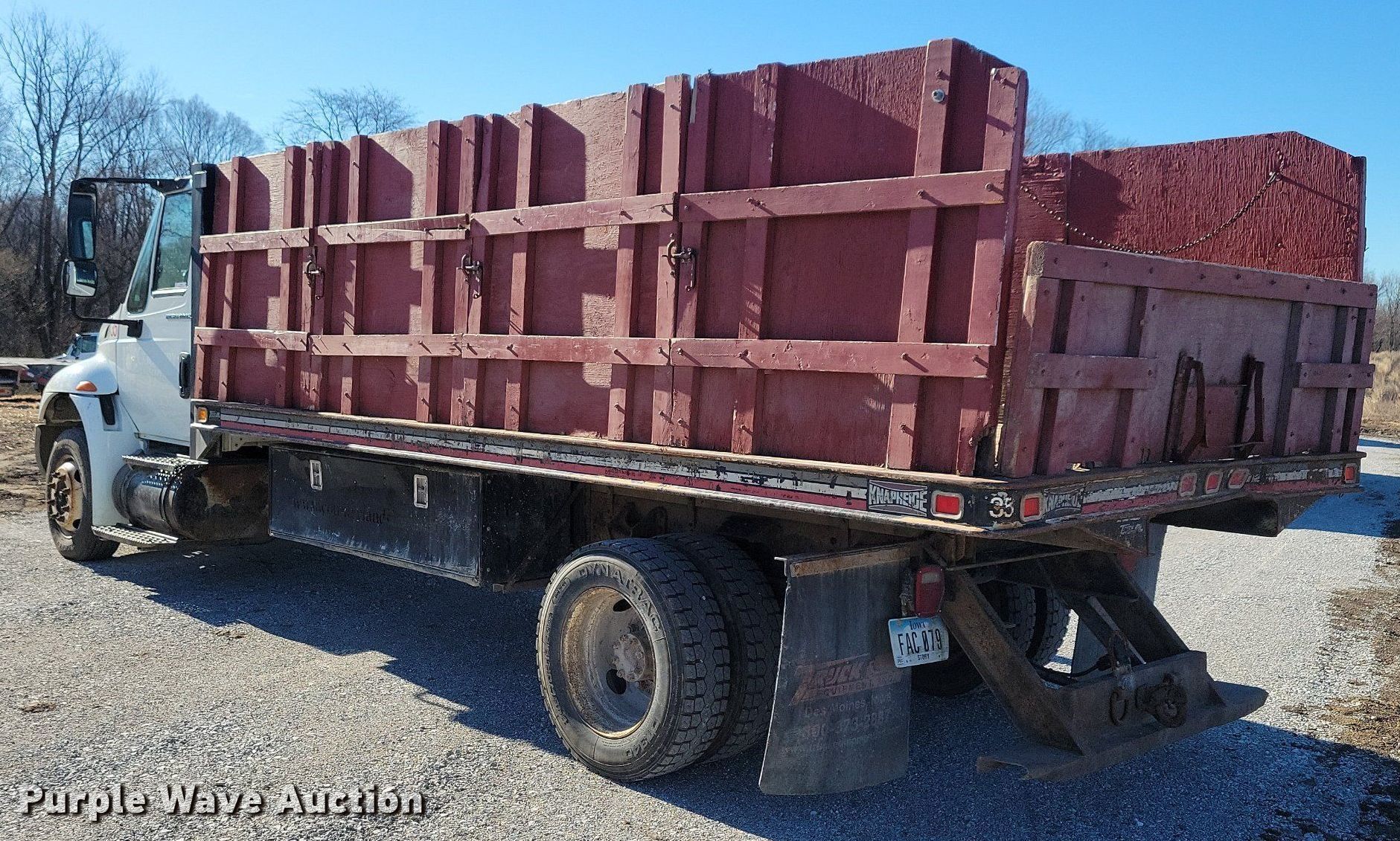 2007 International 4300 dump flatbed truck. Miles: 257,035 on odometer, Hours: 8,839 on meter, VIN: 1HTMMAAM17H366559. Engine International, Displacement: 7.6L, Cylinders: 6, Fuel type: Diesel. Transmission Automatic. Chassis Axles: Single, Suspension: Spring, Brakes: Hydraulic, PTO, GVWR: 25,500 lbs. Interior AC, Heat, Cruise control, Brake controller. Features Dump flatbed Knapheide, 16' 6" L x 96" W, Removable sides, Ram: Single. Tires Size: 245/70R19.5. Notes Toolbox door issues, sticks, Dash warning indicator: ABS, Windshield chipped or cracked, Maintenance records available upon request to [email protected]. Iowa title. Title distribution may be delayed up to 14 days from verification of funds. Country Landscapes, Inc.. 3801 East Lincoln Way. Ames, IA 50010
