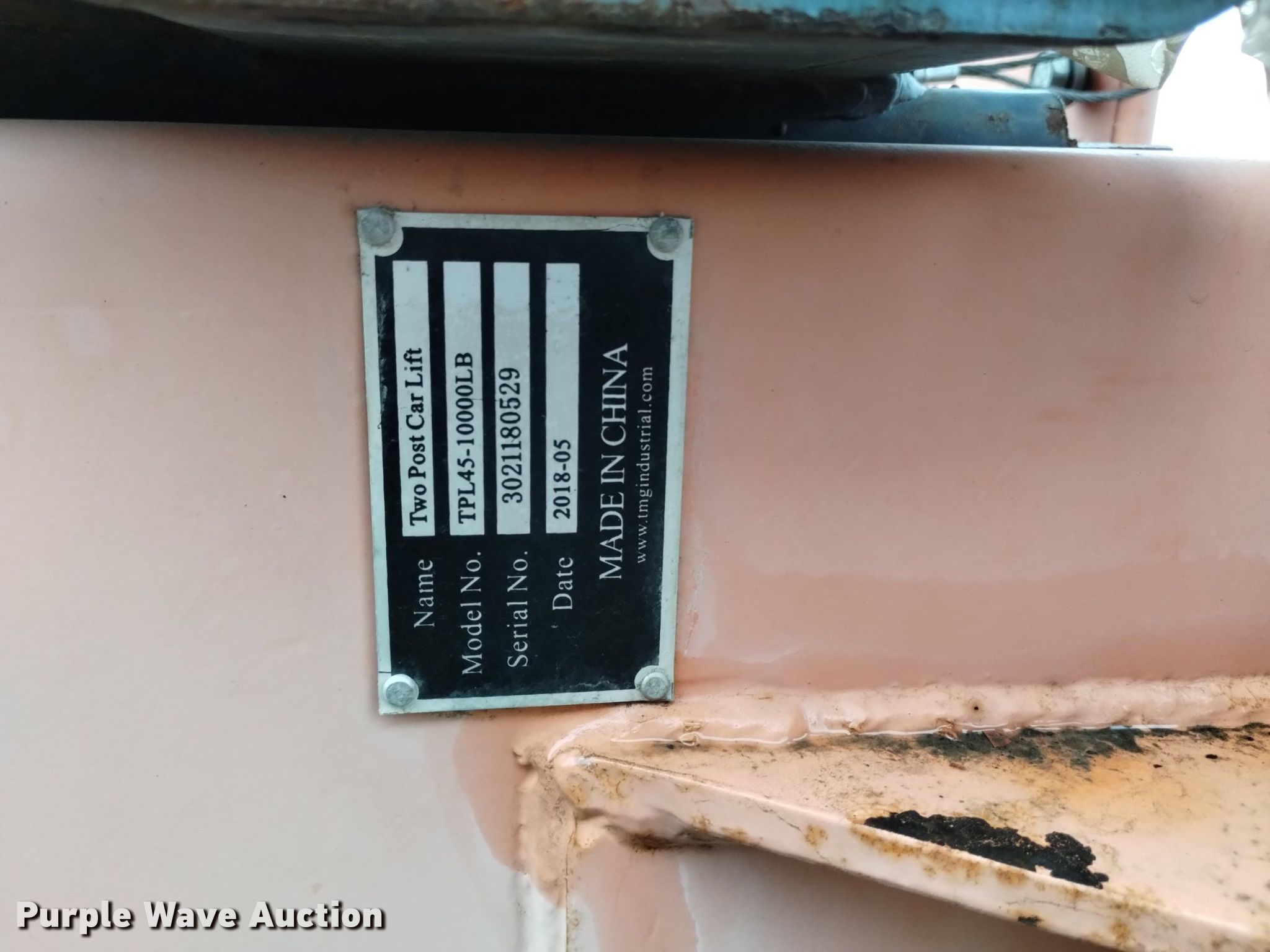 Purple Wave is selling a used Tools in Colorado. This item is a 2018 TMG TPL45-10000LB two post automotive lift with the following: Serial: 3021180529, No hydraulic motor
