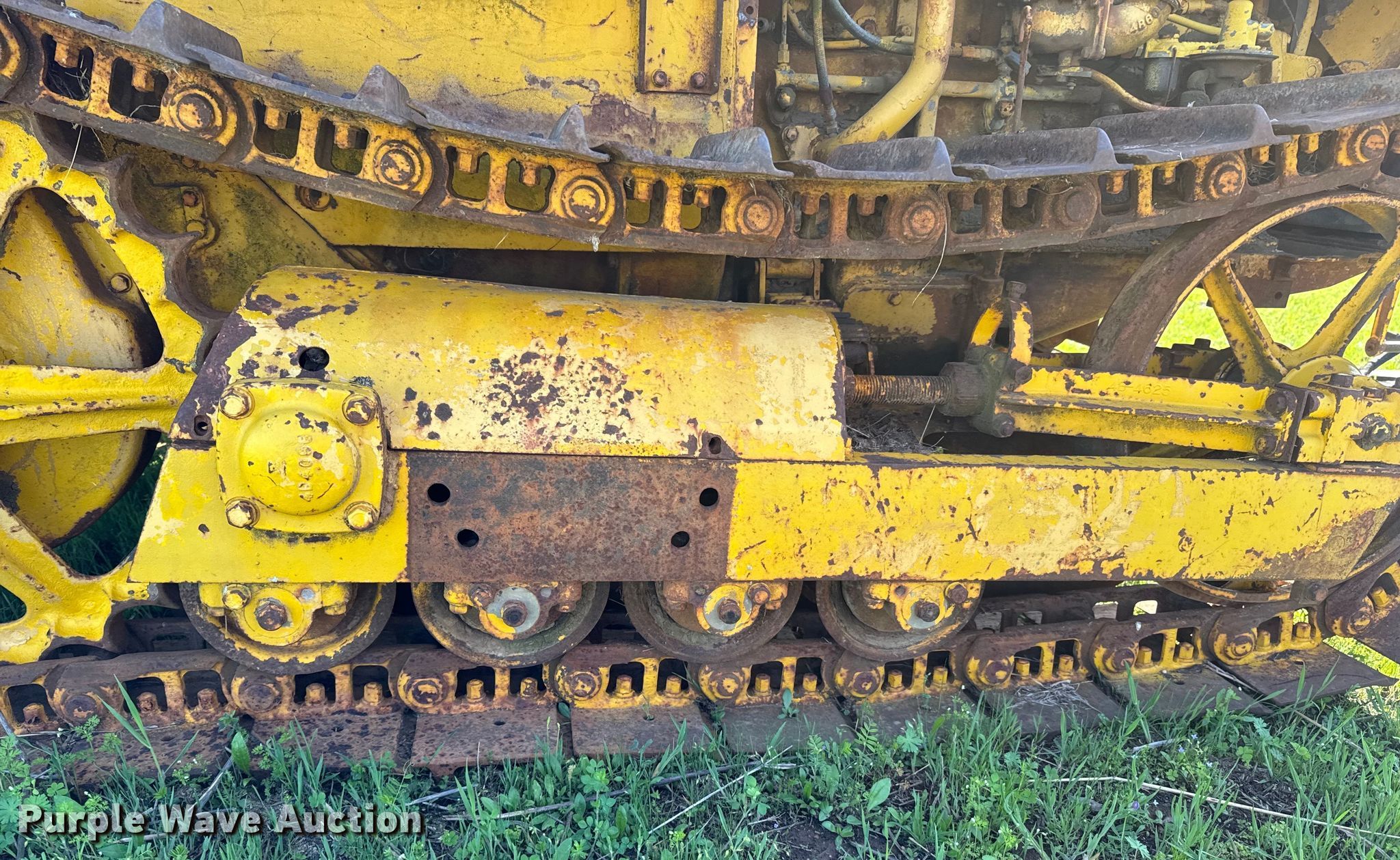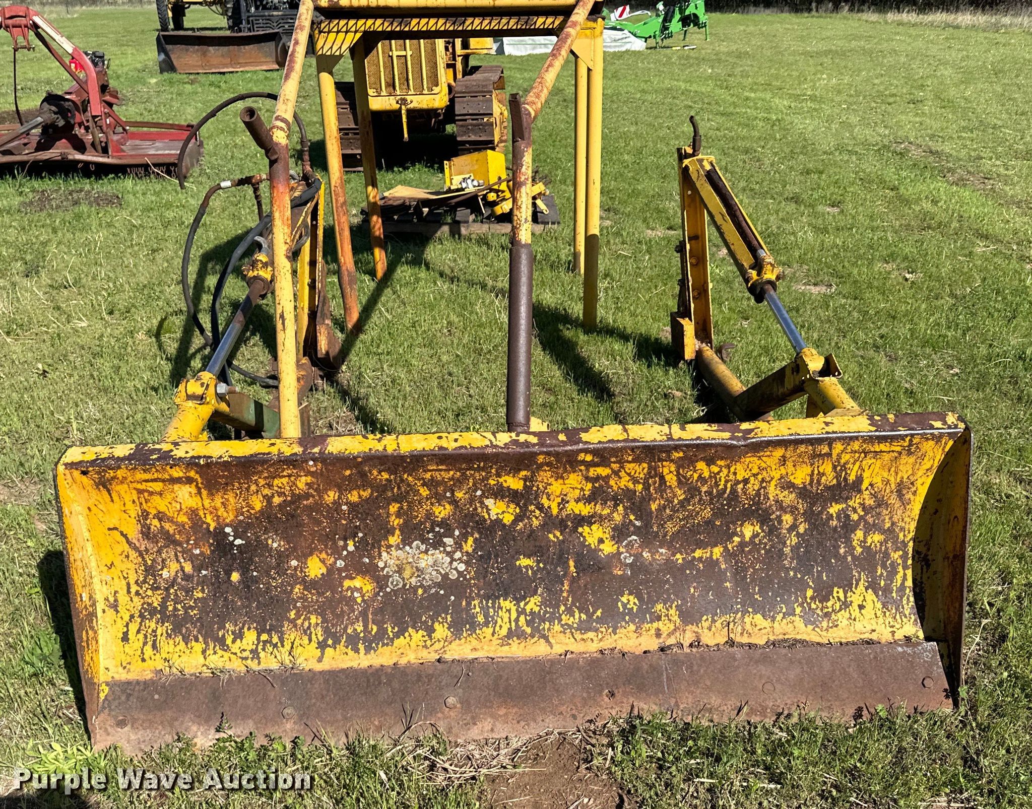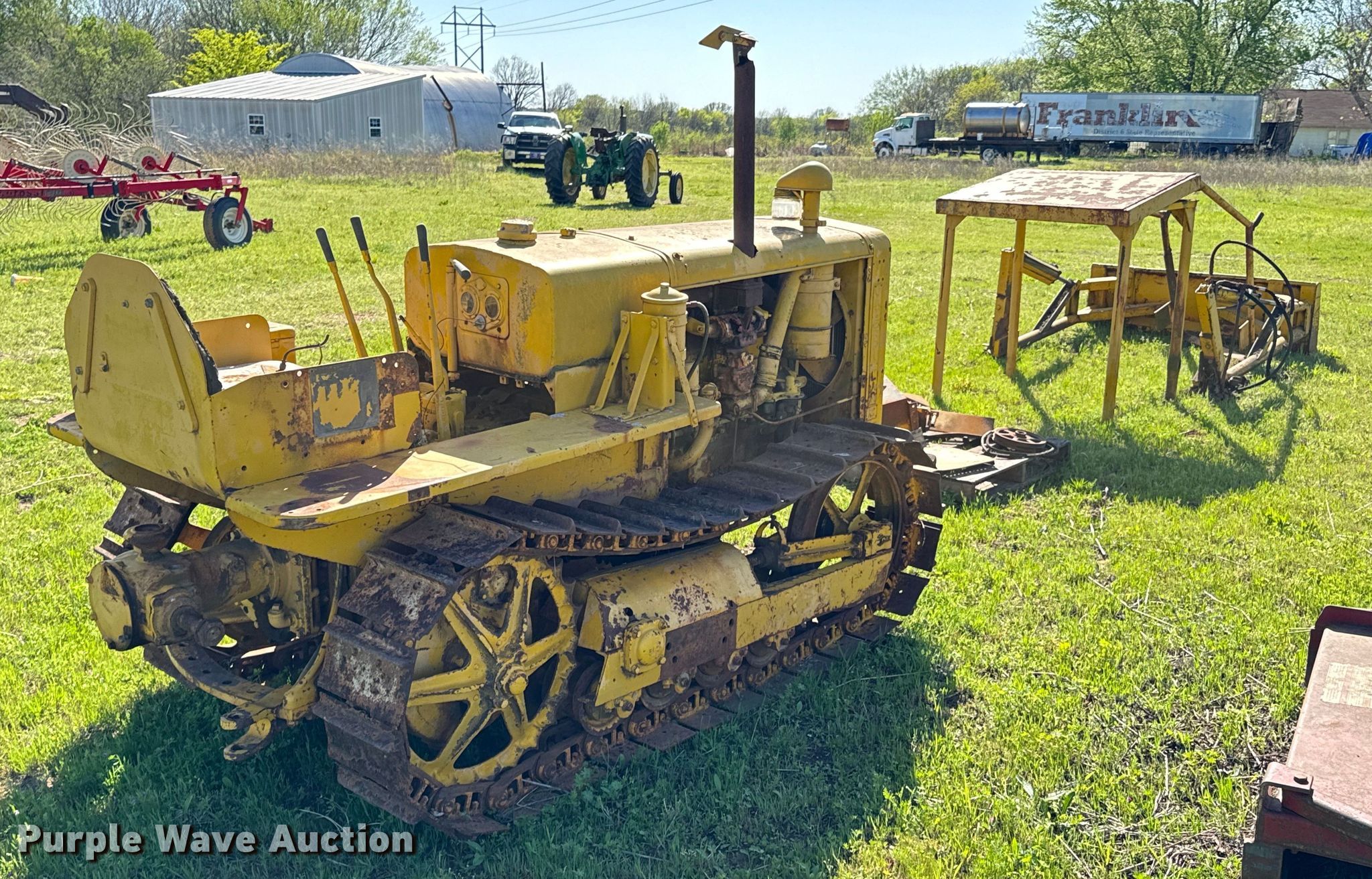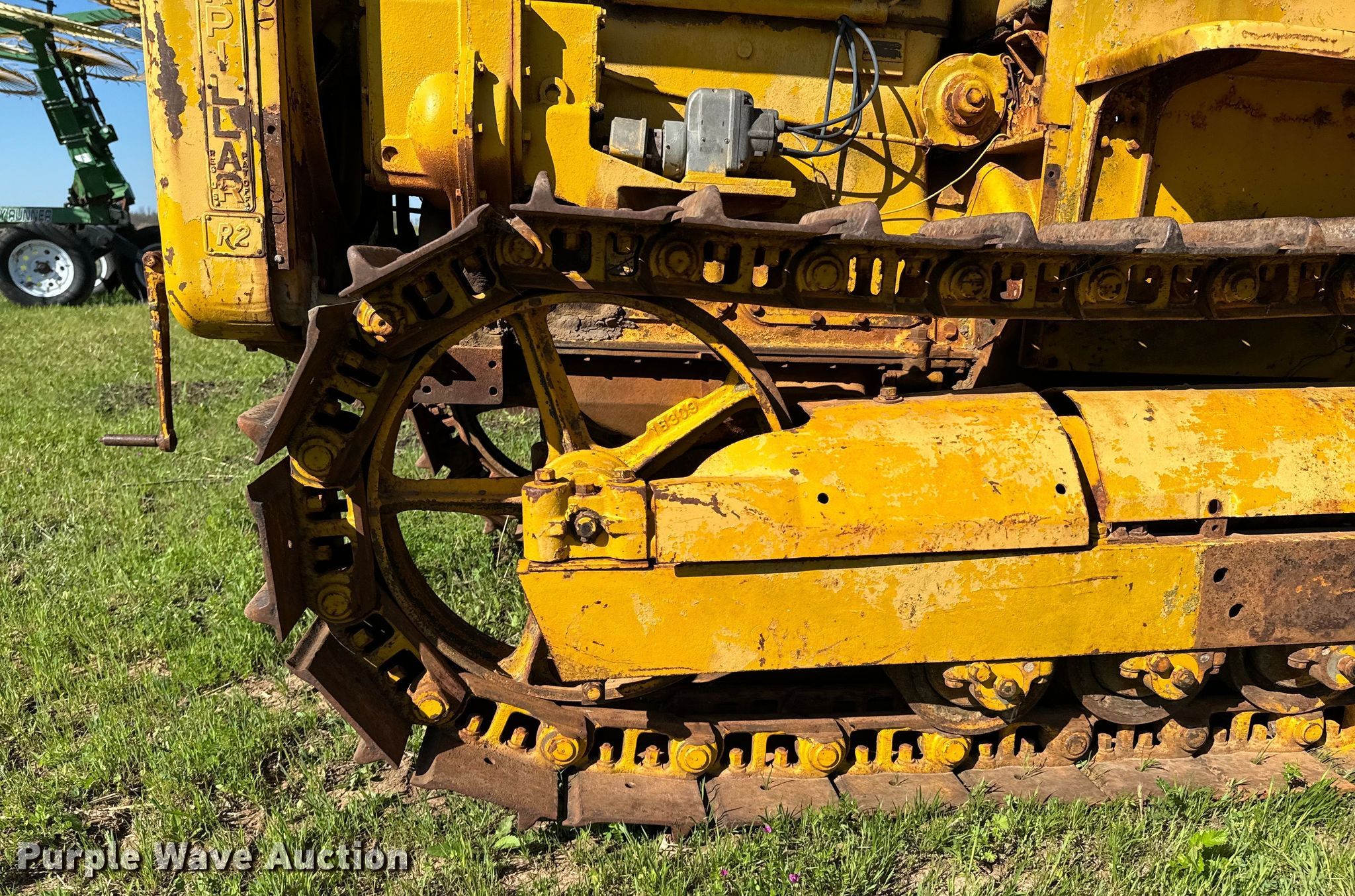 Caterpillar R2 dozer. Engine. Cylinders: 4, Fuel type: Gas. Transmission Manual, 5F - 1R. Features Dozer blade Type: Straight, Width: 5' 6". Tracks Width: 12", Grouser pads: Single, Bottom rollers: 4. Notes Non-operational unit. Franklin Farms. Vinita, OK 74301