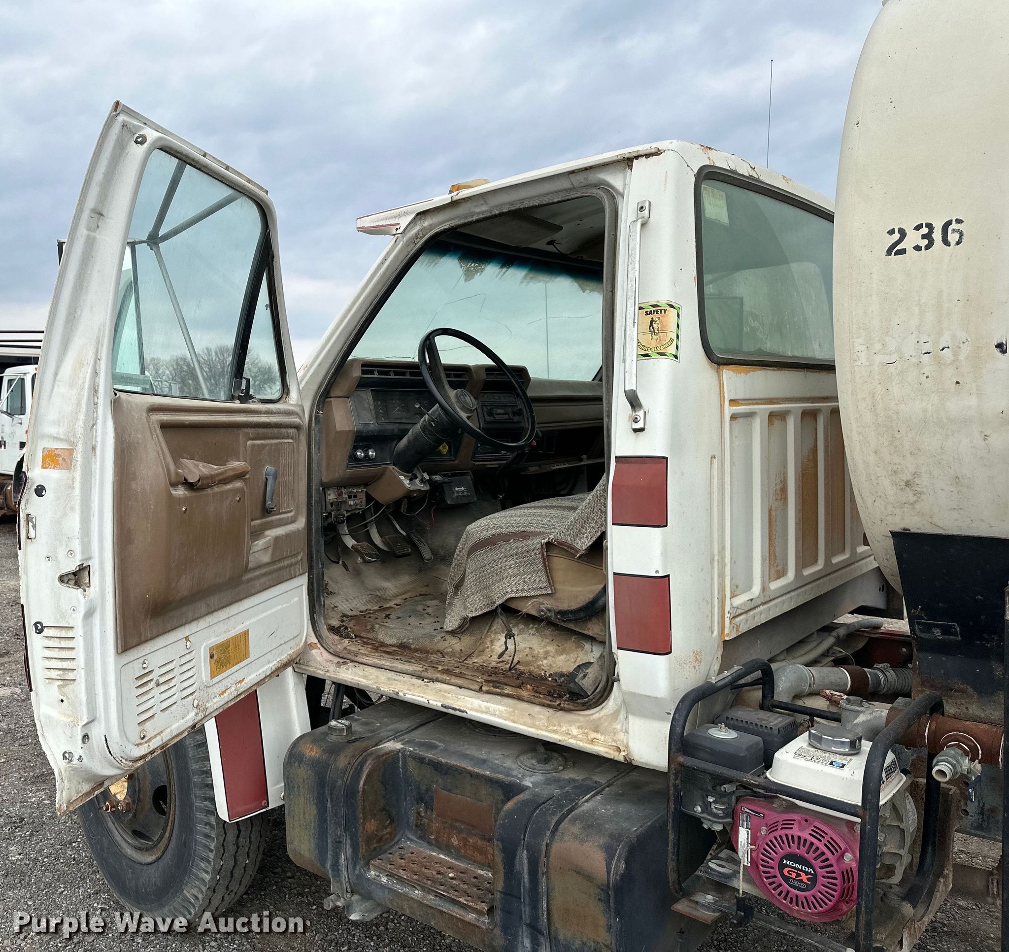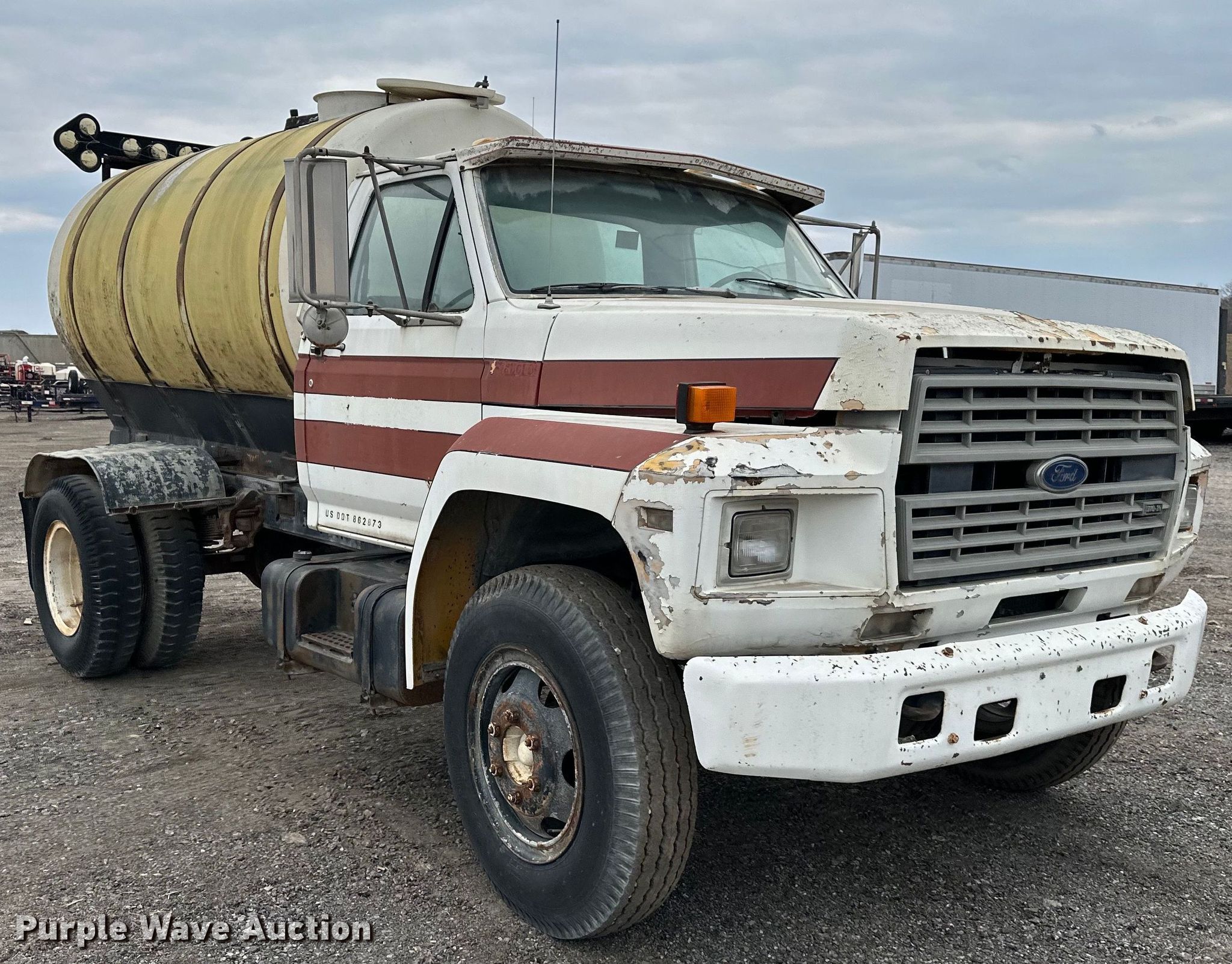Purple Wave is selling a used Tank Truck or Water Truck in Kansas. This item is a 1989 Ford F600 water truck with the following: Miles: 50,579 on odometer, Hours: 2,546 on meter, VIN: 1FDNF60H1KVA22183