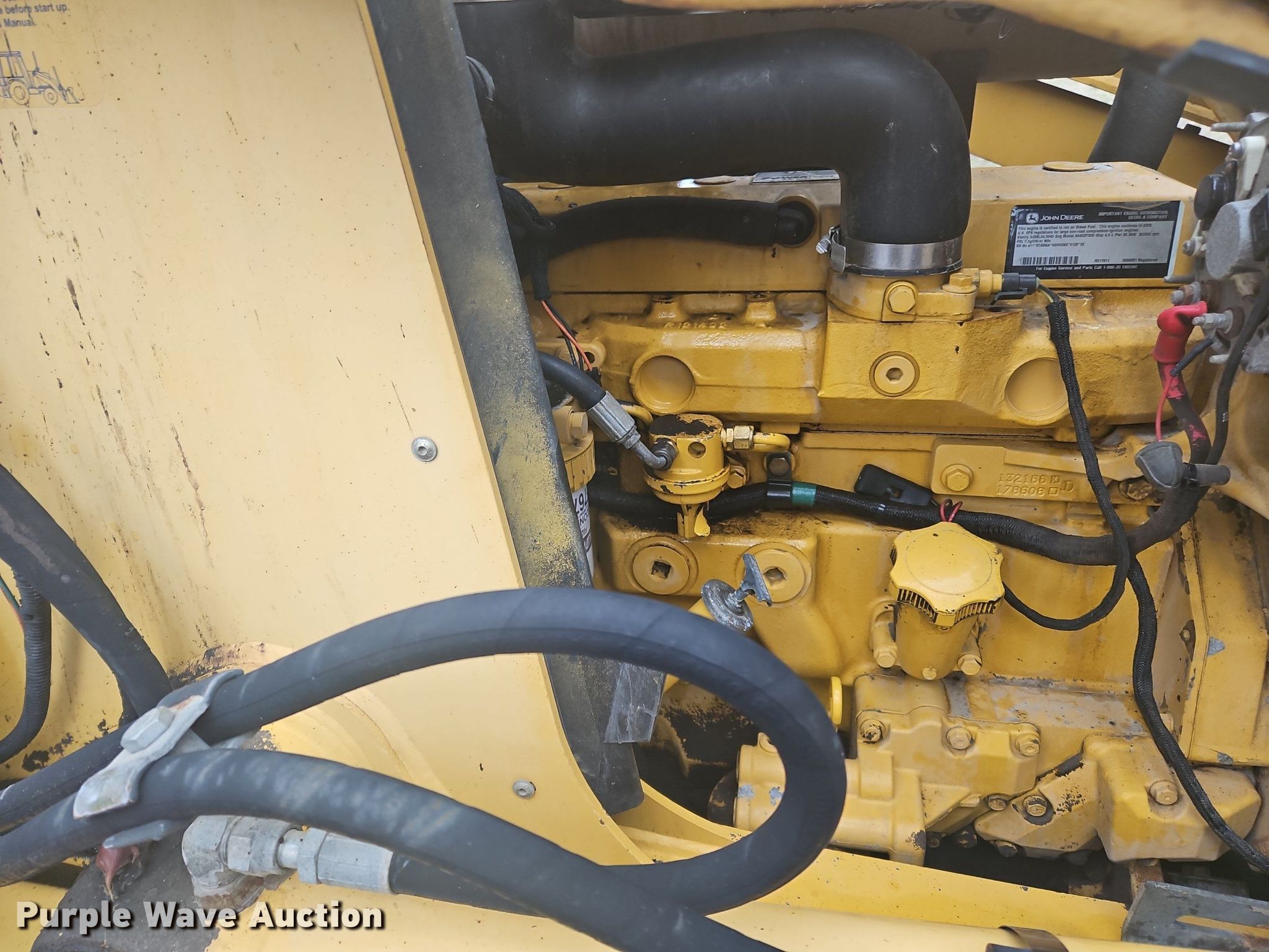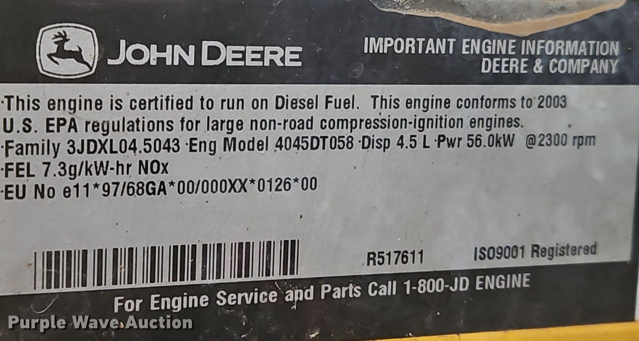 2003 John Deere 310G backhoe. Hours: 3,011 on meter, Serial: T0310GX924665. Engine John Deere 4045DT058, Displacement: 4.5L, Cylinders: 4, Fuel type: Diesel. Transmission Shuttle shift, 4F - 4R. Chassis Four wheel drive, Differential lock. Operators station Backhoe controls: Wobble stick / two stick. Features Loader Bucket Bucket leveler, Width: 84", Cutting edge: Bolt-on, Backhoe Bucket BK, Width: 17", Teeth: 4.. Tires Front: 12-16.5, Rear: 19.5L-24. Creek Enterprise Inc. 1306 Page Avenue. Jackson, MI 49203