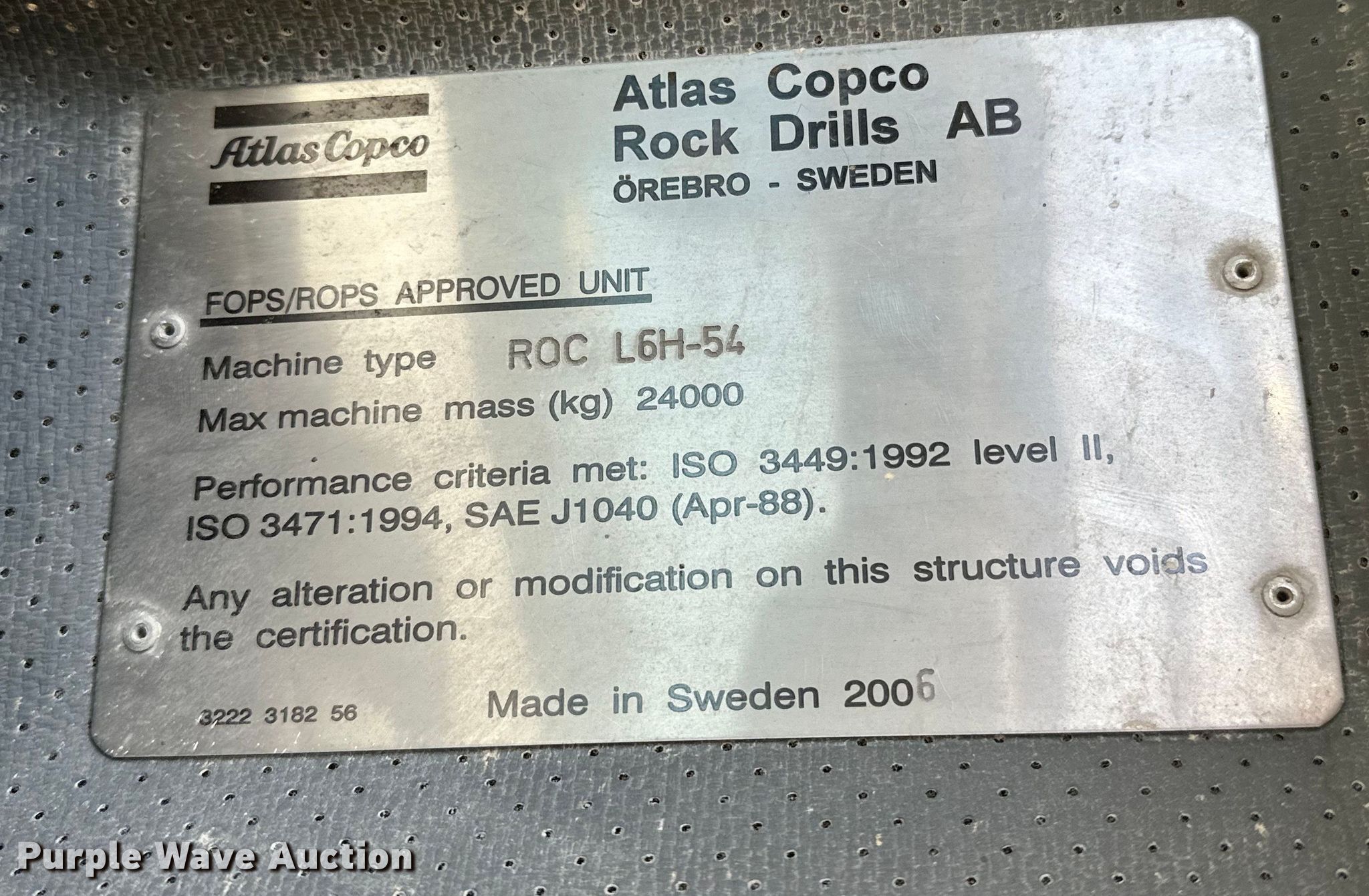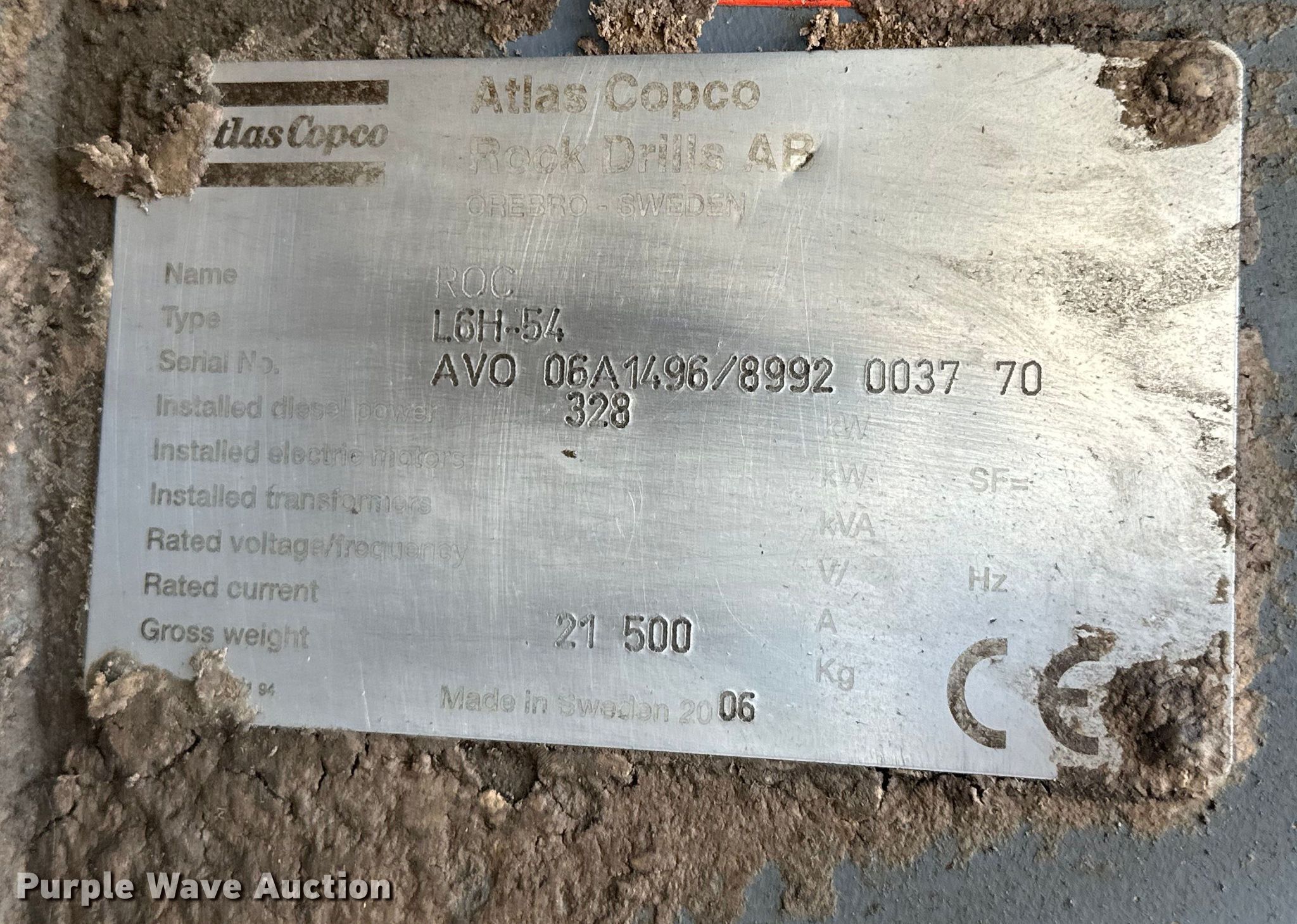 Purple Wave is selling a used Blasthole Drill in Oklahoma. This item is a 2006 Atlas Copco ROC L6H-54 rock drill with the following: Hours: 1,717 on meter, VIN: AVO06A1496/8992003770