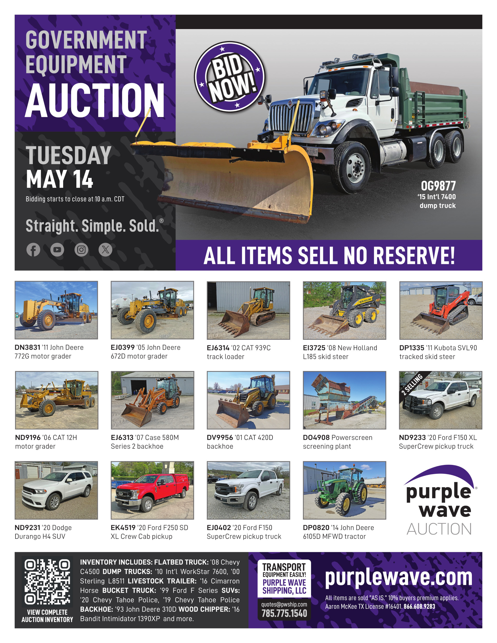 Purple Wave attempts to give its customers an industry leading experience by providing detailed equipment listings. Listings include written descriptions, photographs, location, and consignor information. Equipment descriptions are based on our direct observation and information provided by our selling customer. All information is intended to be as accurate as possible. However, we recommend customers inspect prior to bidding. Purple Wave listings are not intended to be substitutions for inspection. The details provided may differ on equipment based on information provided by the consignor. An error or omission in the listing will not change the results of the bid. It is the responsibility of the buyer to conduct any inspection and examination necessary to satisfy the buyer of all material facts before placing a bid.