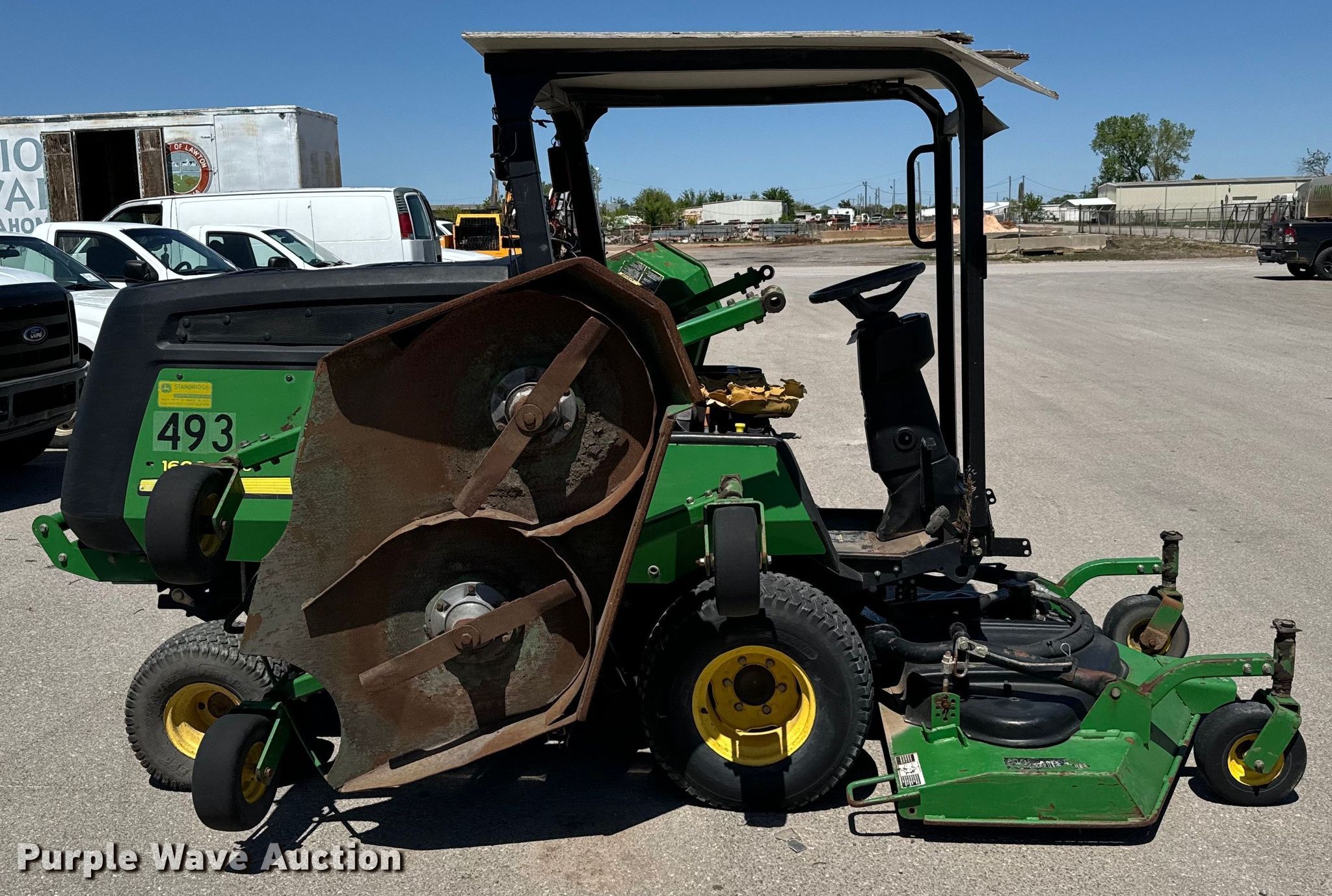John Deere 1600 Turbo lawn mower. Hours: Unknown, Cutting width: 132", Serial: TC1600T060307, Unit #: 493. Engine Cylinders: 4, Fuel type: Diesel. Transmission Hydrostatic. Features Hydraulic fold decks, Hydraulic front deck lift, Flip up front deck. Tires Front: 26x12.00-12, Rear: 20x10.00-8. City of Lawton, OK. Lawton, OK 73501