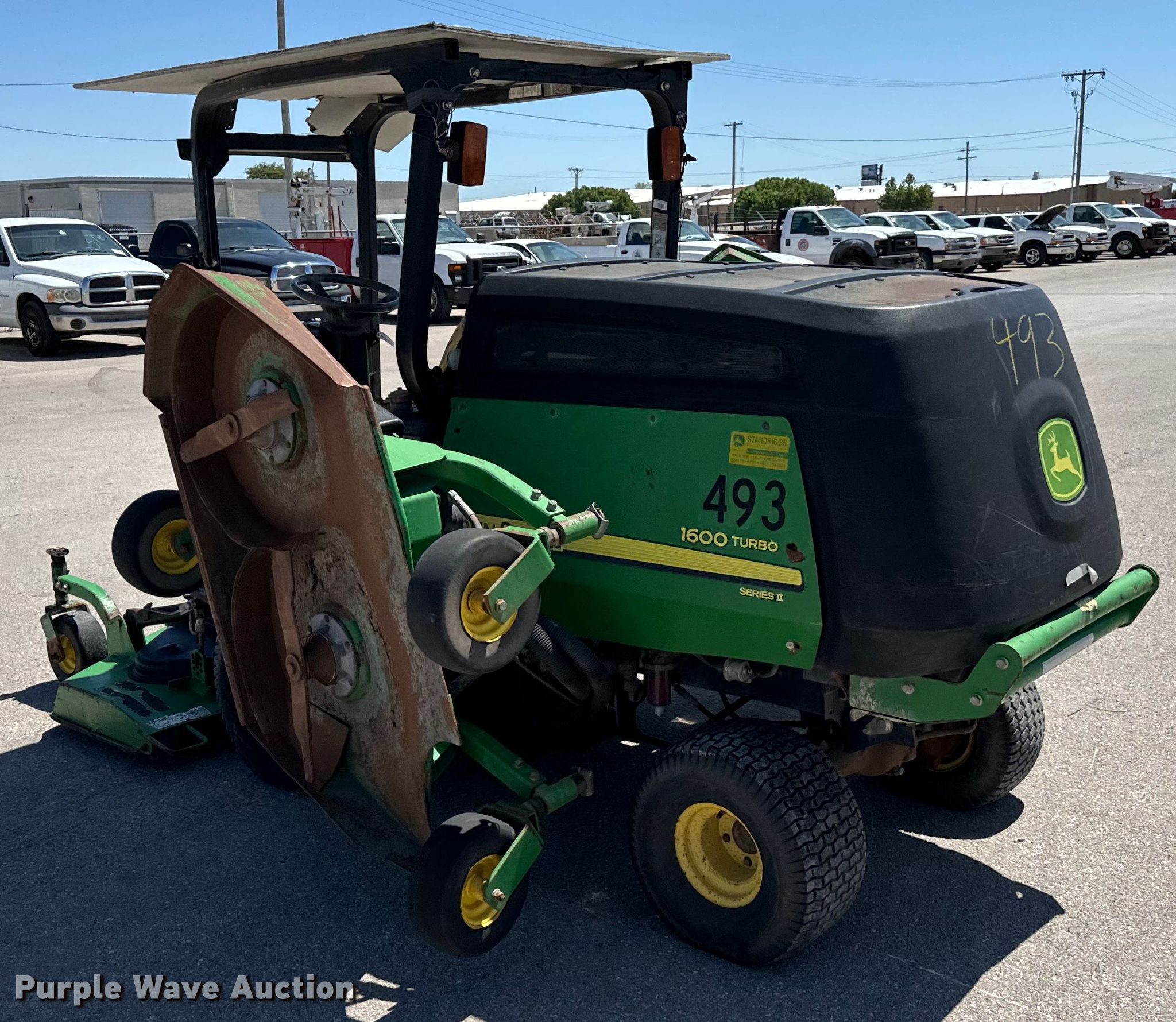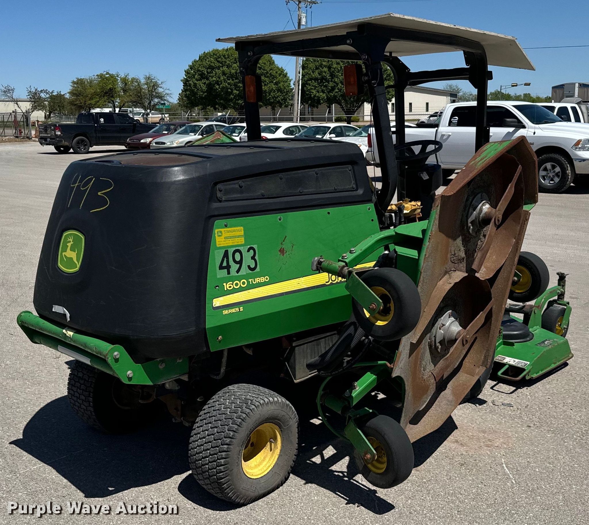 Purple Wave is selling a used Commercial Turf Mower in Oklahoma. This item is a John Deere 1600 Turbo lawn mower with the following: Hours: Unknown, Cutting width: 132", Serial: TC1600T060307, Unit #: 493