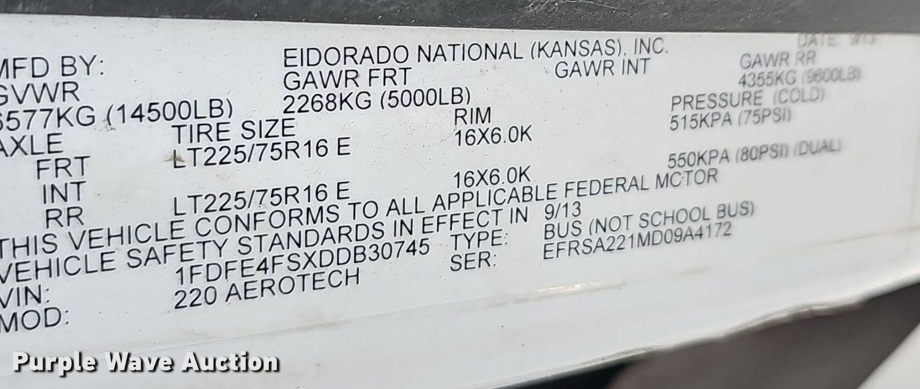 2014 Eldorado National Aerotech Ford 220 shuttle bus. Miles: 196,807 on odometer, VIN: 1FDFE4FSXDDB30745, Unit #: 162. Engine Displacement: 6.8L, Cylinders: 10, Fuel type: Gas. Transmission Automatic. Chassis Axles: Single, Suspension: Spring, Brakes: Hydraulic, GVWR: 14,500 lbs, Wheelbase: 156". Interior AC, heat, Cruise control, Electric passenger sliding door, Passengers: 12, Wheelchair lift. Tires Size: LT225/75R16. Notes Step well will be removed prior to auction, Dead battery. Kansas title. Title distribution may be delayed up to 14 days from verification of funds. Johnson County Transit. Olathe, KS 66061