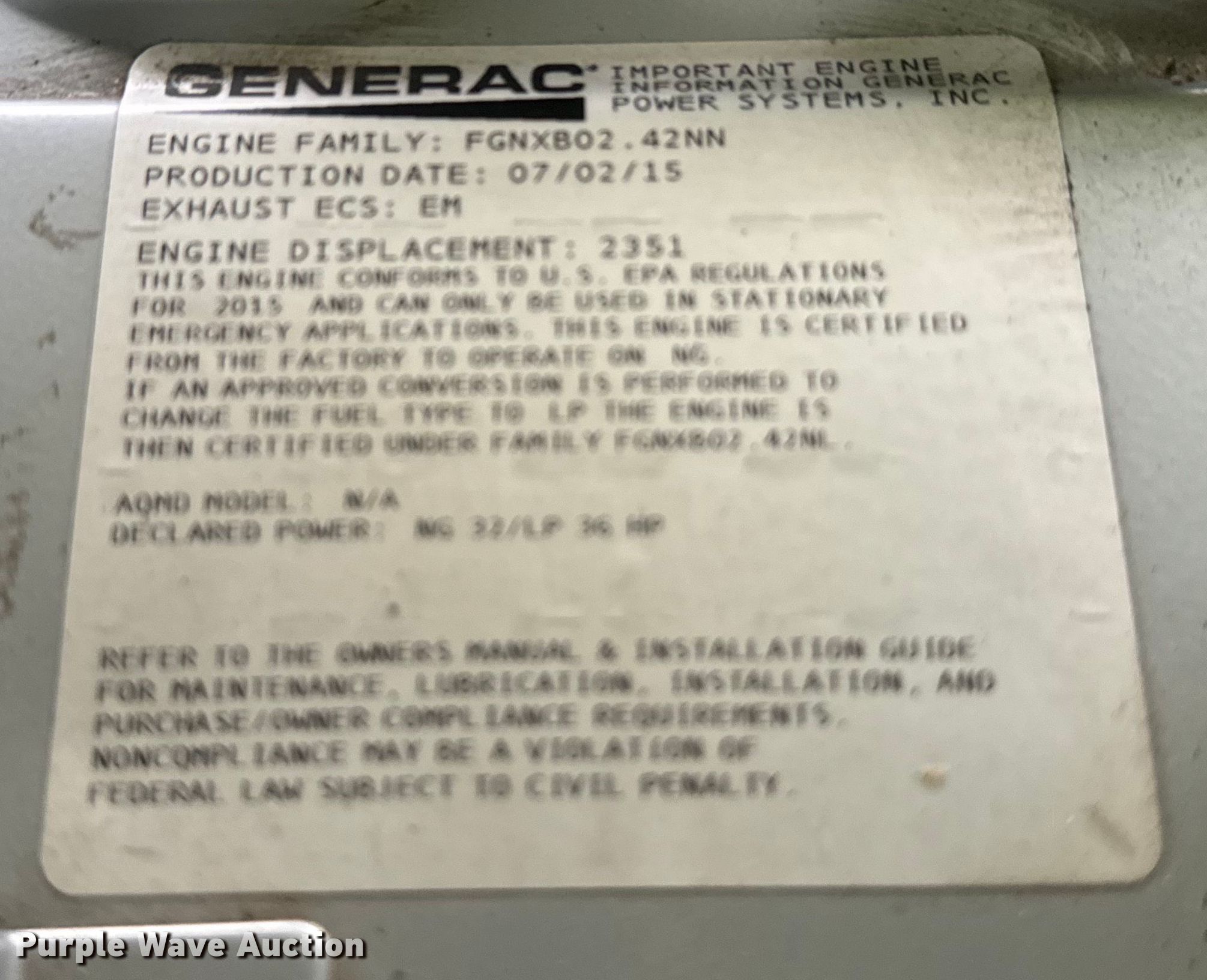 Generac RG02224ANAX generator. Hours: Unknown, Serial: 9795467. Engine Mitsubishi HGNXB02.42NN, Displacement: 2,351 cc, Cylinders: 4, Fuel type: LPG, Natural gas, HP: 36. Features Generator Generac N/A, kVA: 22, kW: 22, Volts: 120/240, Phase: Single, Electric start, Skid mounted. Notes Unknown operating condition. Lower Neches Valley Authority. 10550 Helbig Road. Beaumont, TX 77708