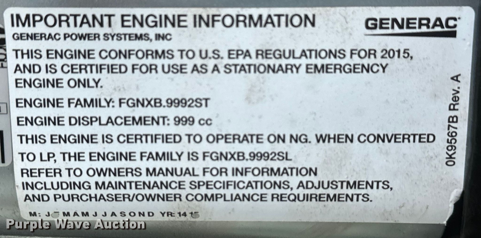 Generac 0067300 generator. Hours: Unknown, Serial: 9498781. Engine Generac 0J9323, Serial: E9178297 15041, Displacement: 999 cc, Fuel type: LPG, Natural gas. Features Generator kW: 20, Volts: 120/240, Phase: Single, Electric start, Skid mounted. Notes Unknown operating condition. Lower Neches Valley Authority. 10550 Helbig Road. Beaumont, TX 77708