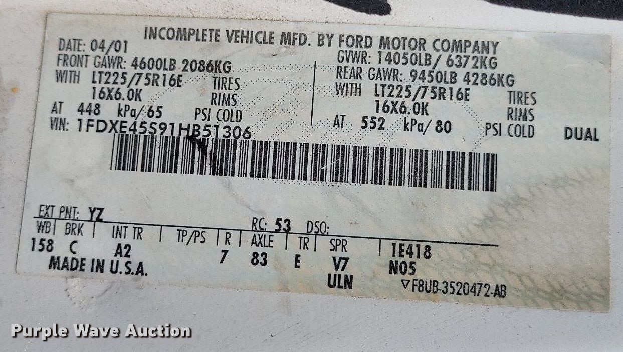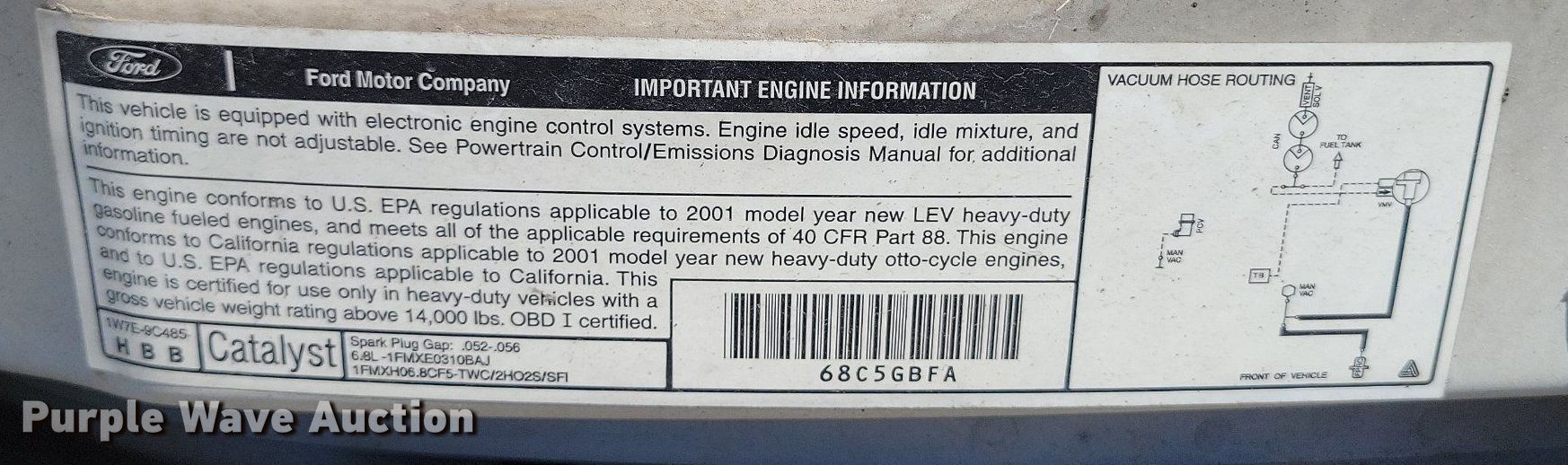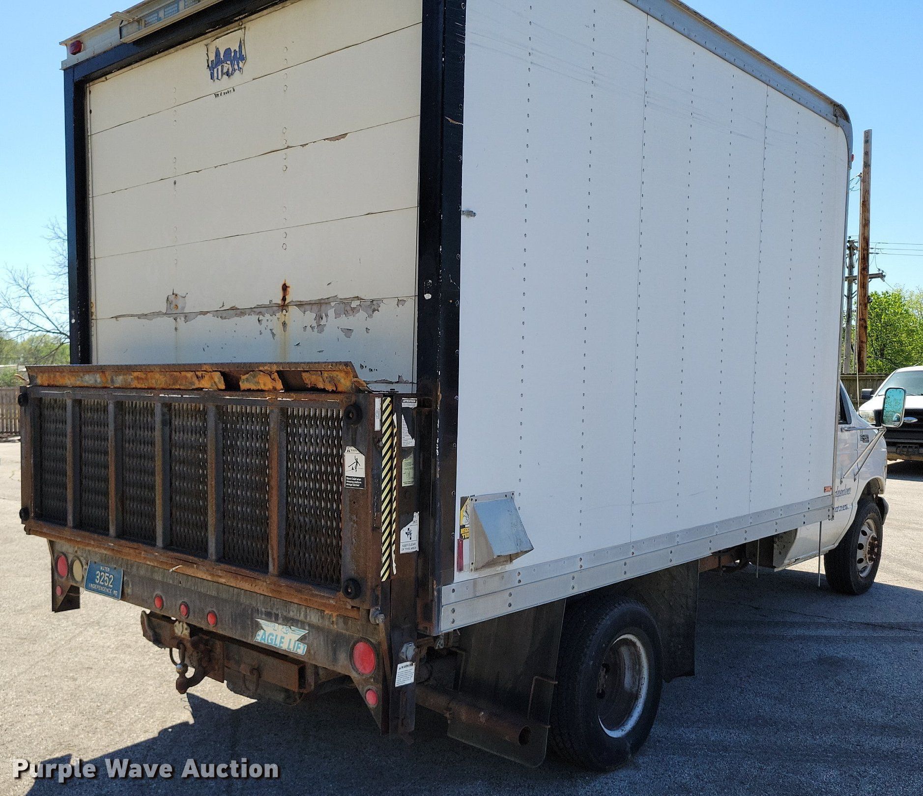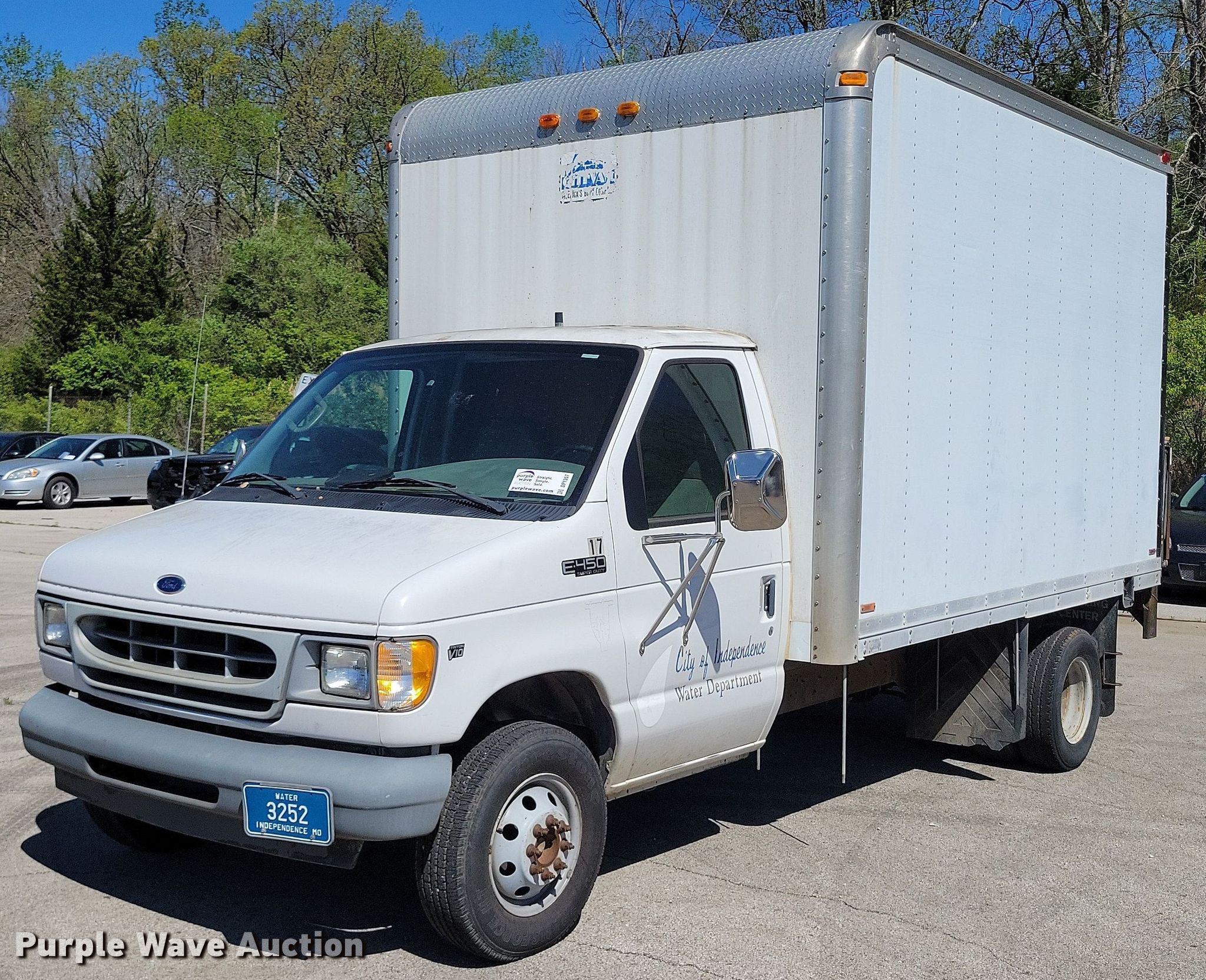 2001 Ford E450 Super Duty box truck. Miles: 85,633 on odometer, VIN: 1FDXE45S91HB51306, Unit #: 3253. Engine Displacement: 6.8L, Cylinders: 10, Fuel type: Gas. Transmission Automatic. Chassis Axles: Single, Suspension: Spring, Brakes: Hydraulic, GVWR: 14,050 lbs, Wheelbase: 158". Interior AC, heat. Features Box bed 12' L x 96" W x 90" H, End gate lift Eagle lift.. Tires Size: 225/75R16. Notes Exhaust leak, manifold studs broken. Missouri title. Title distribution may be delayed up to 14 days from verification of funds. City of Independence, MO. Independence, MO 64056