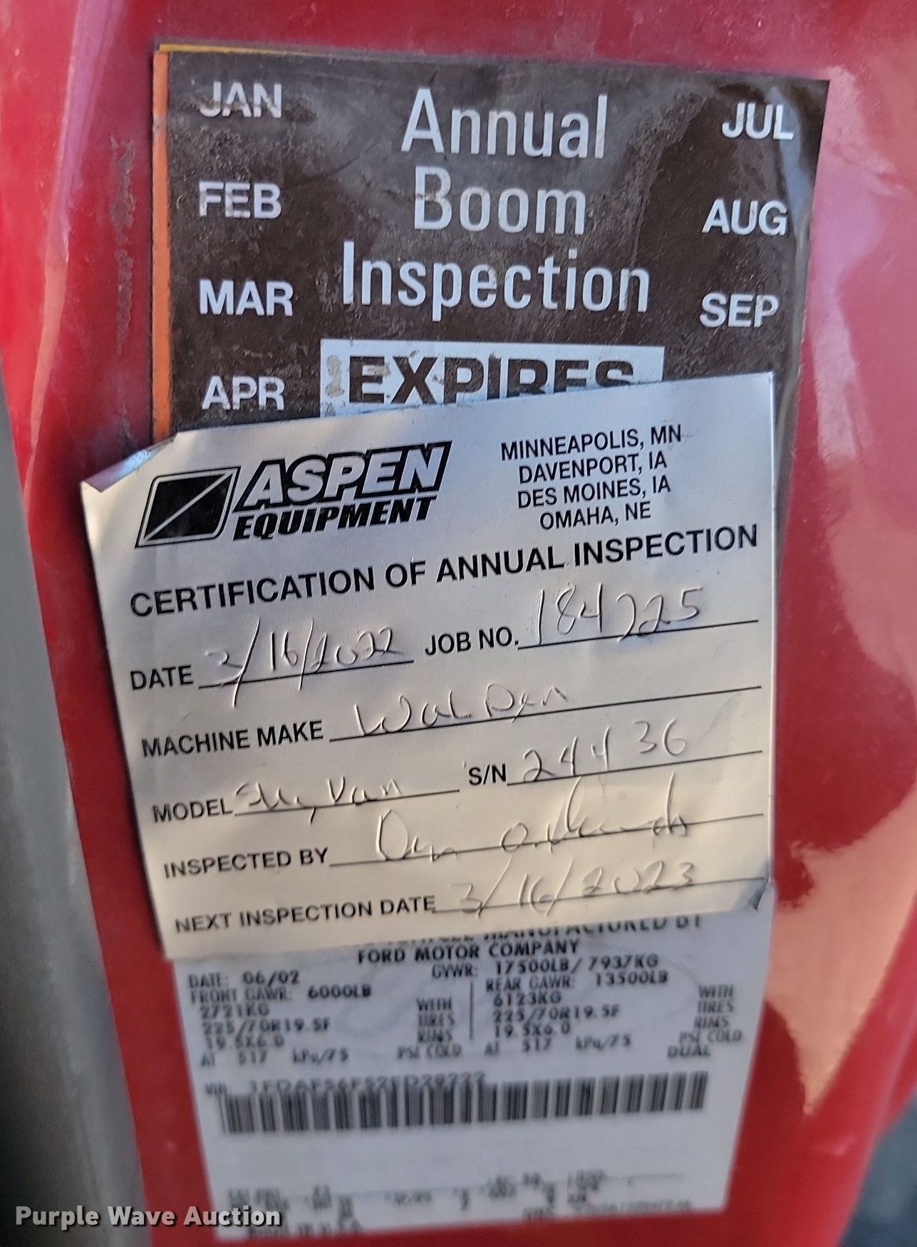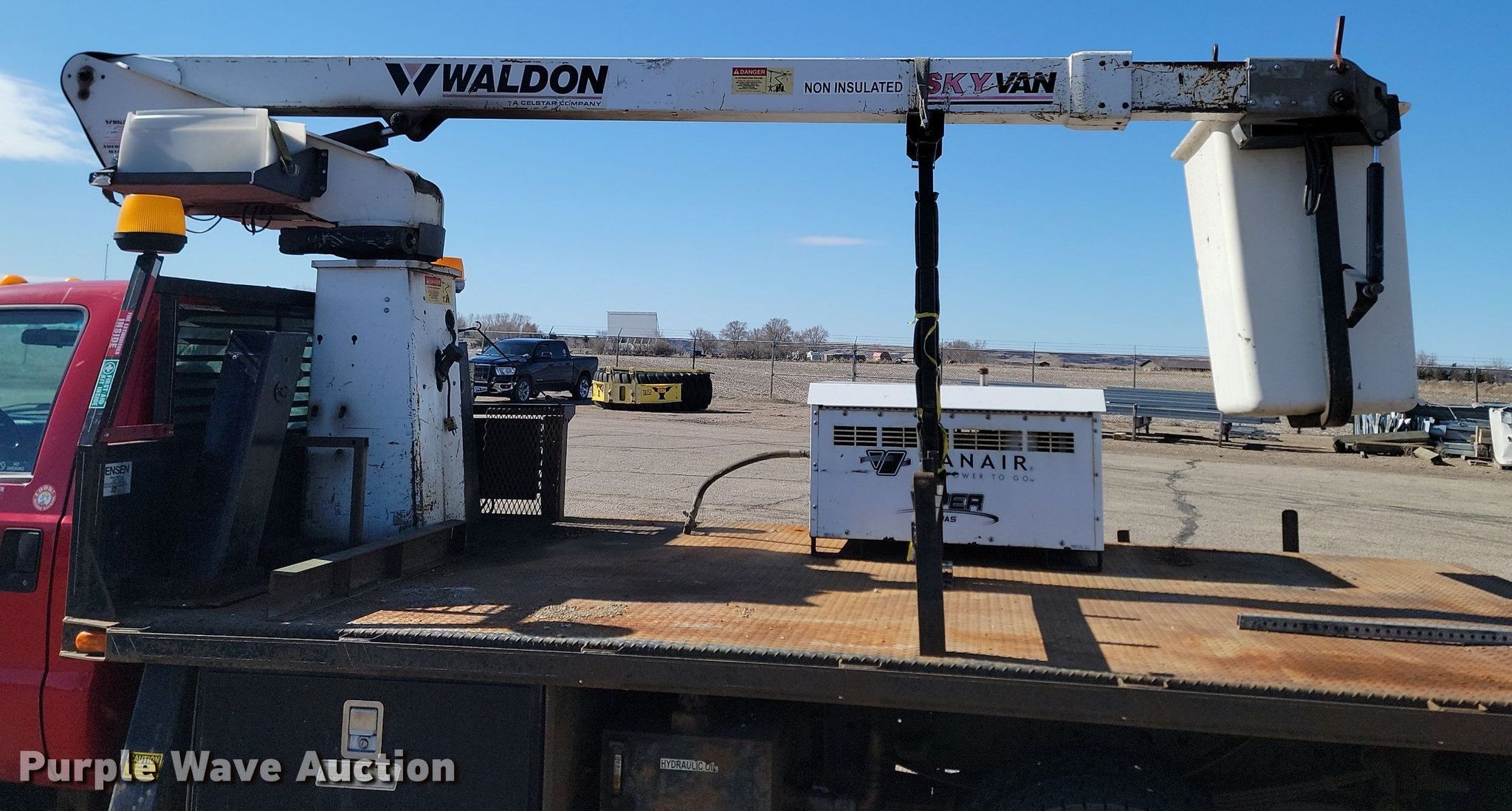 2002 Ford F550 Super Duty XL bucket truck. Miles: 132,067 on odometer, VIN: 1FDAF56F52ED28222, Unit #: DB210, NC050, MP311. Engine Ford, Displacement: 7.3L V8 OHV, Cylinders: 8, Fuel type: Diesel. Transmission Automatic. Chassis Axles: Single, Suspension: Spring, Brakes: Hydraulic, PTO. Interior AC, Heat, Cruise control, Brake controller. Features Bed 14' L x 96" W, Boom Waldon VSW 35 FH, Maximum lift capacity: 300 lbs, Maximum lift height: 30', Boom type: Telescopic, Boom controls Ground, Platform/ basket, Viper Vanair Air Compressor. Tires Size: 225/70R19.5. Notes Front end noise Bushings may need replaced, Tie rod ends may need replaced, Bucket control issues, works intermittently. South Dakota title. State of South Dakota Bureau of Administration. Mobridge, SD 57601