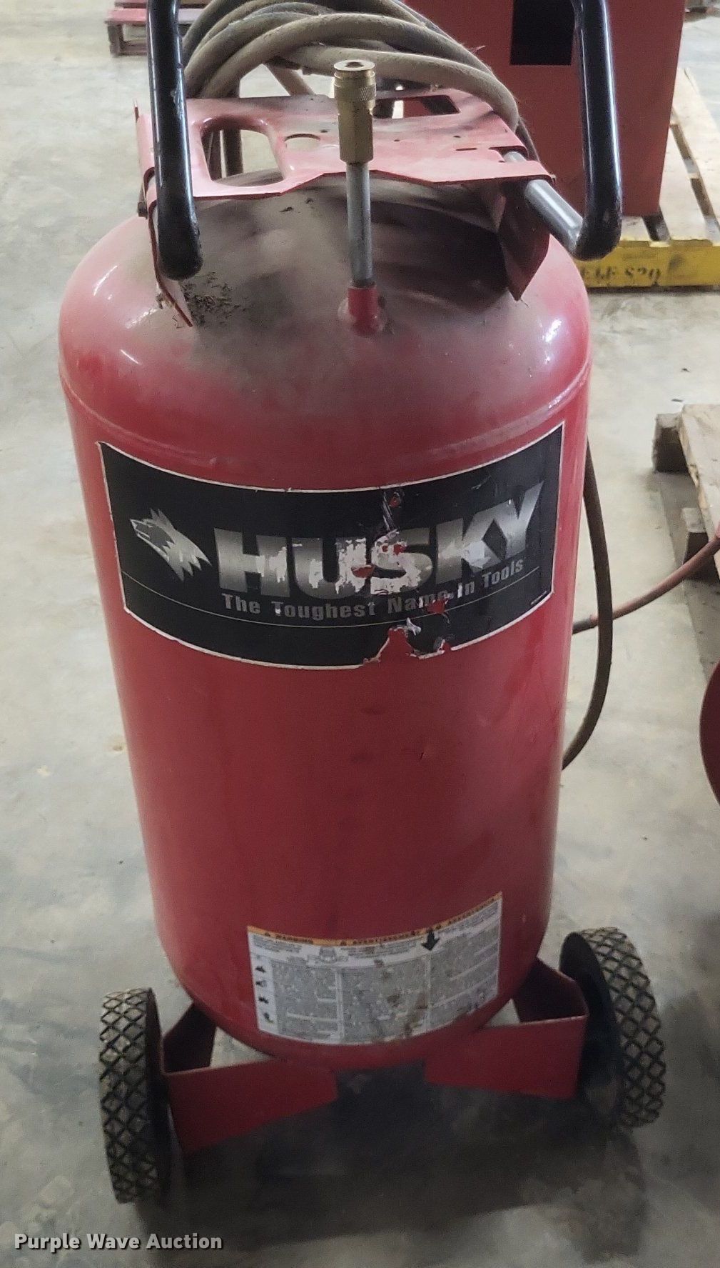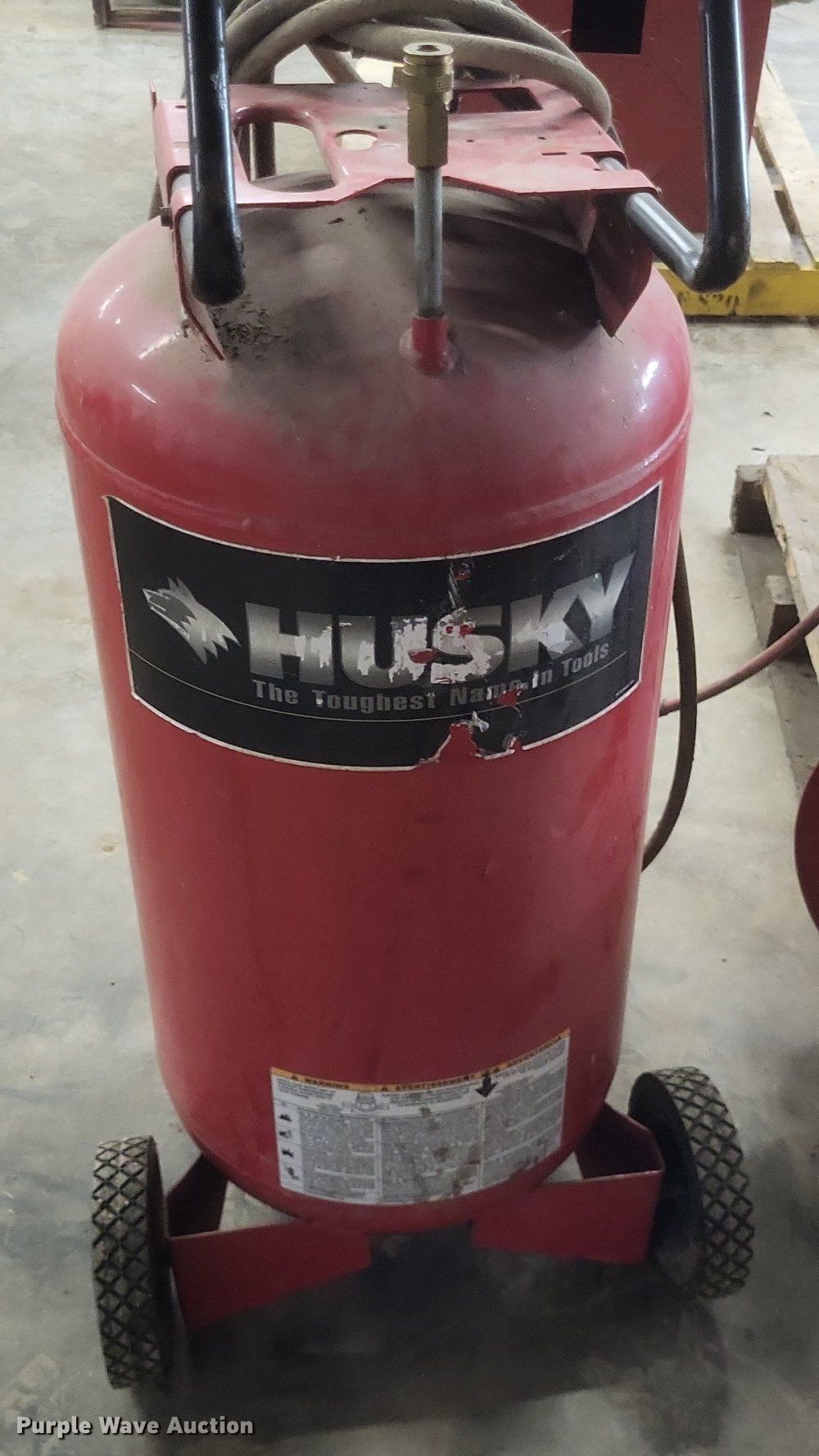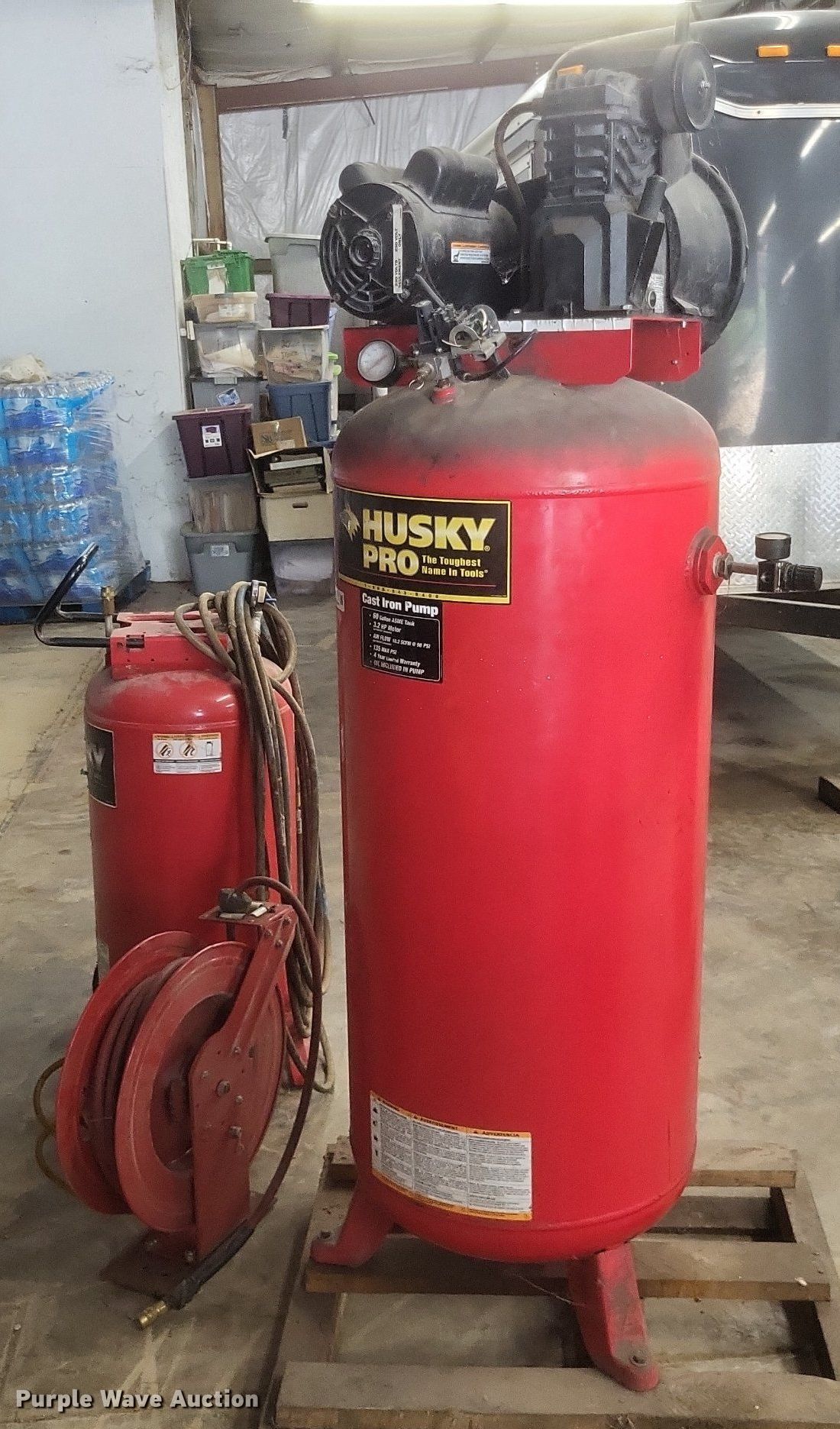 Purple Wave is selling a used Air Compressor in Missouri. This item is a Husky VT631403AJ air compressor with the following: Serial: 60809, Capacity: 60 gallon, HP 3.2, Max PSI: 135, Hose reel with air hose, Portable air tank with hose