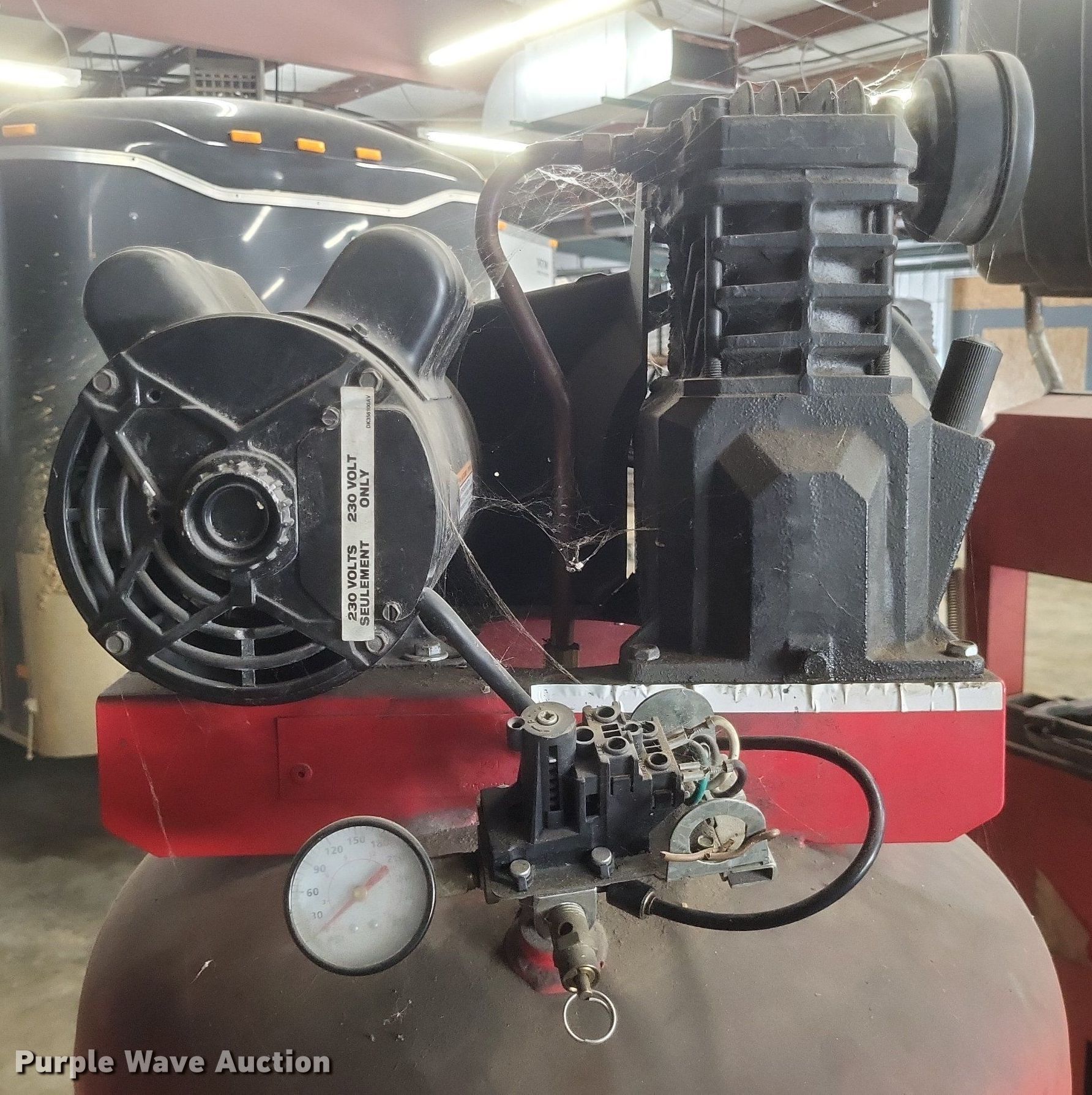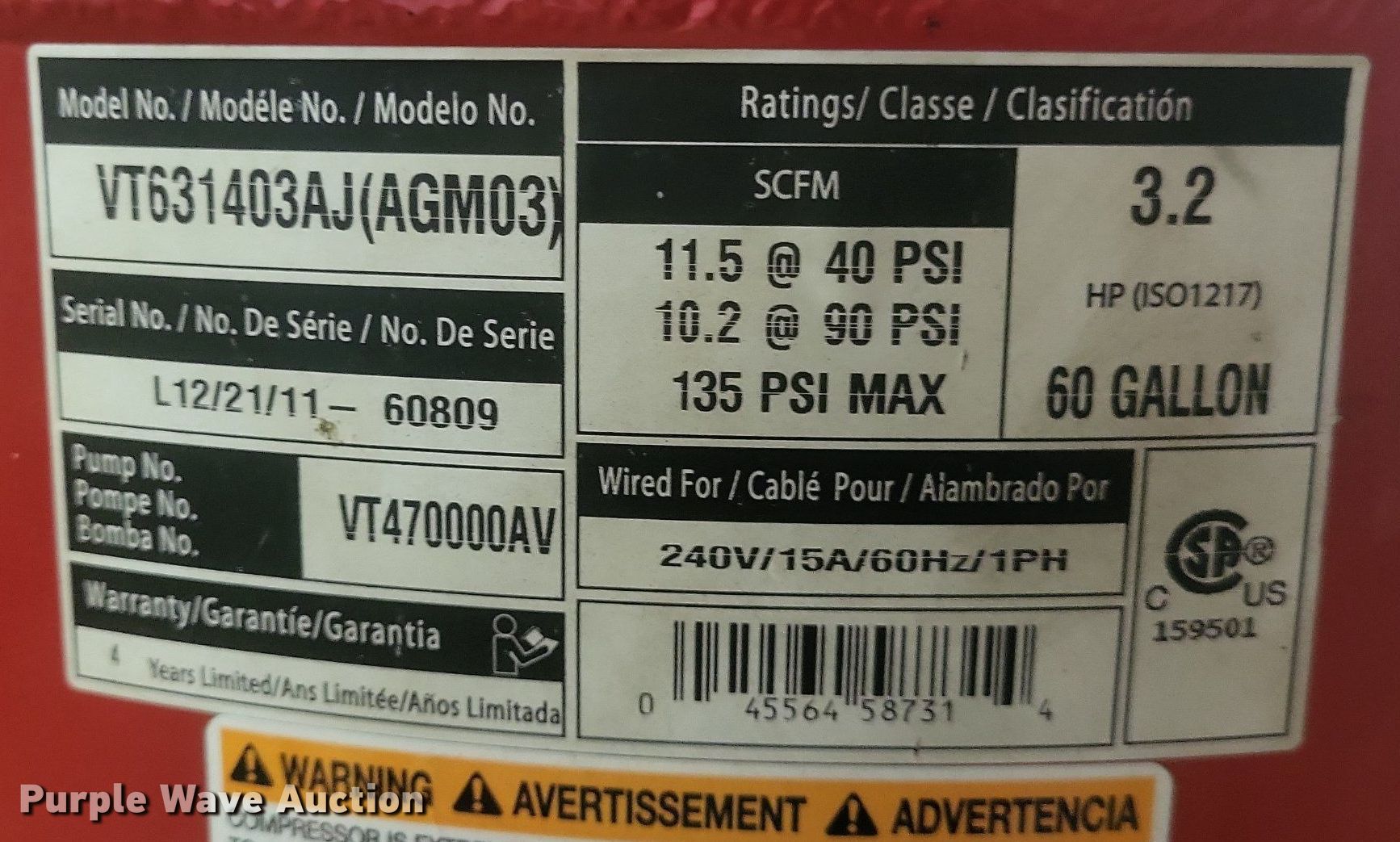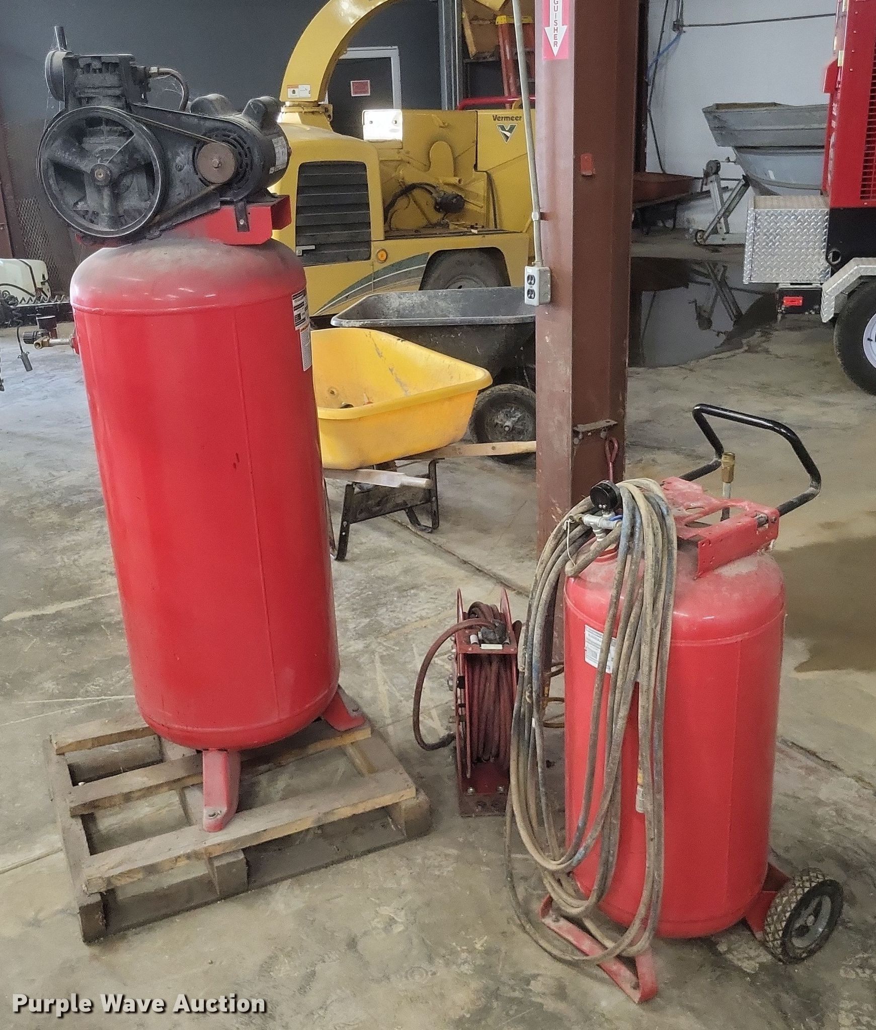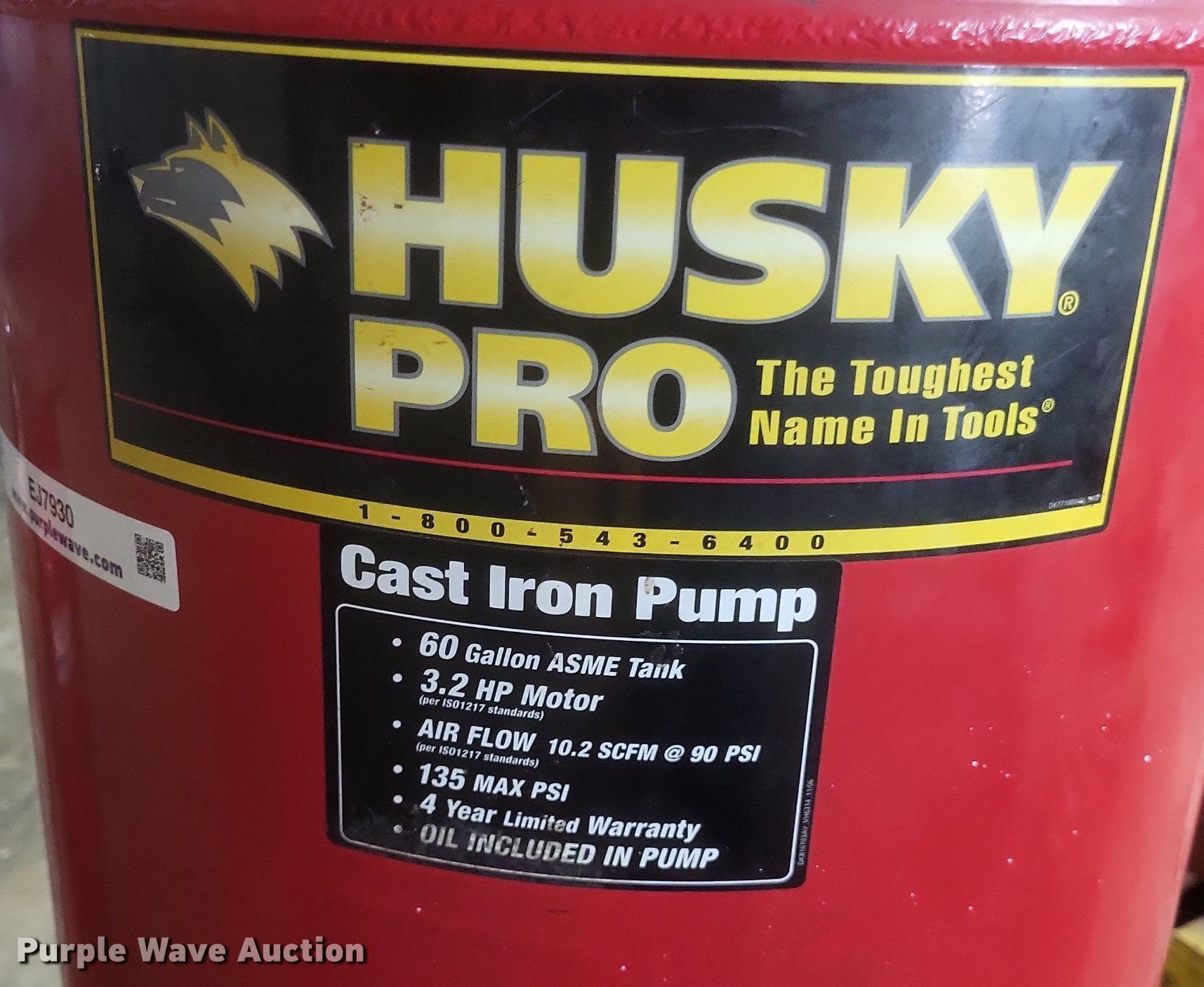 Purple Wave is selling a used Air Compressor in Missouri. This item is a Husky VT631403AJ air compressor with the following: Serial: 60809, Capacity: 60 gallon, HP 3.2, Max PSI: 135, Hose reel with air hose, Portable air tank with hose
