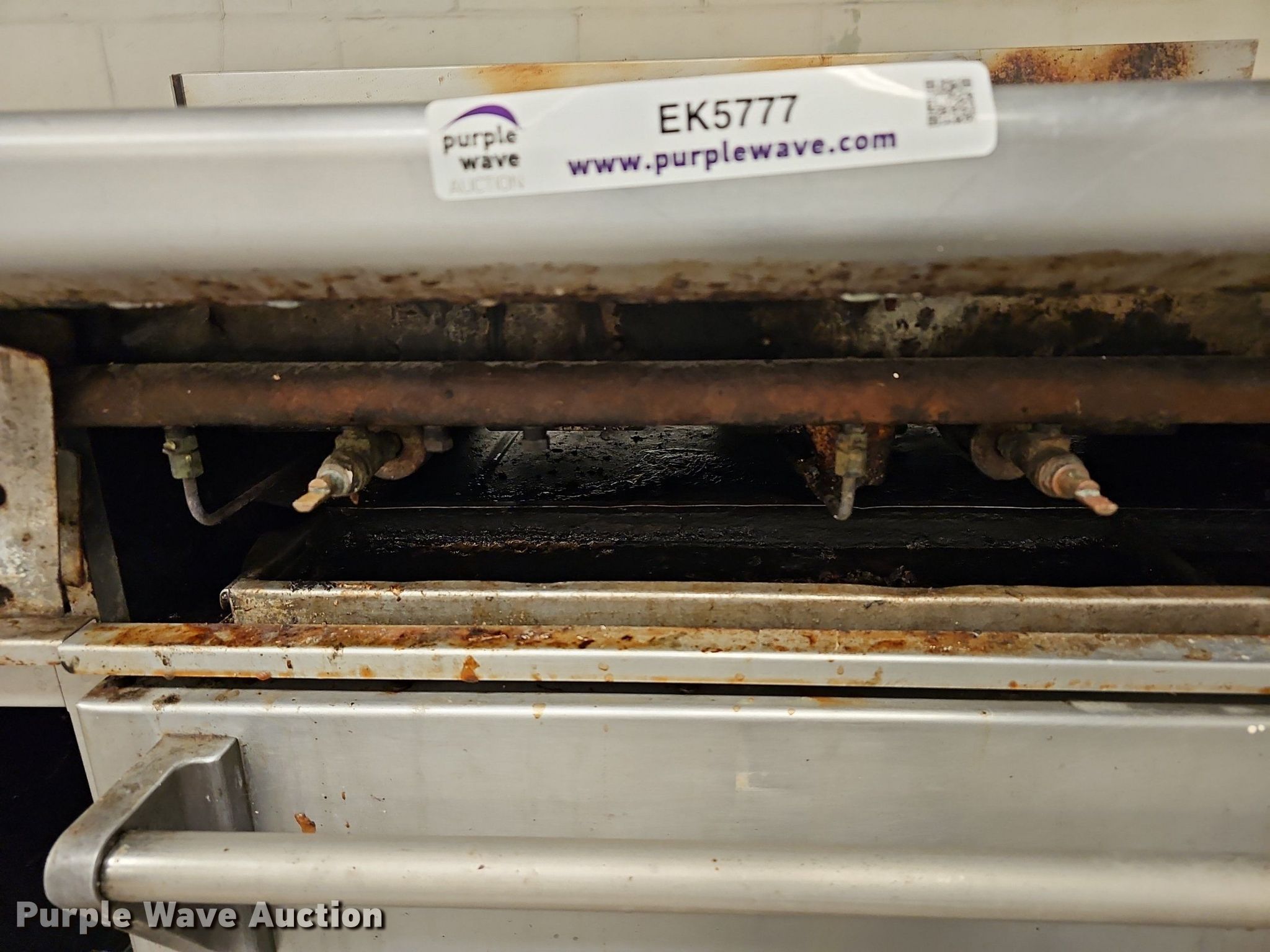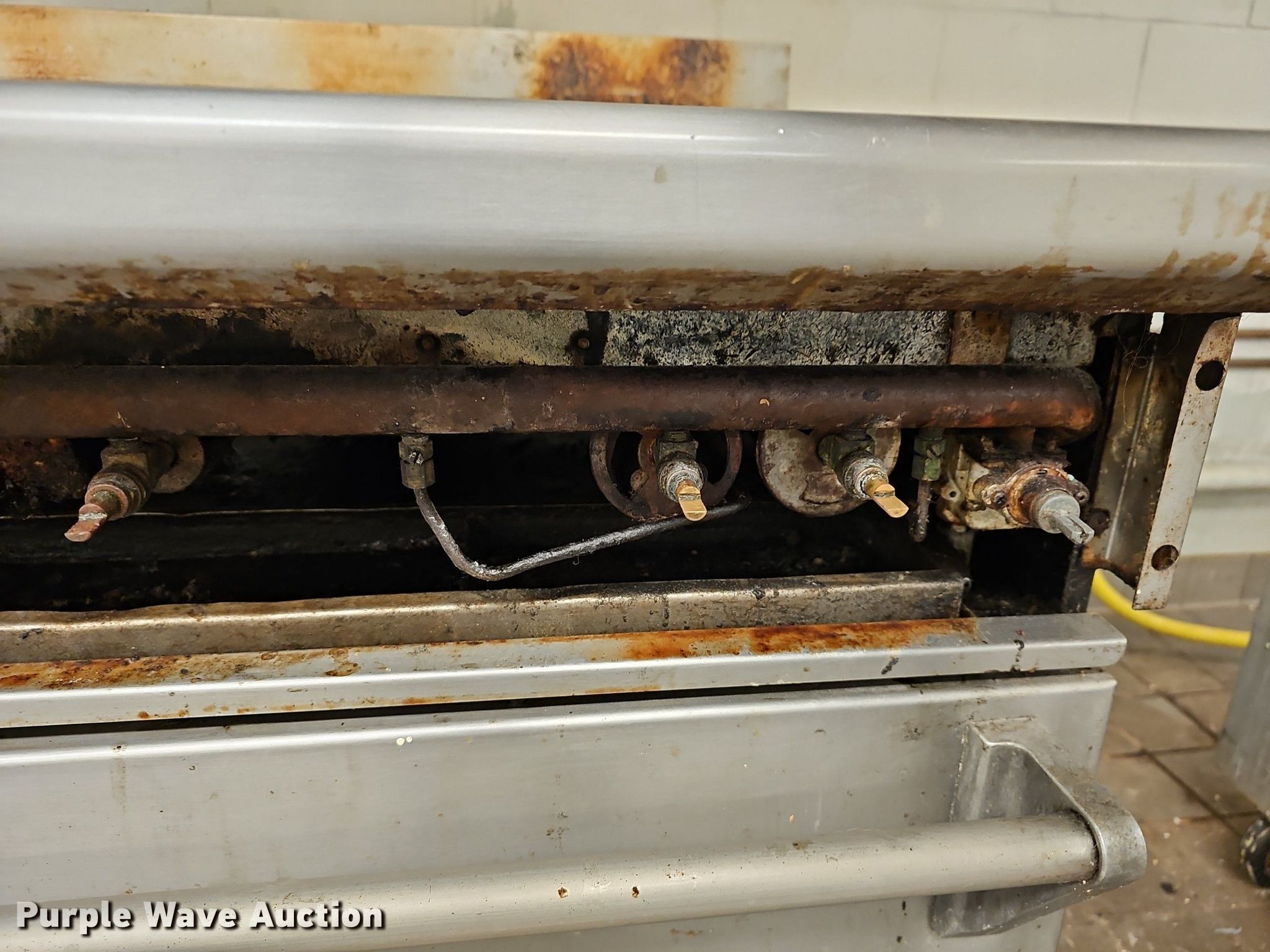 Purple Wave is selling a used Restaurant Equip. in Kansas. This item is a Wolf griddle with the following: Dimensions, 45" x 34" x 42", (2) burners, Oven, Missing knobs