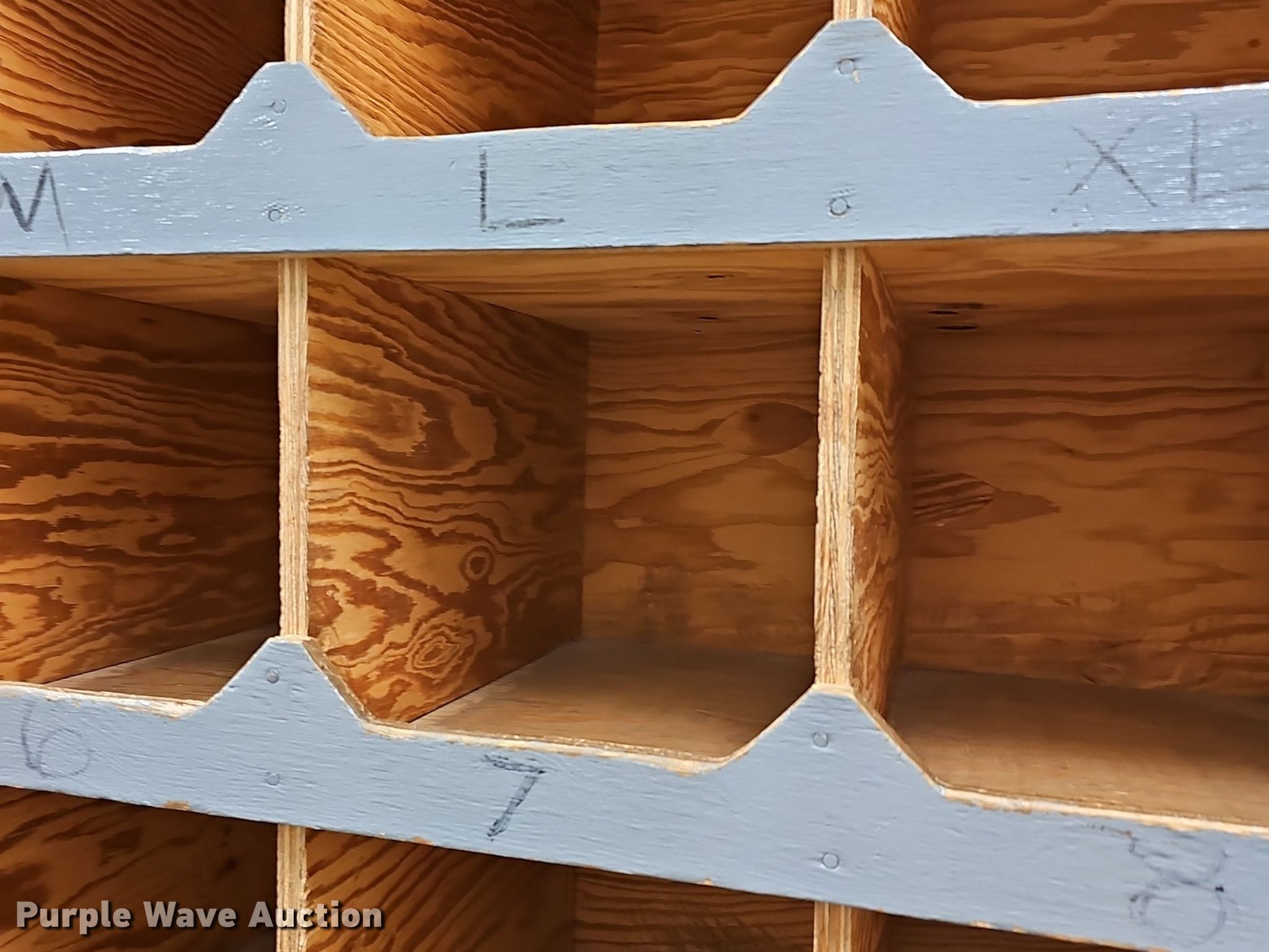 Purple Wave is selling a used Furniture in Kansas. This item is a Wood cubby with the following: Dimensions: 98" x 20" x 78", (42) cubbies