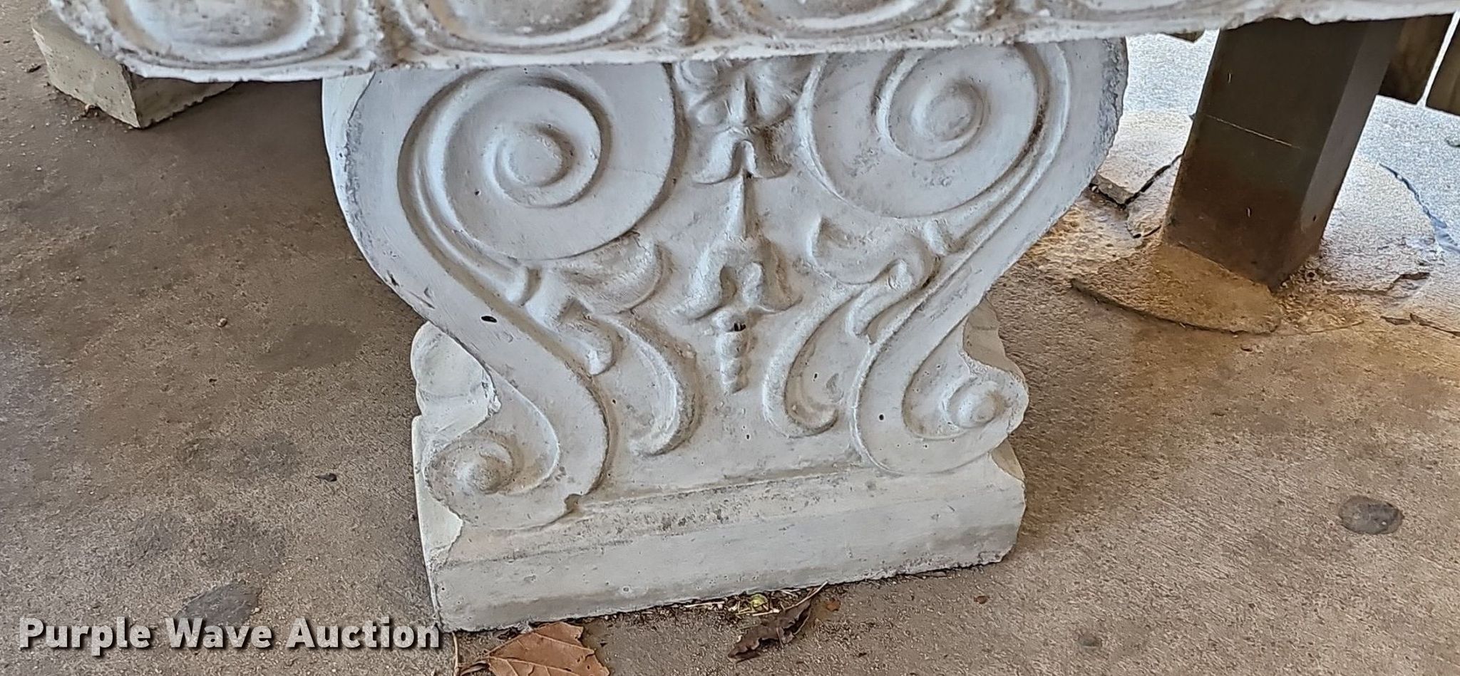 Purple Wave is selling a used Furniture in Kansas. This item is a Patio furniture with the following: Wood bench, Concrete table, (3) concrete benches