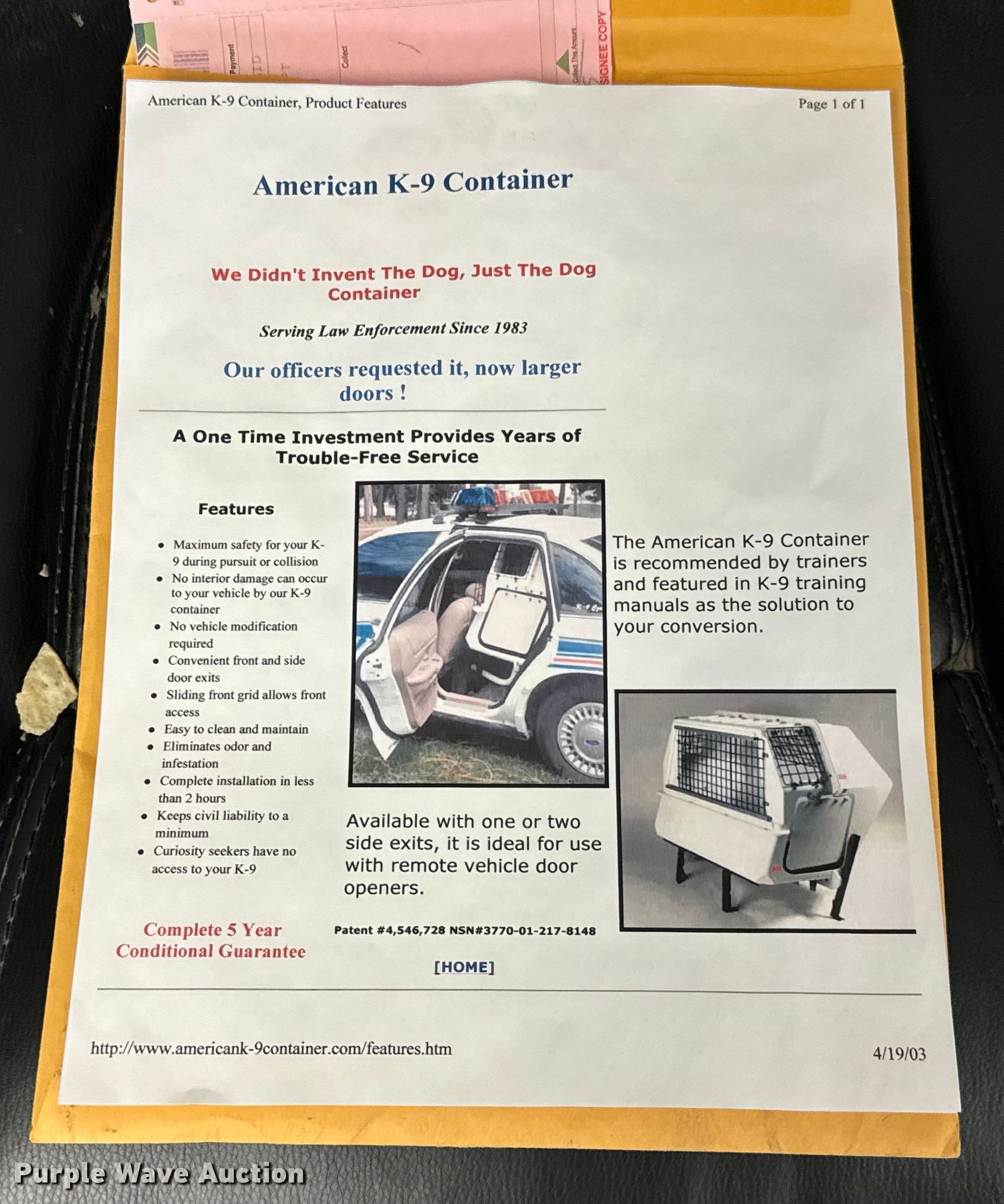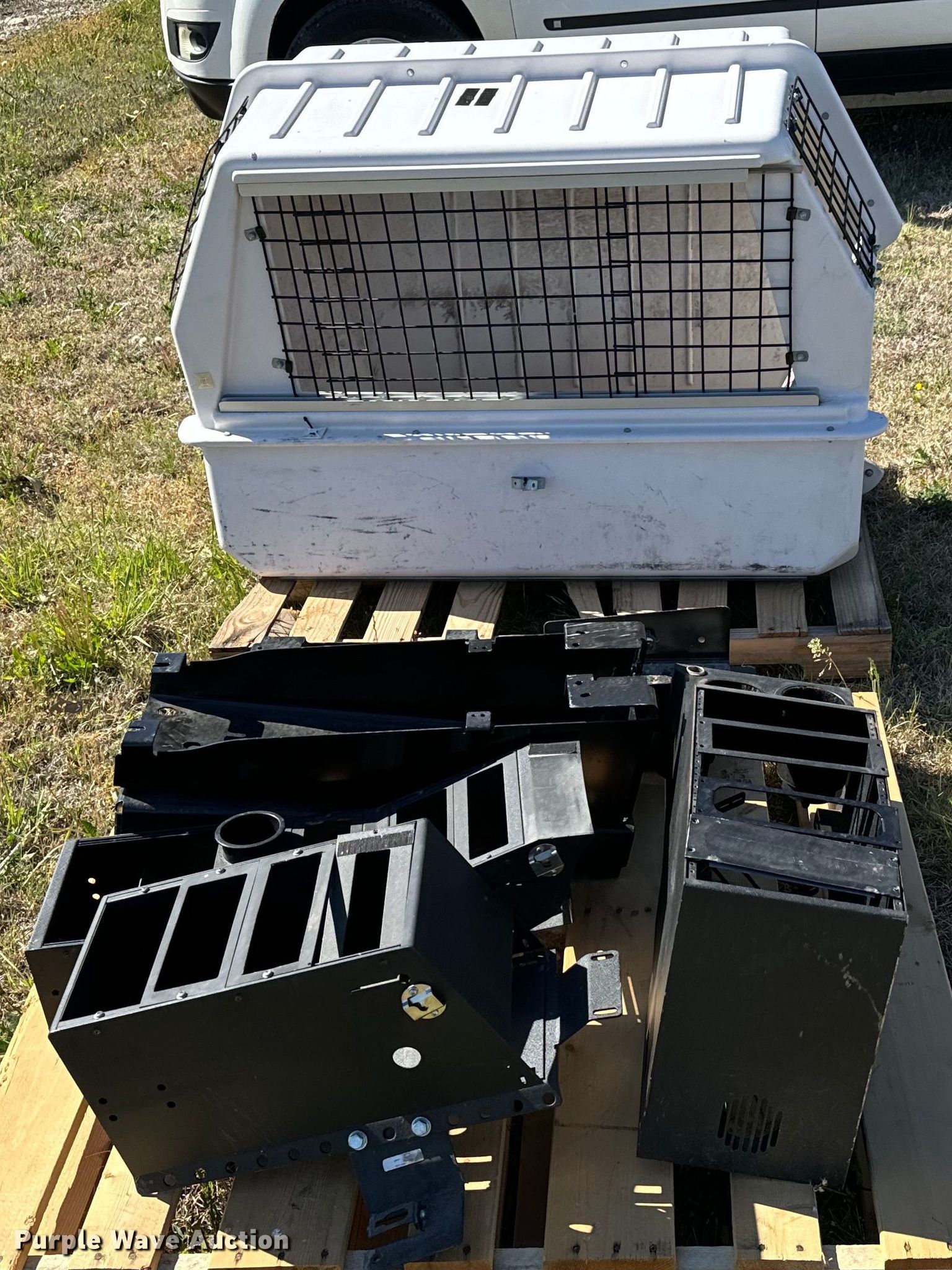 Purple Wave is selling a used Automotive Parts or Acces. in Kansas. This item is a Law enforcement equipment with the following: American K-9 Container, Consoles
