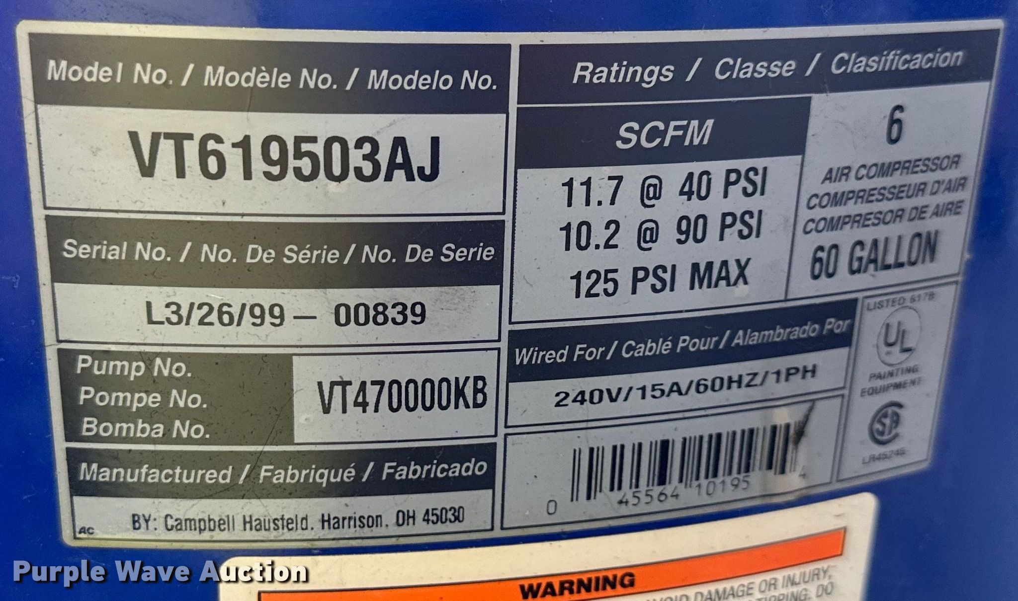 Purple Wave is selling a used Air Compressor in Kansas. This item is a Campbell Hausfeld air compressor with the following: PSI: 125
