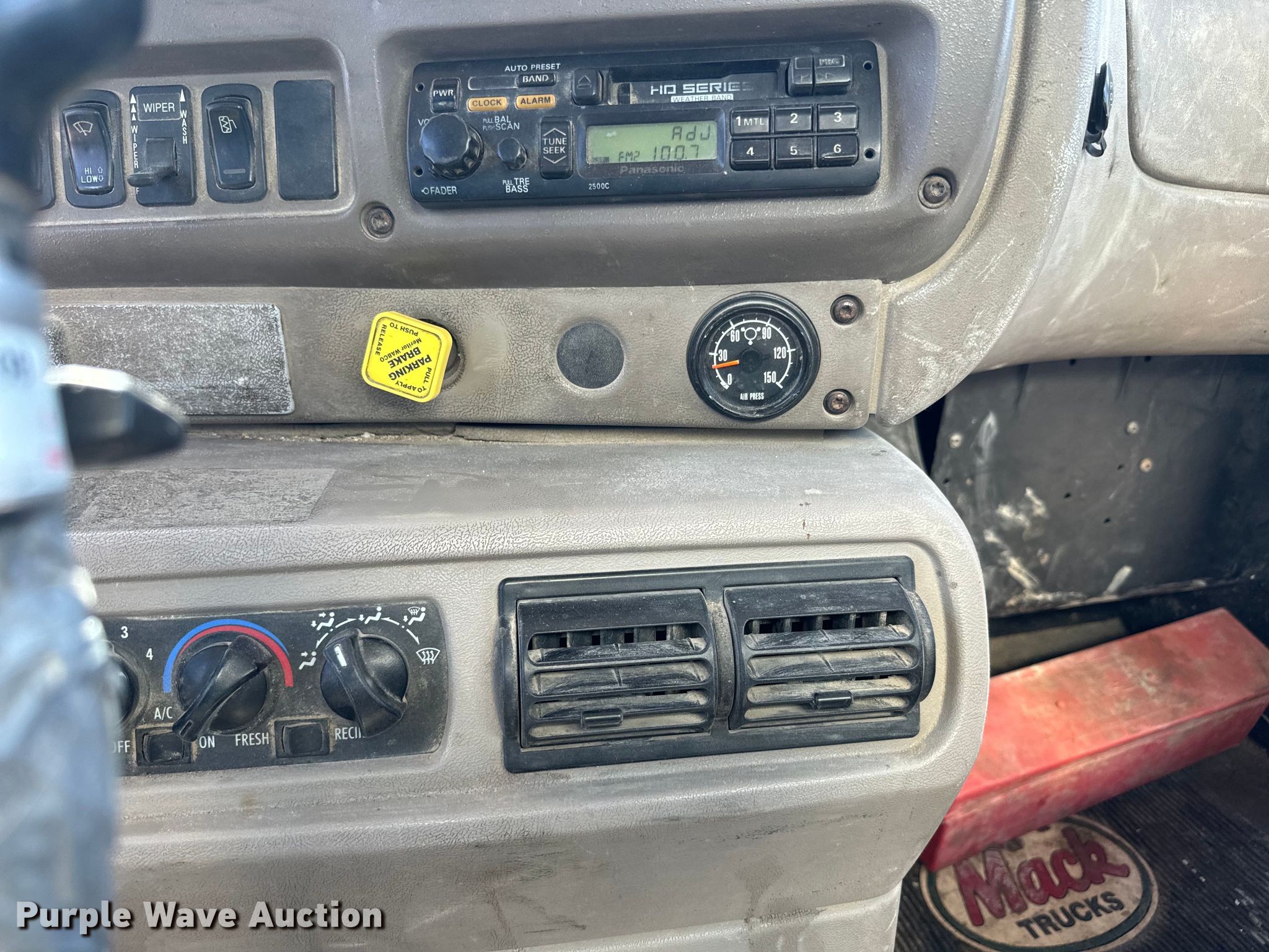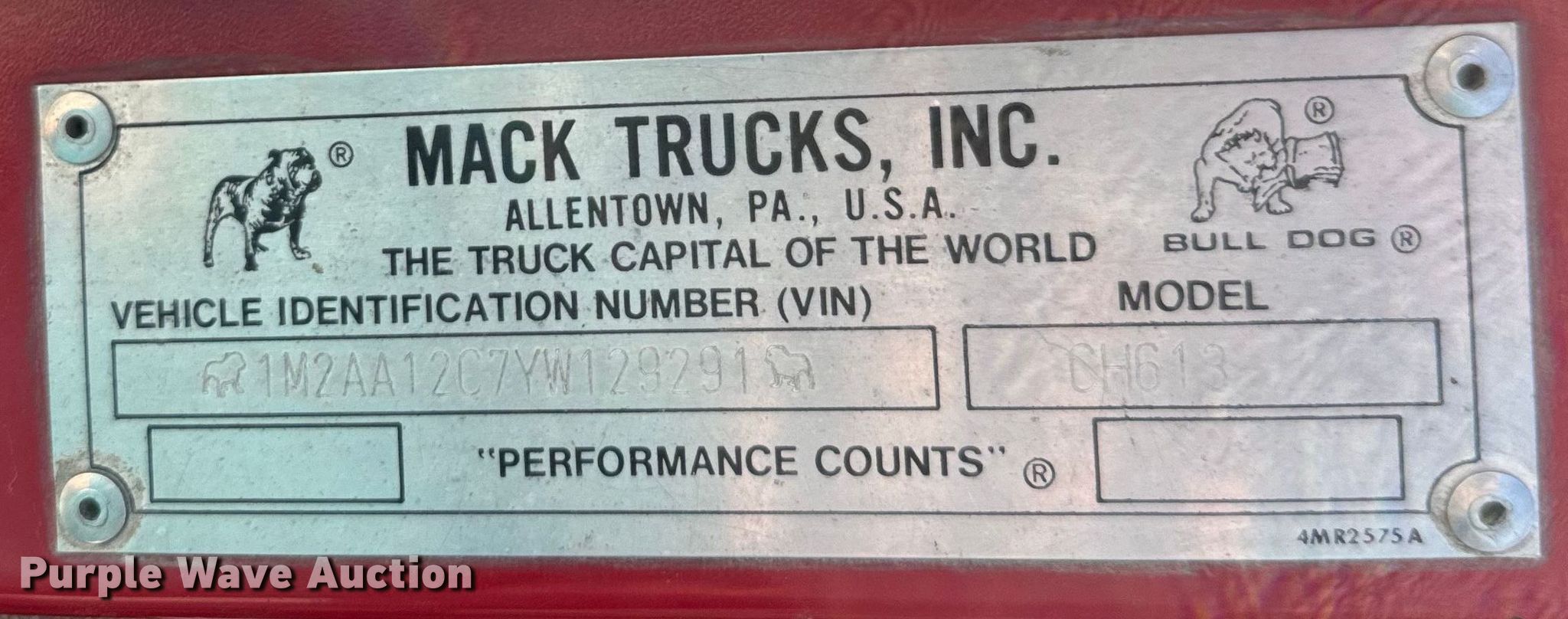 2000 Mack CH613 feed delivery truck. Miles: 586,573 on odometer, Hours: 38,637 on meter, VIN: 1M2AA12C7YW129291. Engine Mack, Displacement: 12.0L, Cylinders: 6, Fuel type: Diesel. Transmission Manual. Chassis Double frame, Axles: Tandem, Suspension: Air Dump valve, Brakes: Air, PTO. Interior AC, Heat, Heated mirrors, Cruise control. Features Delivery bed Warren, 20' L, Compartments: 5, Discharge auger Diameter: 20", Length: 25', Rear.. Tires Front: 315/80R22.5, Rear: 11R22.5. Notes Hood hinge broken, will not open Hood not attached, Transmission shifter broken, Windshield chipped or cracked, Dead battery. Missouri title. Title distribution may be delayed up to 14 days from verification of funds. Lawson, MO 64062