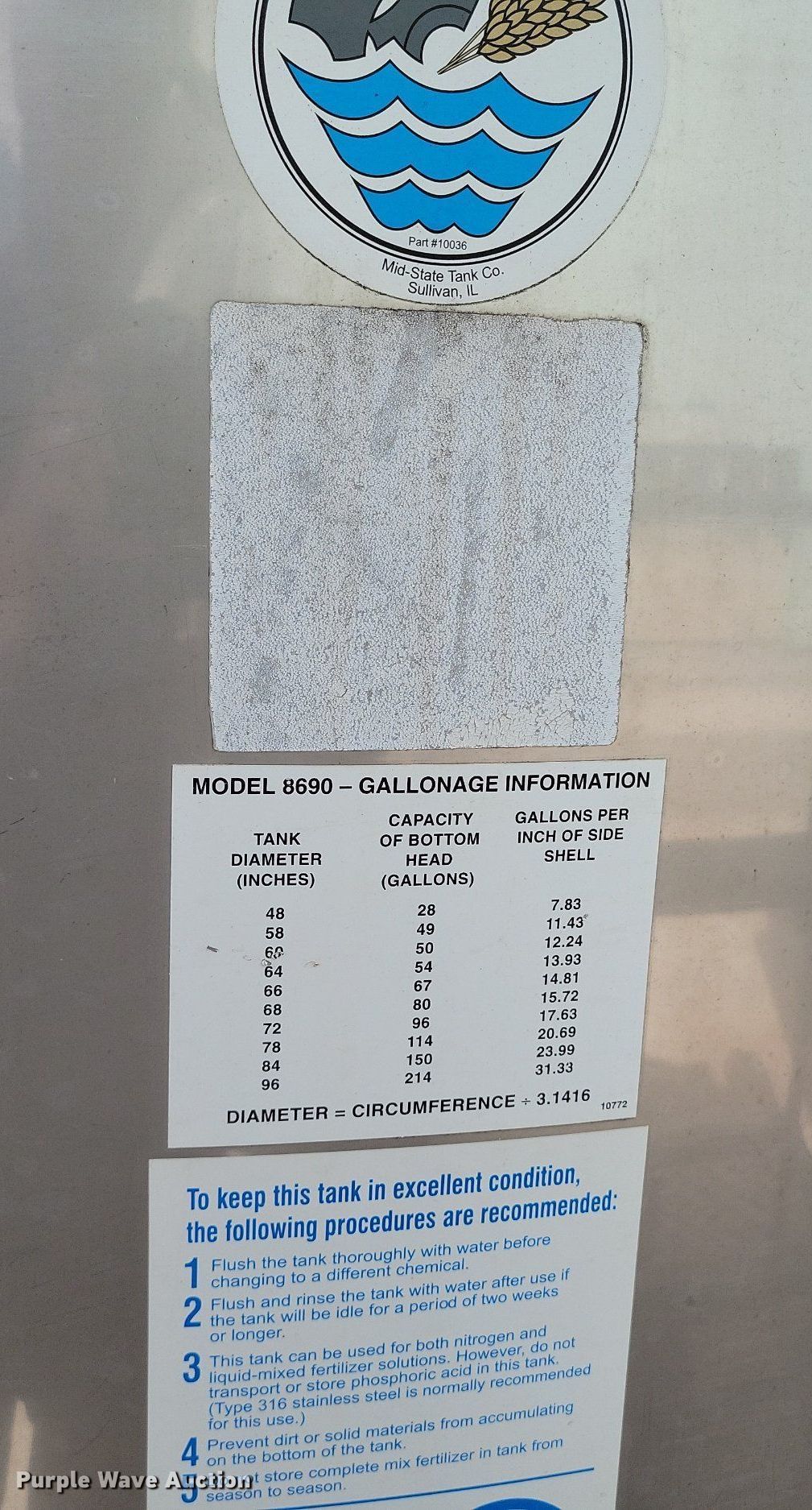 (3) tanks. Sii tank Capacity: Approx. 3,000 gallons, Diameter: 92", Height with stand: 12', Sii tank Capacity: Approx. 3,000 gallons, Diameter: 86", Height with stand: 15', Mid State Tank Co stainless tank Capacity: 2,400 gallons, Dimensions: 84", Height with stand: 12'. Lawson, MO 64062