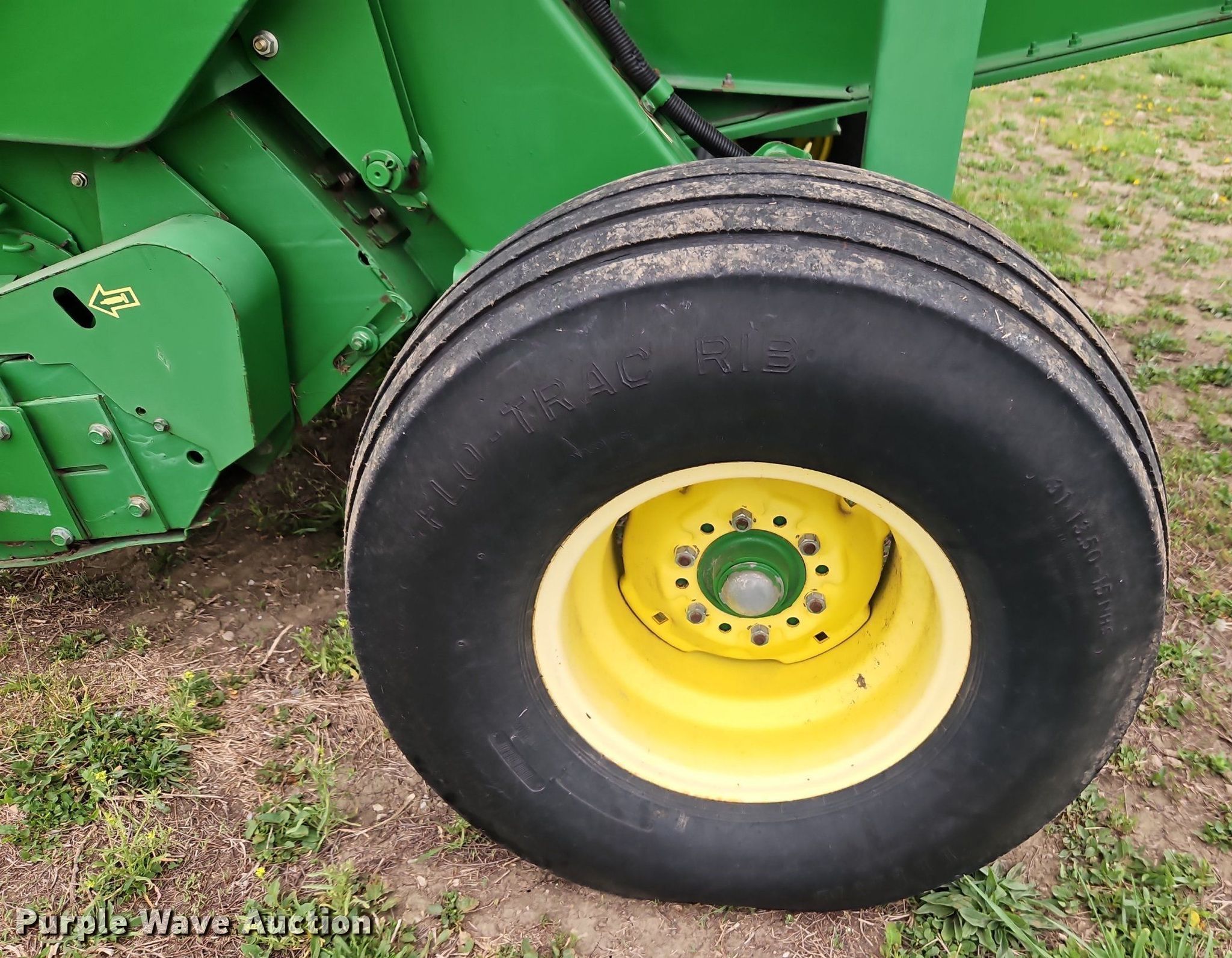 2002 John Deere 567 round baler. Bale count: 4,917, Serial: E00567X187660. Features PTO: 540, 1000, Monitor John Deere, Transport lights, Feed assist roller, Gauge wheels Size: 4.80-8/3.75, Pickup width: 6' 6", Bale size: 5'x6', Twin twine tie, Net-wrap, Bale kicker. Tires Size: 31/13.50-15. Belton, MO 64012