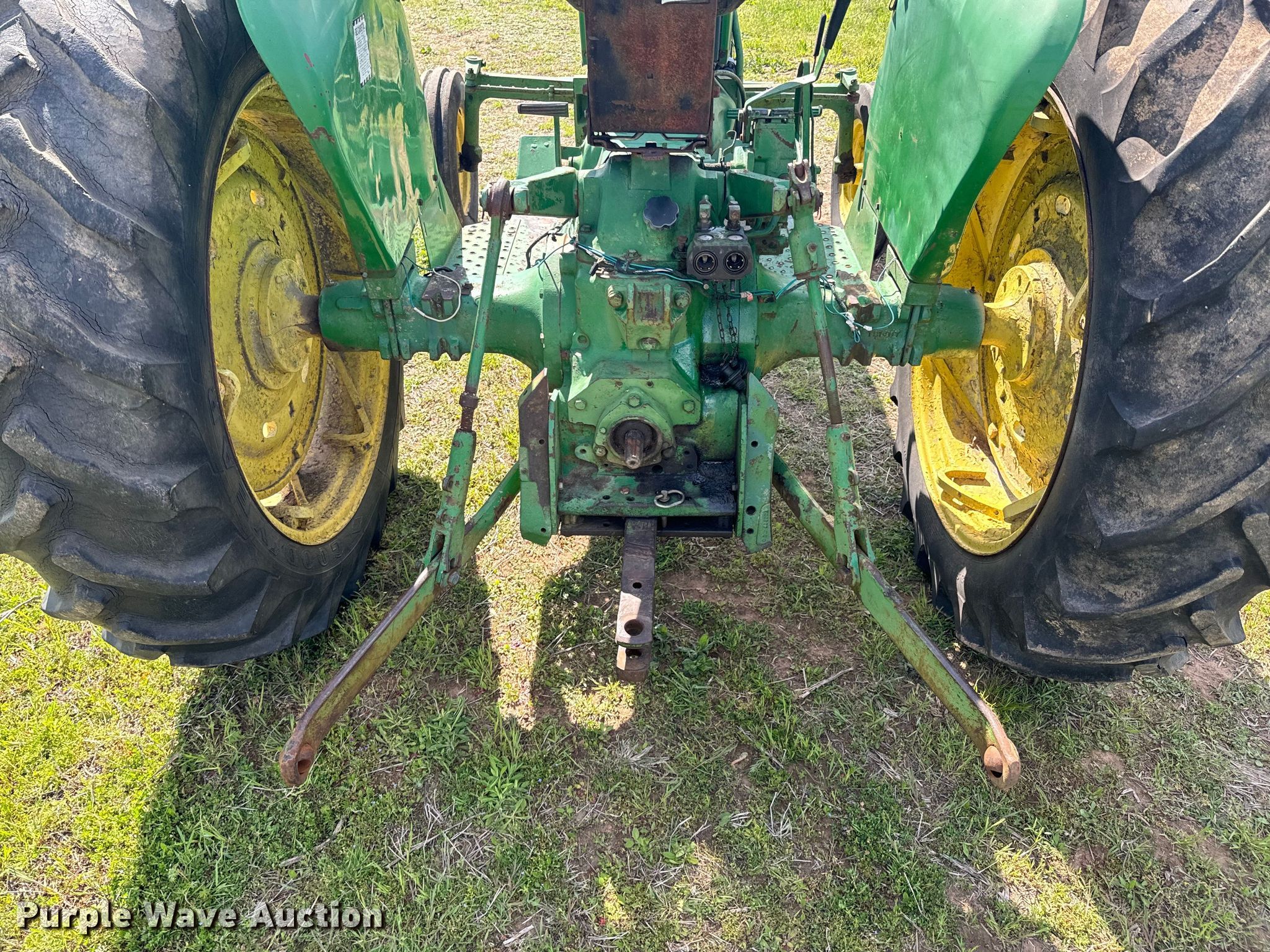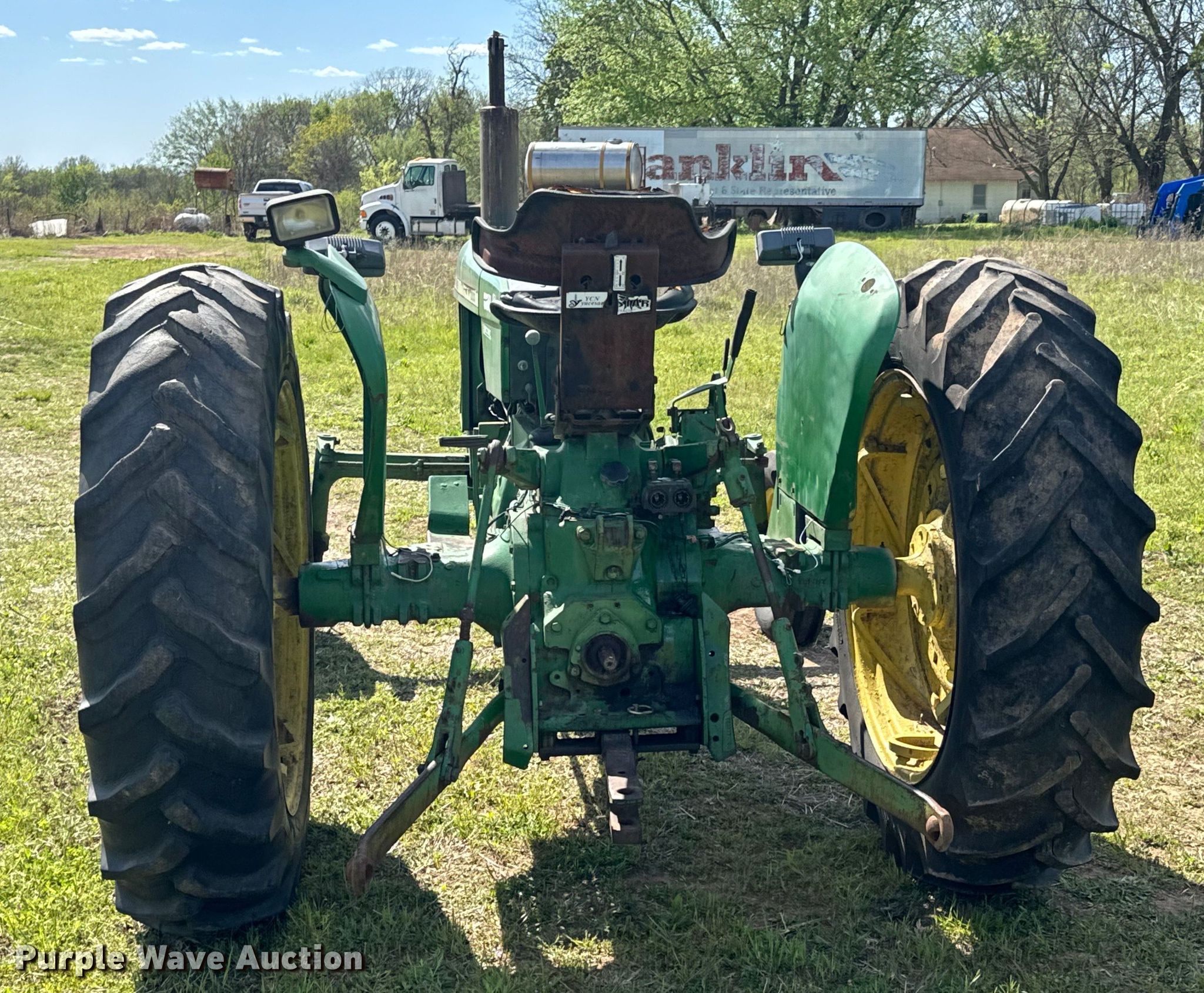 1969 John Deere 2020 tractor. Hours: 2,597 on meter, Serial: 0947991. Engine Cylinders: 4, Fuel type: Diesel. Transmission Manual, 8F - 4R. Features PTO: 540, Three point, Hydraulic remote sets Rear: 1. Tires Front: 6.50-16, Rear: 13.9-36. Notes Dead battery. Franklin Farms. Vinita, OK 74301