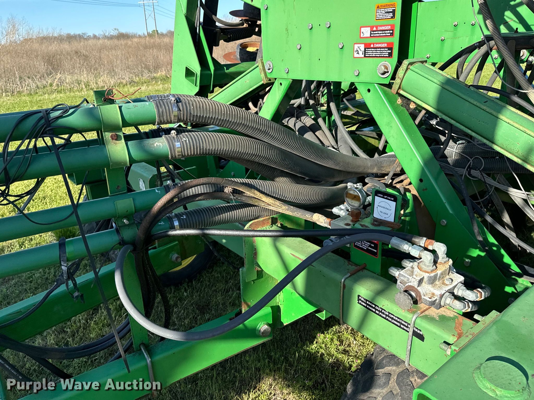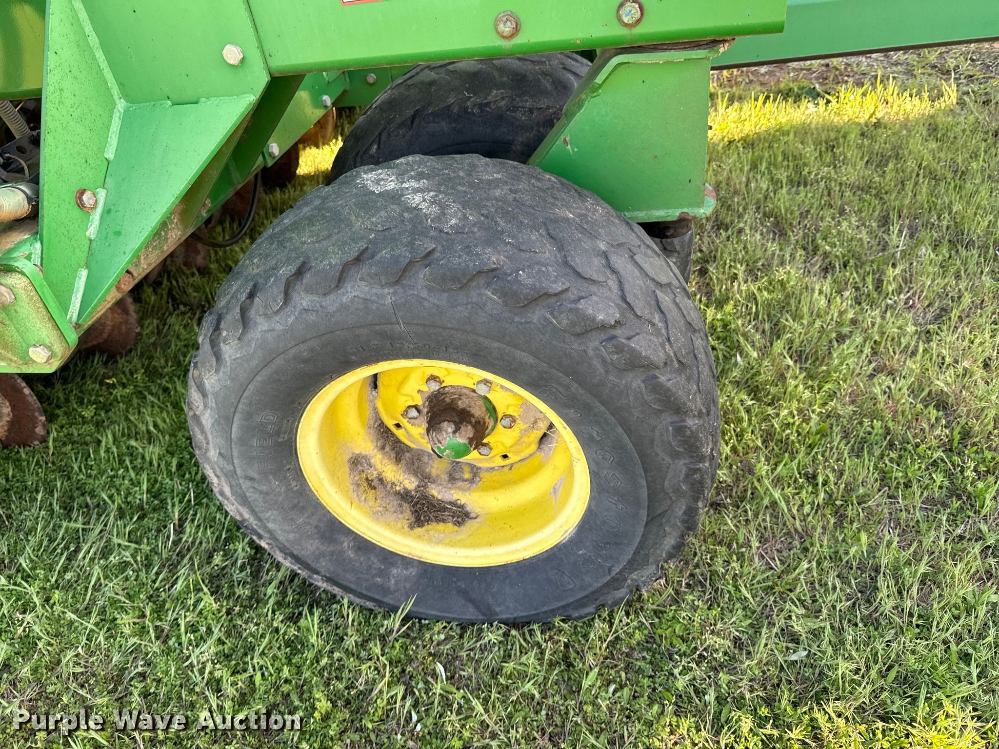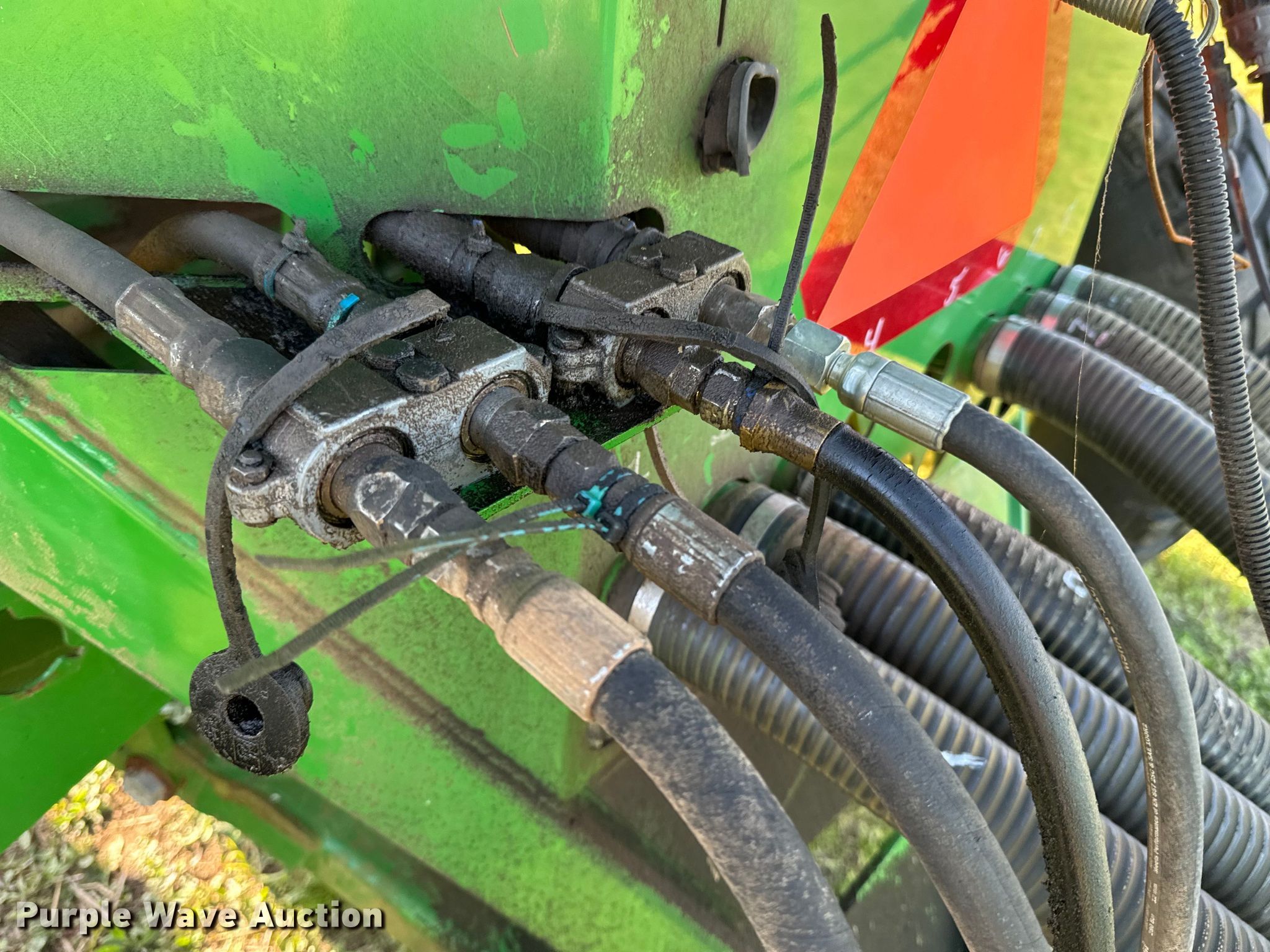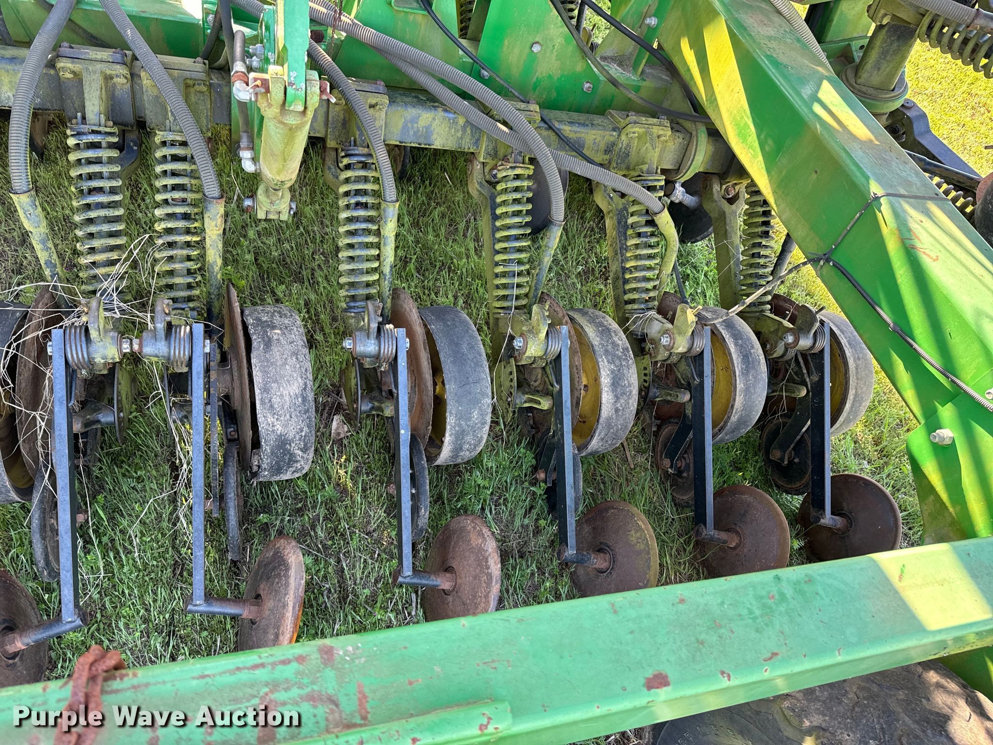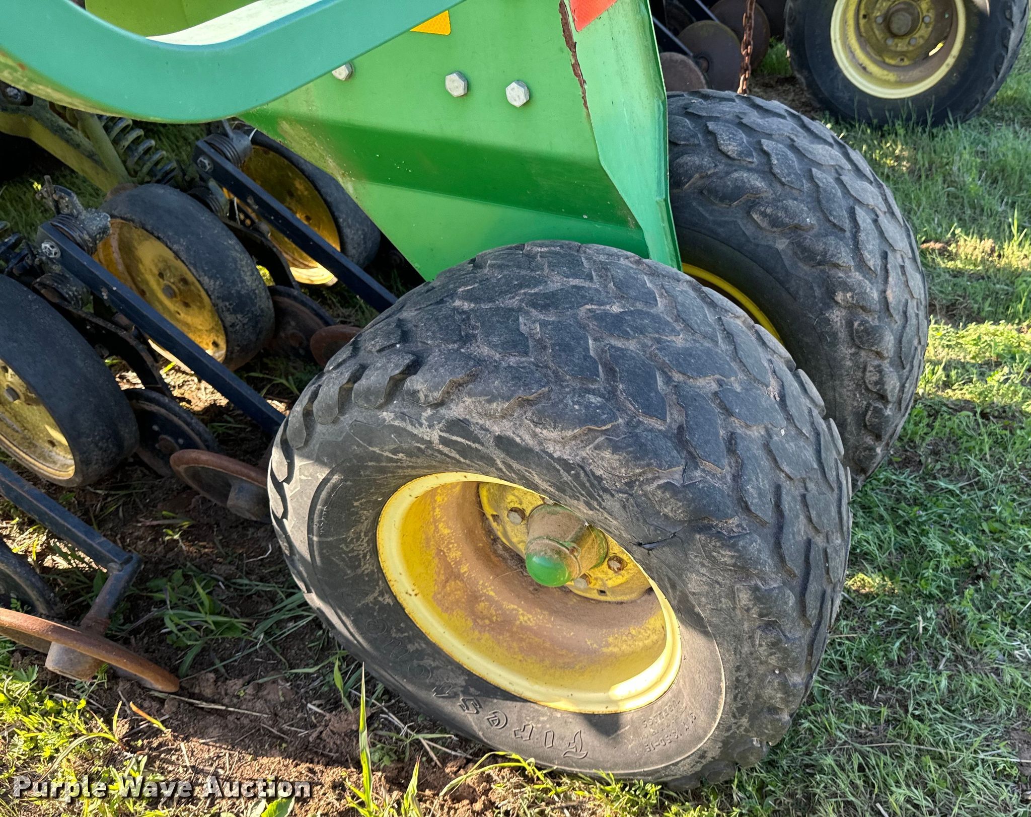 John Deere 1850 air seeder. Width: 42', Row units: 60, Row spacing: 7.5", Serial: H01850X671802. Features Frame Hydraulic fold Wing fold, Seed delivery Bulk fill system, Air commodity cart John Deere 1900, Row units Vacuum metering, Meter drive: Ground, Seed meters: Soybeans, Down pressure: Hydraulic, Disk openers: Single, Gauge wheels: Single, Closing system: Single Type: Cast, Fertilizer/ insecticide Fertilizer Dry capacity: 14,000 lbs.. Tires Transport tire size: 31x13.50-15 Quantity: 8, Drive/ outside tire size: 31x13.50-15 Quantity: 8, Cart tire size: 23.1-26. Franklin Farms. Vinita, OK 74301