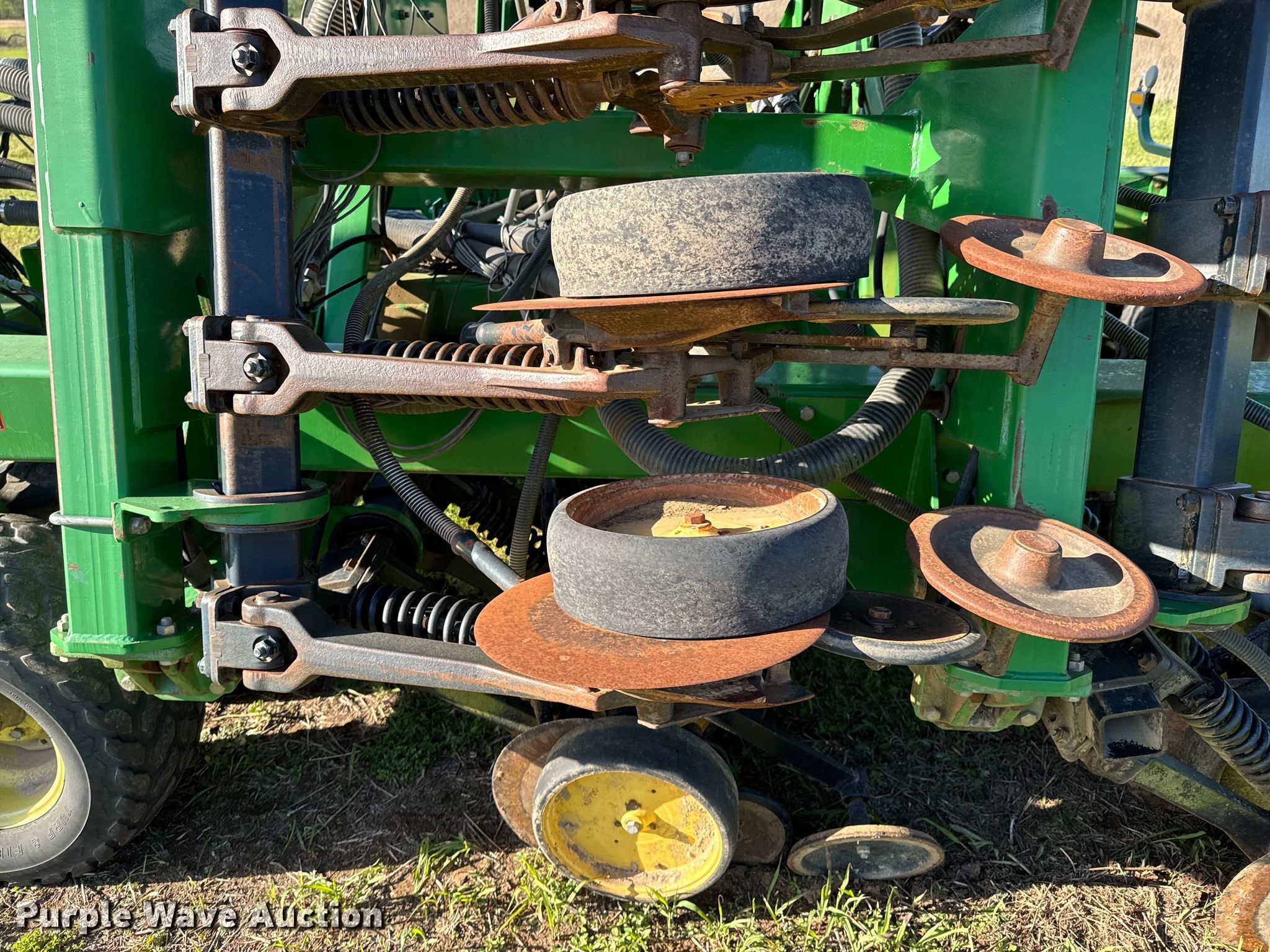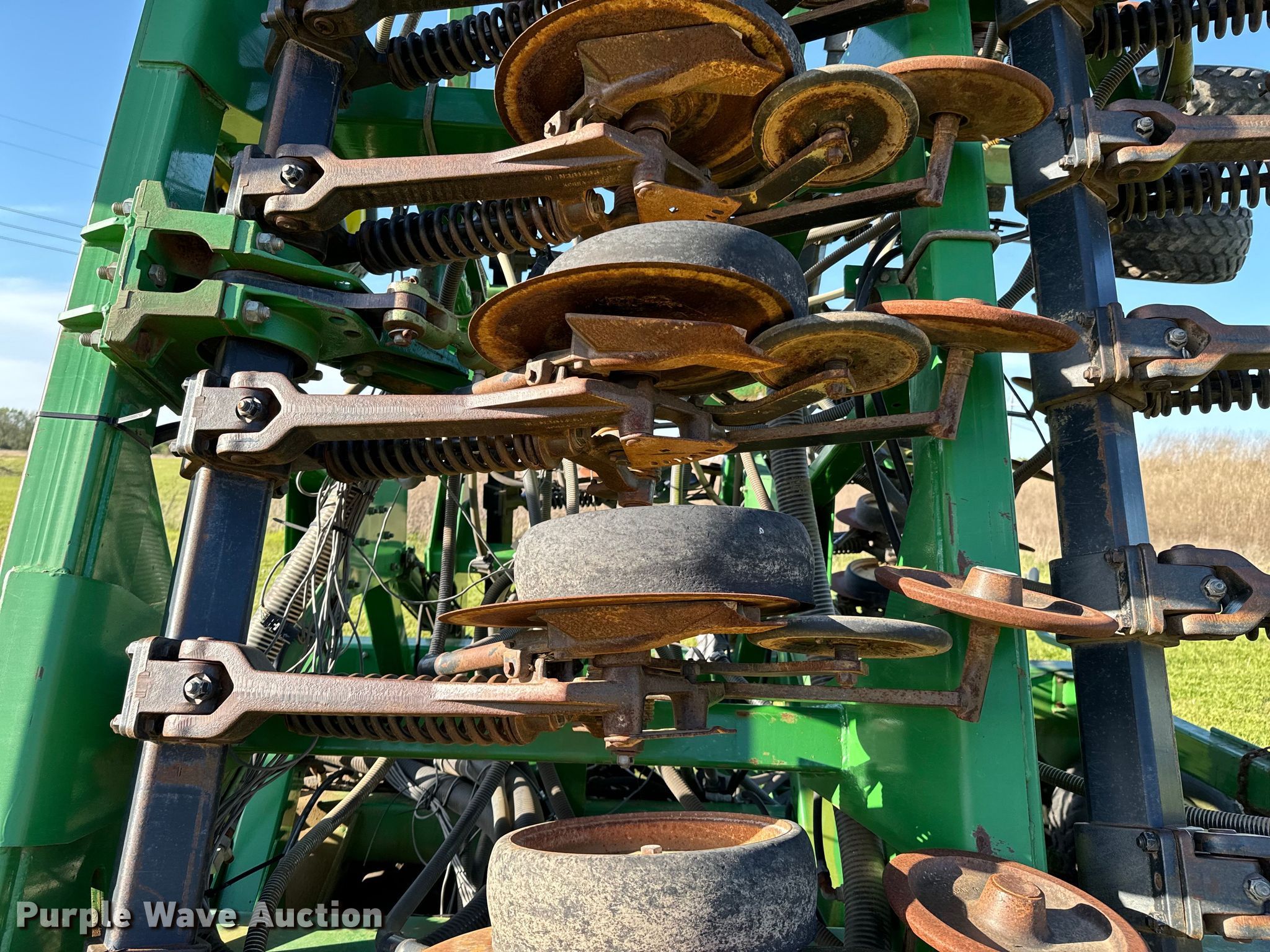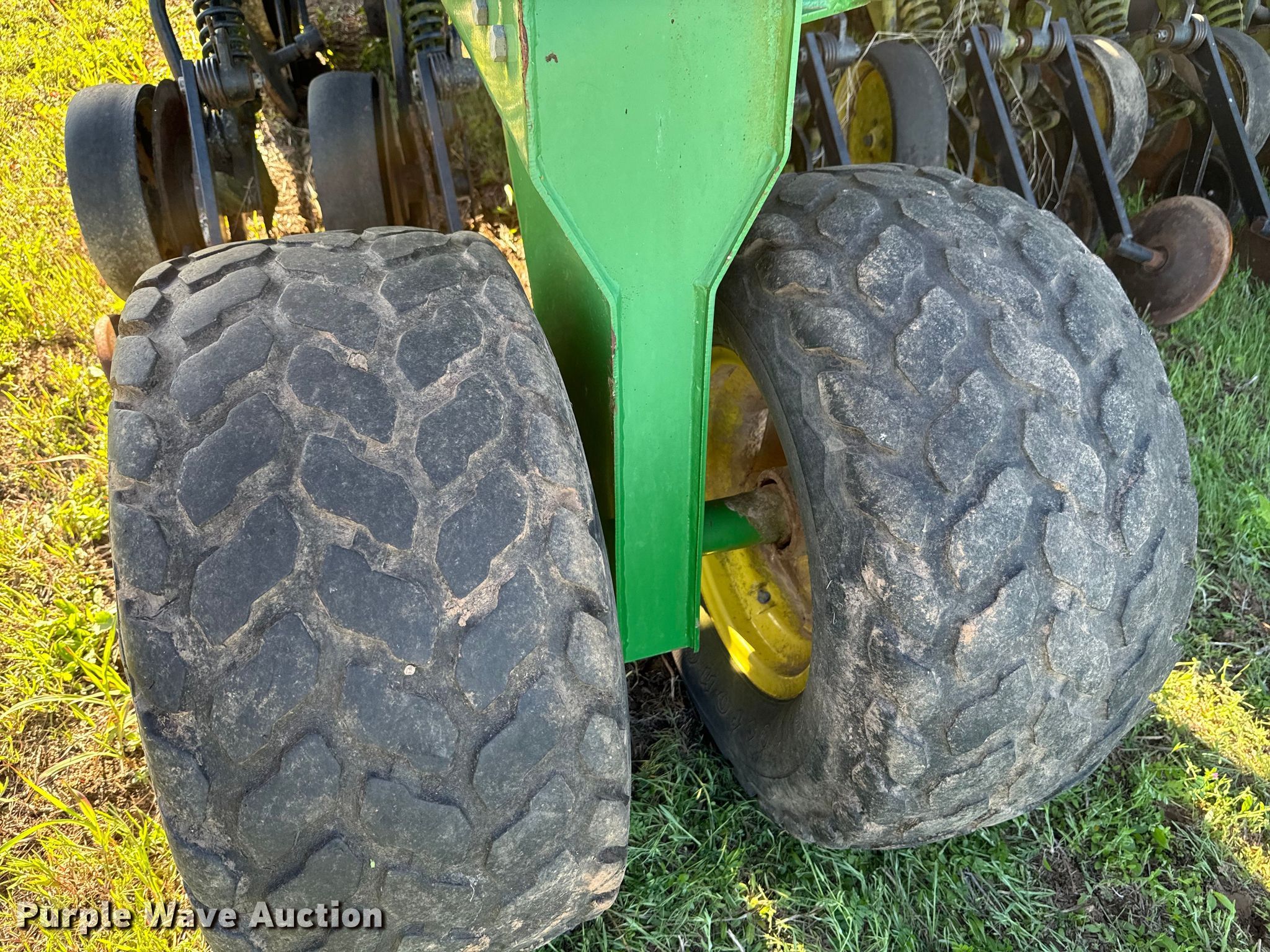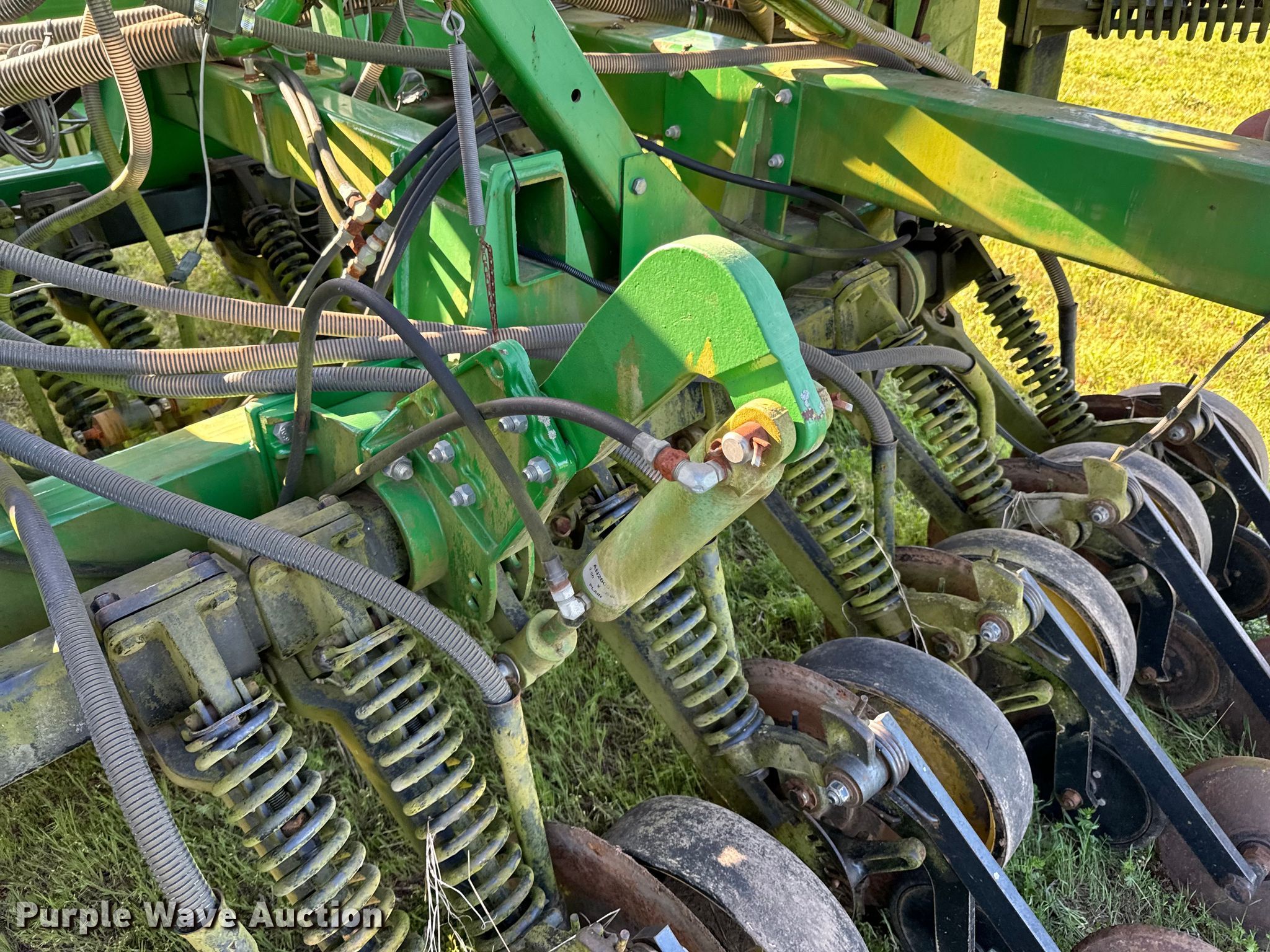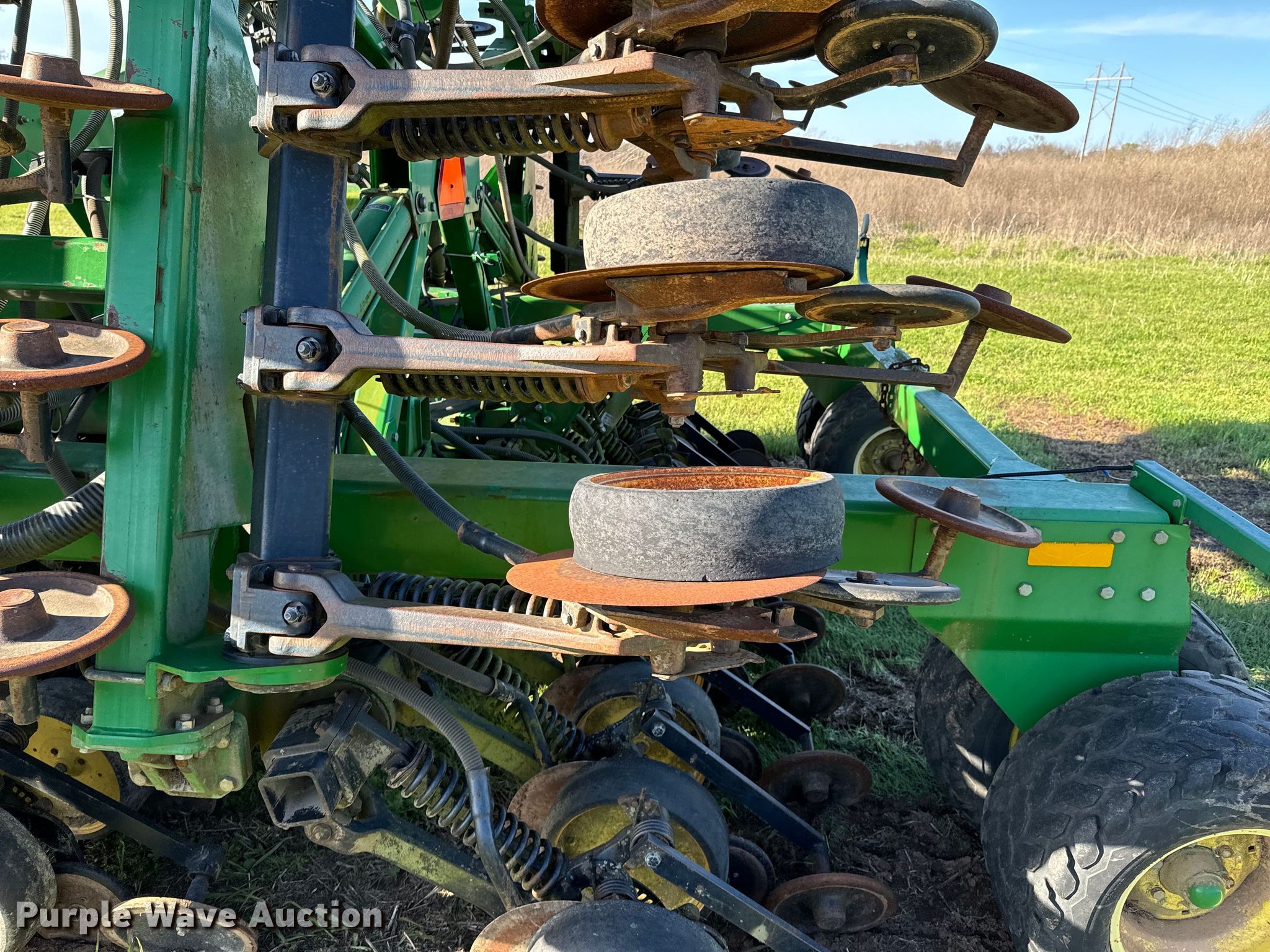 John Deere 1850 air seeder. Width: 42', Row units: 60, Row spacing: 7.5", Serial: H01850X671802. Features Frame Hydraulic fold Wing fold, Seed delivery Bulk fill system, Air commodity cart John Deere 1900, Row units Vacuum metering, Meter drive: Ground, Seed meters: Soybeans, Down pressure: Hydraulic, Disk openers: Single, Gauge wheels: Single, Closing system: Single Type: Cast, Fertilizer/ insecticide Fertilizer Dry capacity: 14,000 lbs.. Tires Transport tire size: 31x13.50-15 Quantity: 8, Drive/ outside tire size: 31x13.50-15 Quantity: 8, Cart tire size: 23.1-26. Franklin Farms. Vinita, OK 74301