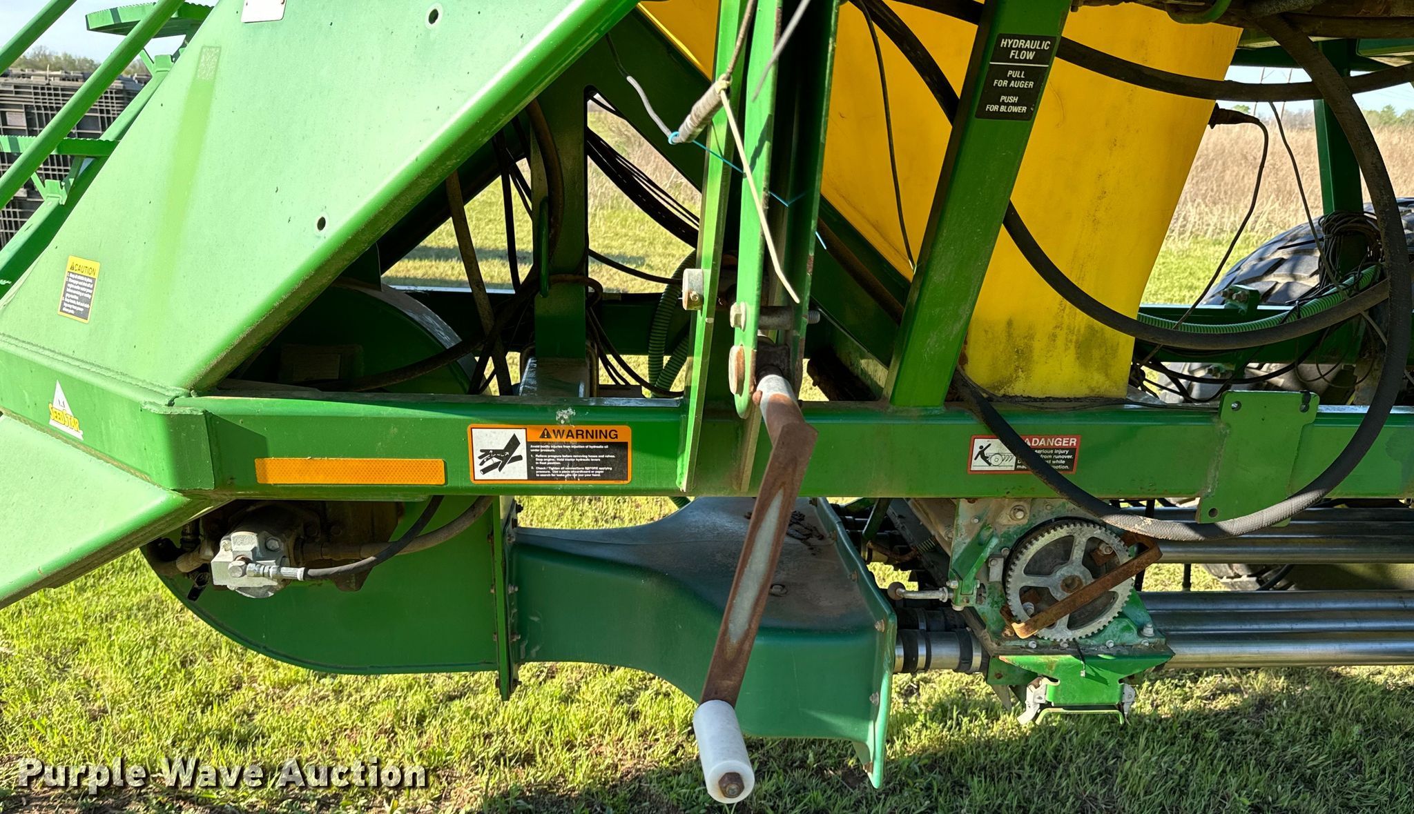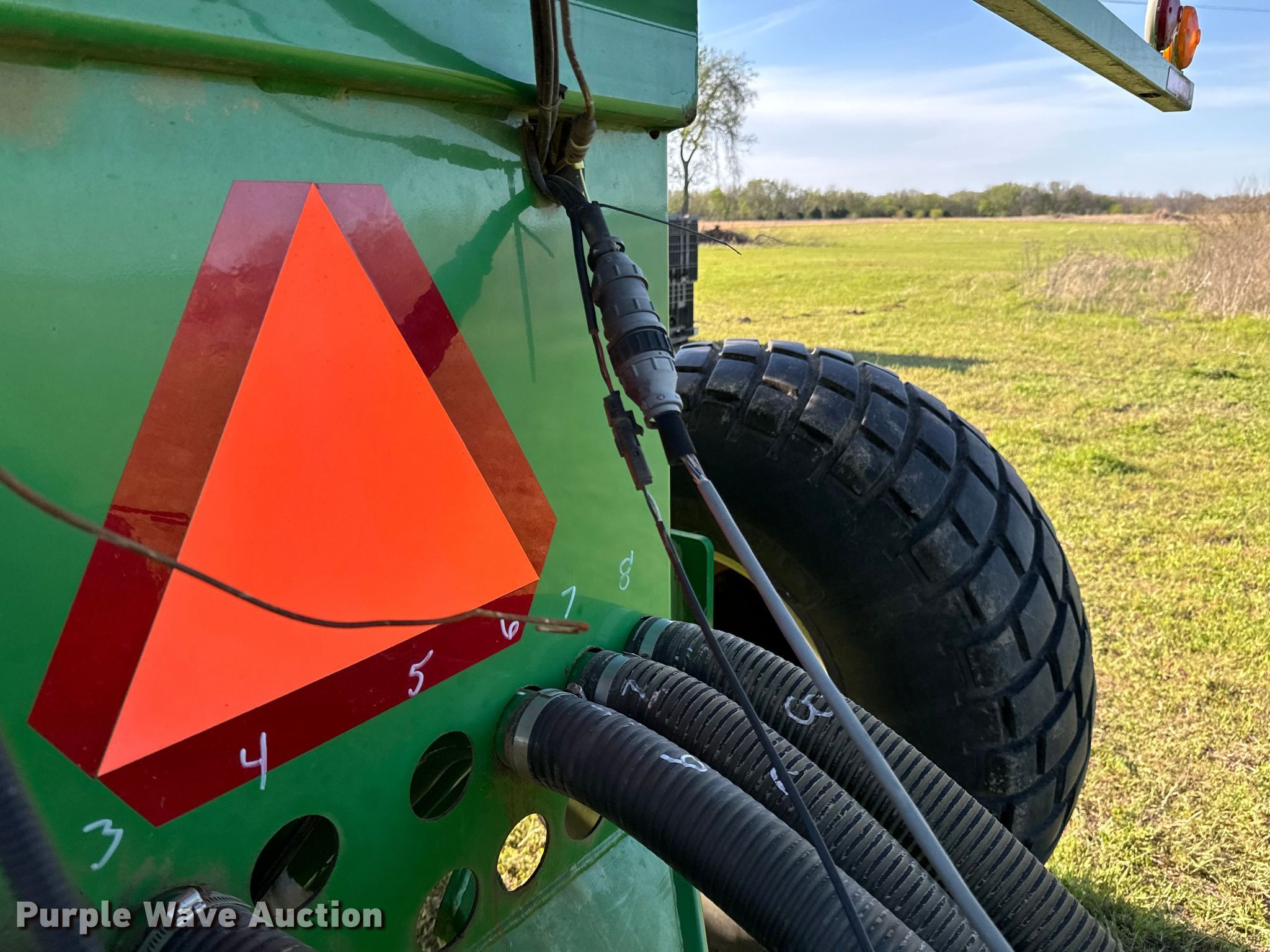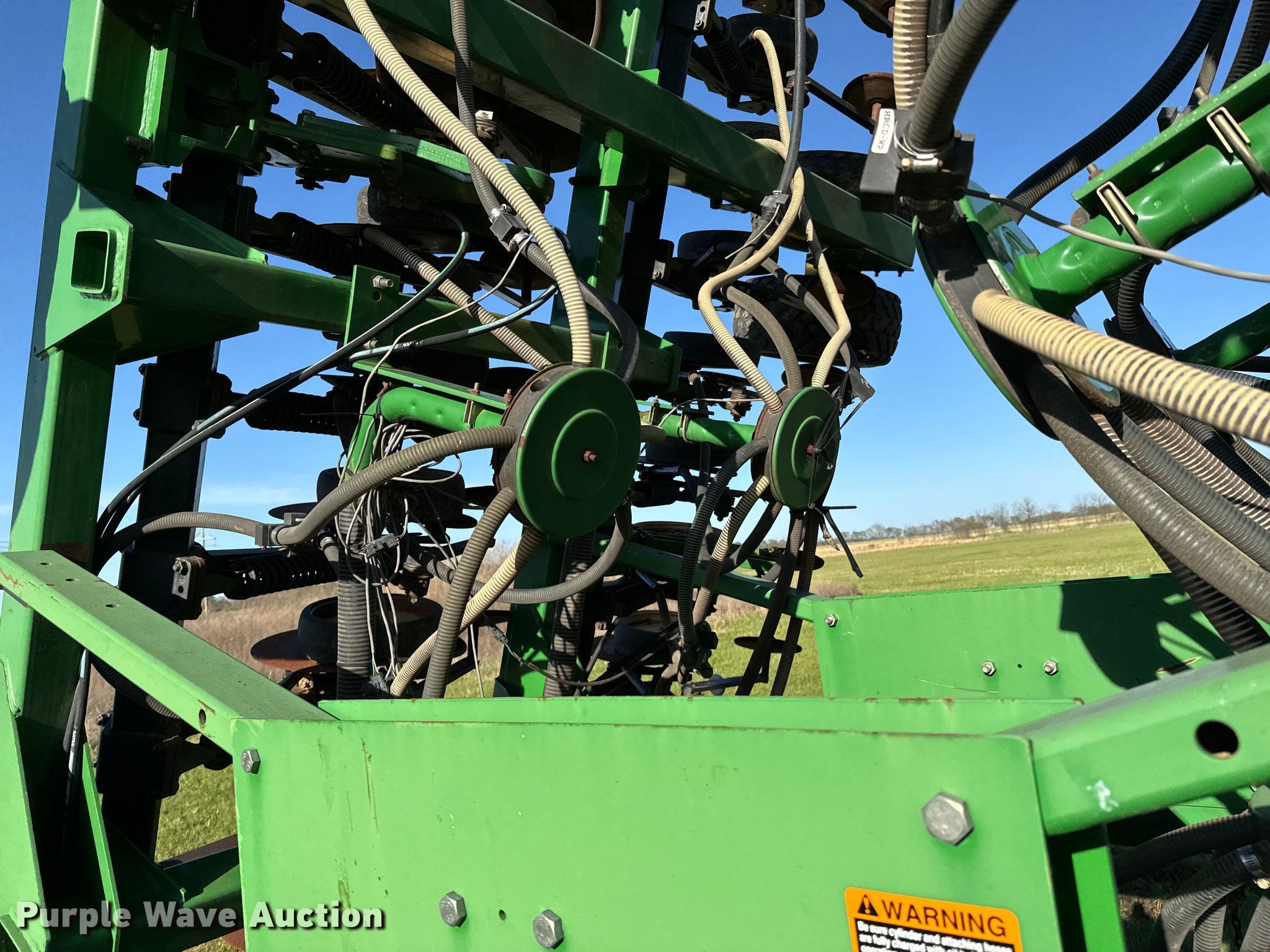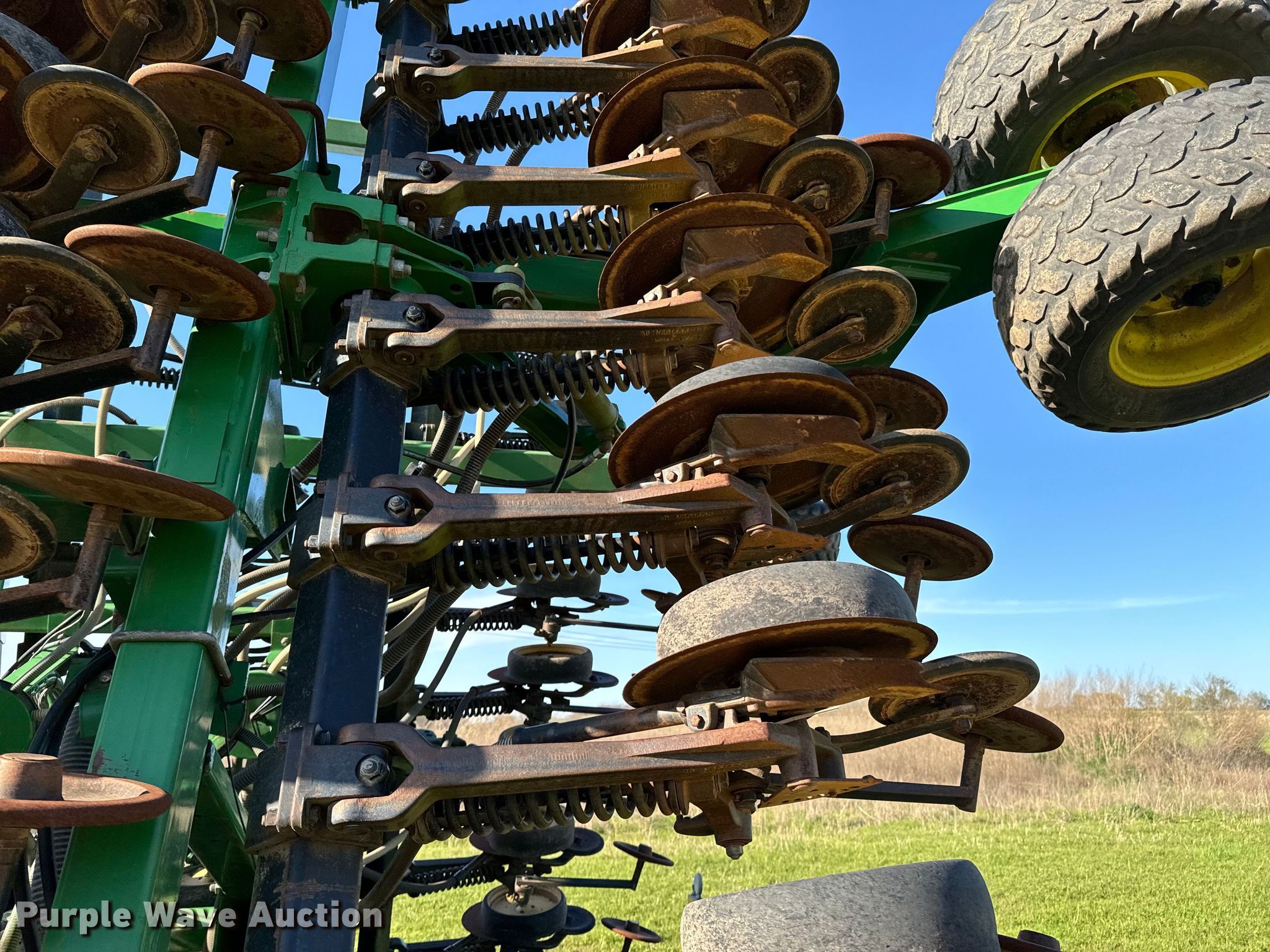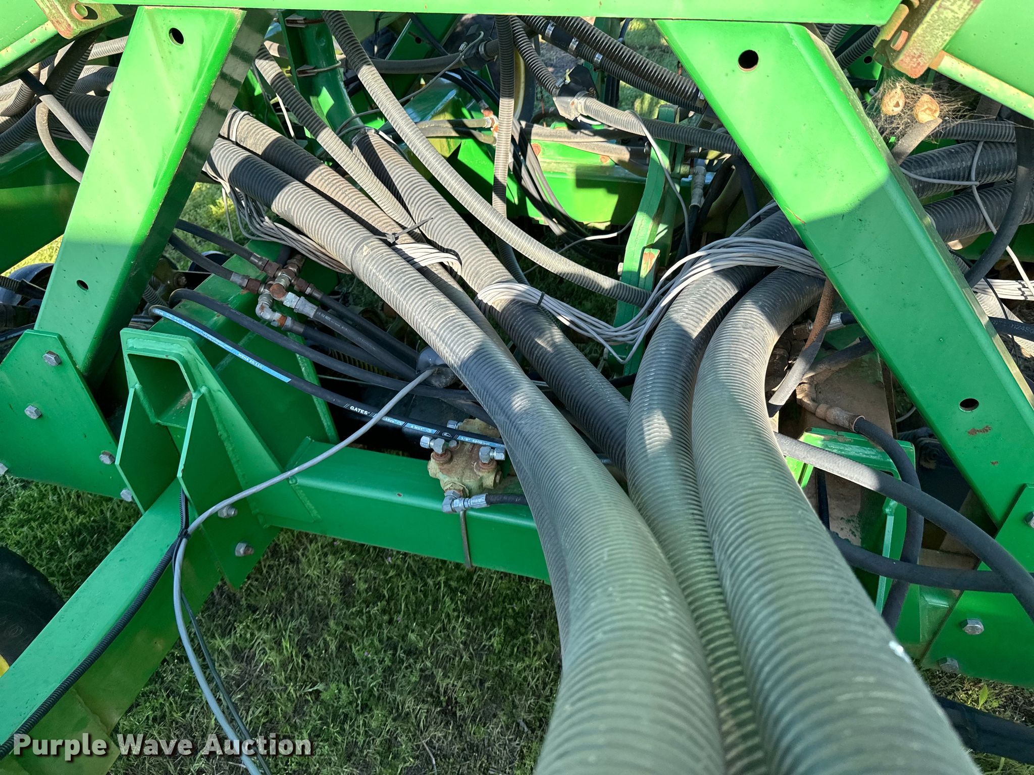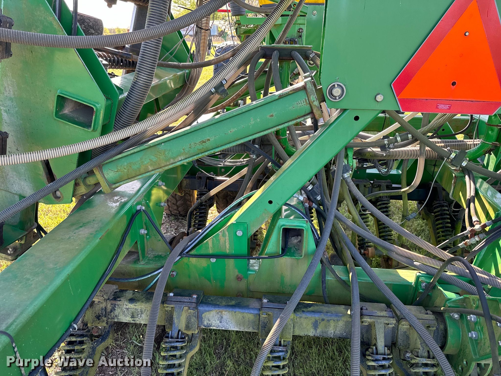 John Deere 1850 air seeder. Width: 42', Row units: 60, Row spacing: 7.5", Serial: H01850X671802. Features Frame Hydraulic fold Wing fold, Seed delivery Bulk fill system, Air commodity cart John Deere 1900, Row units Vacuum metering, Meter drive: Ground, Seed meters: Soybeans, Down pressure: Hydraulic, Disk openers: Single, Gauge wheels: Single, Closing system: Single Type: Cast, Fertilizer/ insecticide Fertilizer Dry capacity: 14,000 lbs.. Tires Transport tire size: 31x13.50-15 Quantity: 8, Drive/ outside tire size: 31x13.50-15 Quantity: 8, Cart tire size: 23.1-26. Franklin Farms. Vinita, OK 74301