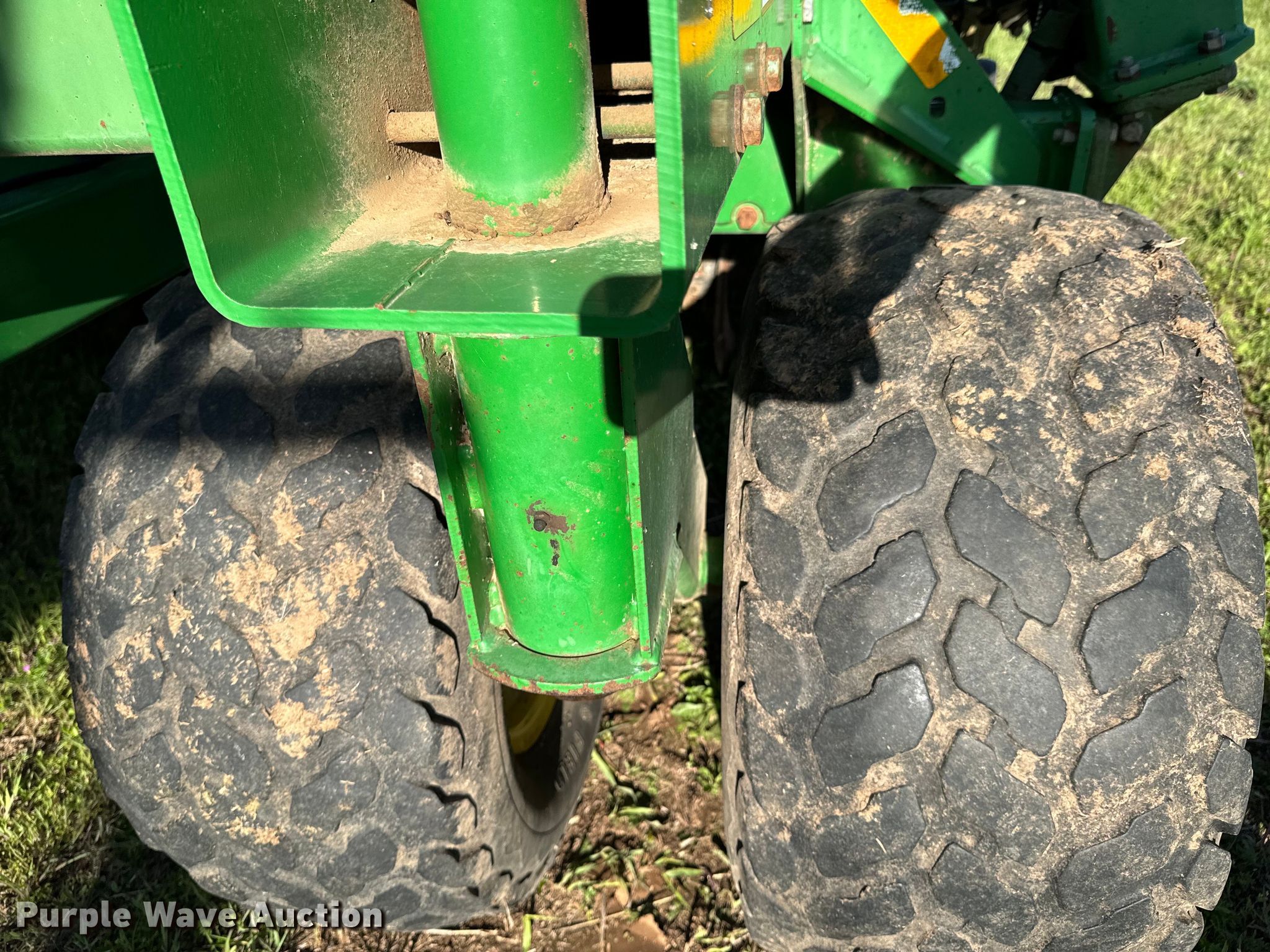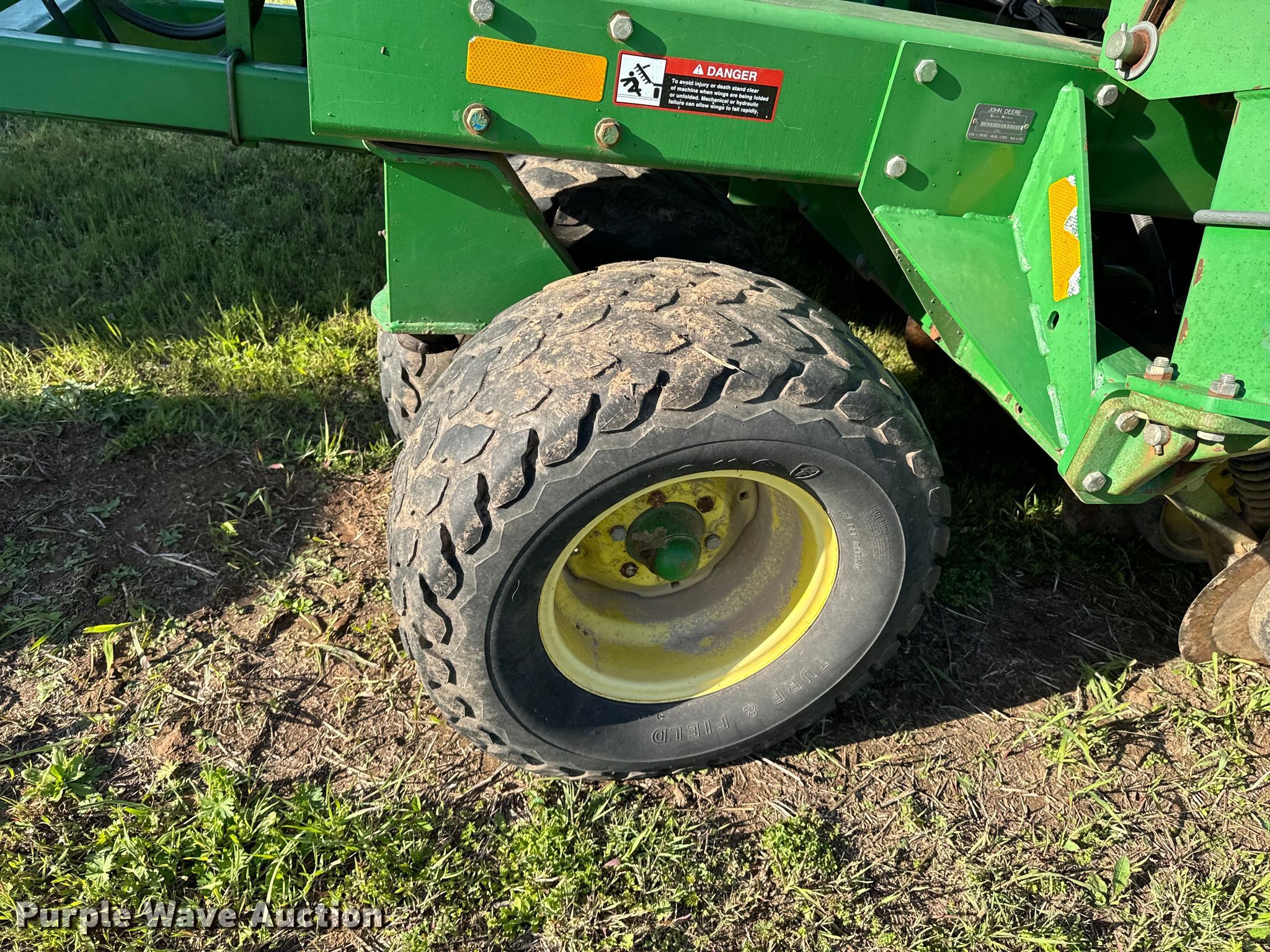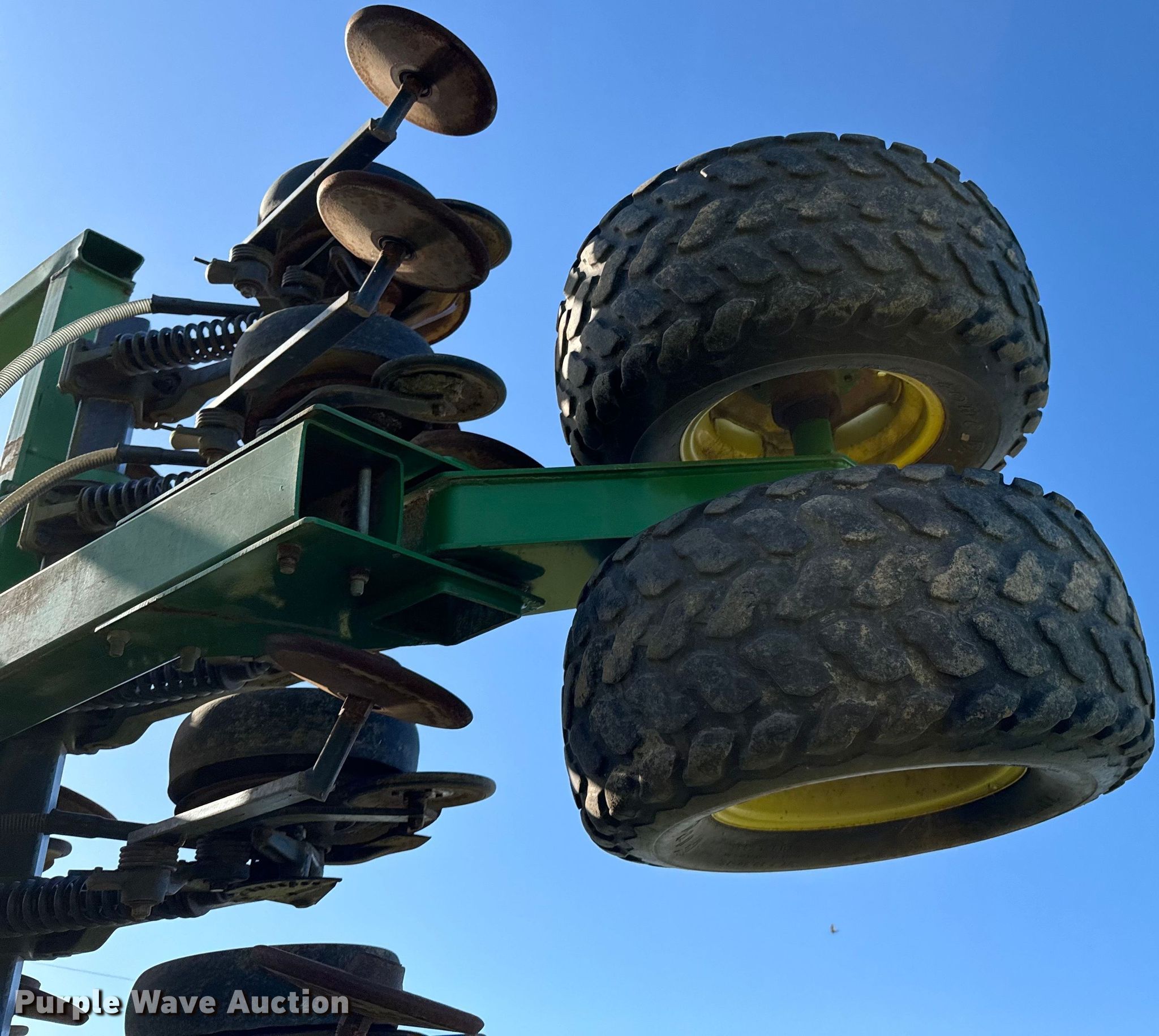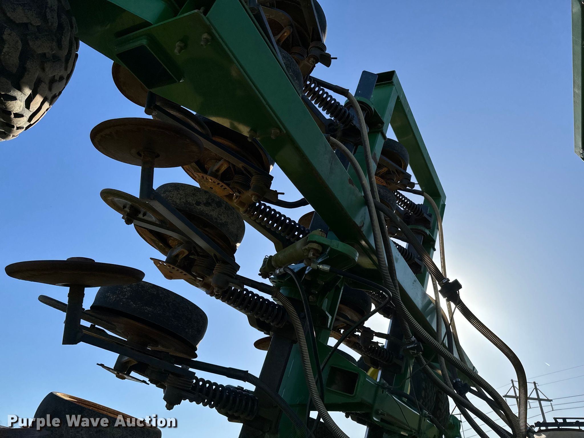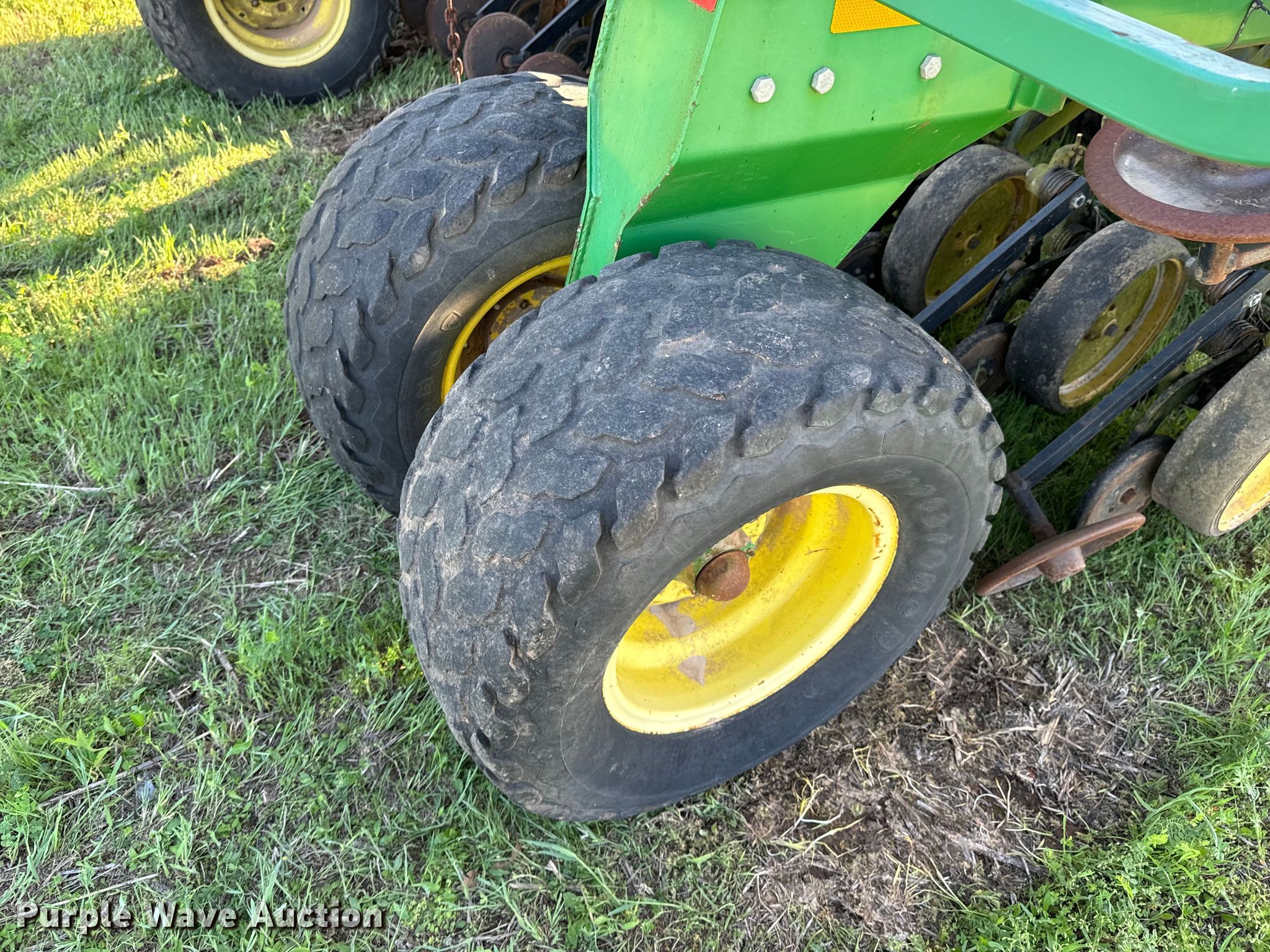 John Deere 1850 air seeder. Width: 42', Row units: 60, Row spacing: 7.5", Serial: H01850X671802. Features Frame Hydraulic fold Wing fold, Seed delivery Bulk fill system, Air commodity cart John Deere 1900, Row units Vacuum metering, Meter drive: Ground, Seed meters: Soybeans, Down pressure: Hydraulic, Disk openers: Single, Gauge wheels: Single, Closing system: Single Type: Cast, Fertilizer/ insecticide Fertilizer Dry capacity: 14,000 lbs.. Tires Transport tire size: 31x13.50-15 Quantity: 8, Drive/ outside tire size: 31x13.50-15 Quantity: 8, Cart tire size: 23.1-26. Franklin Farms. Vinita, OK 74301