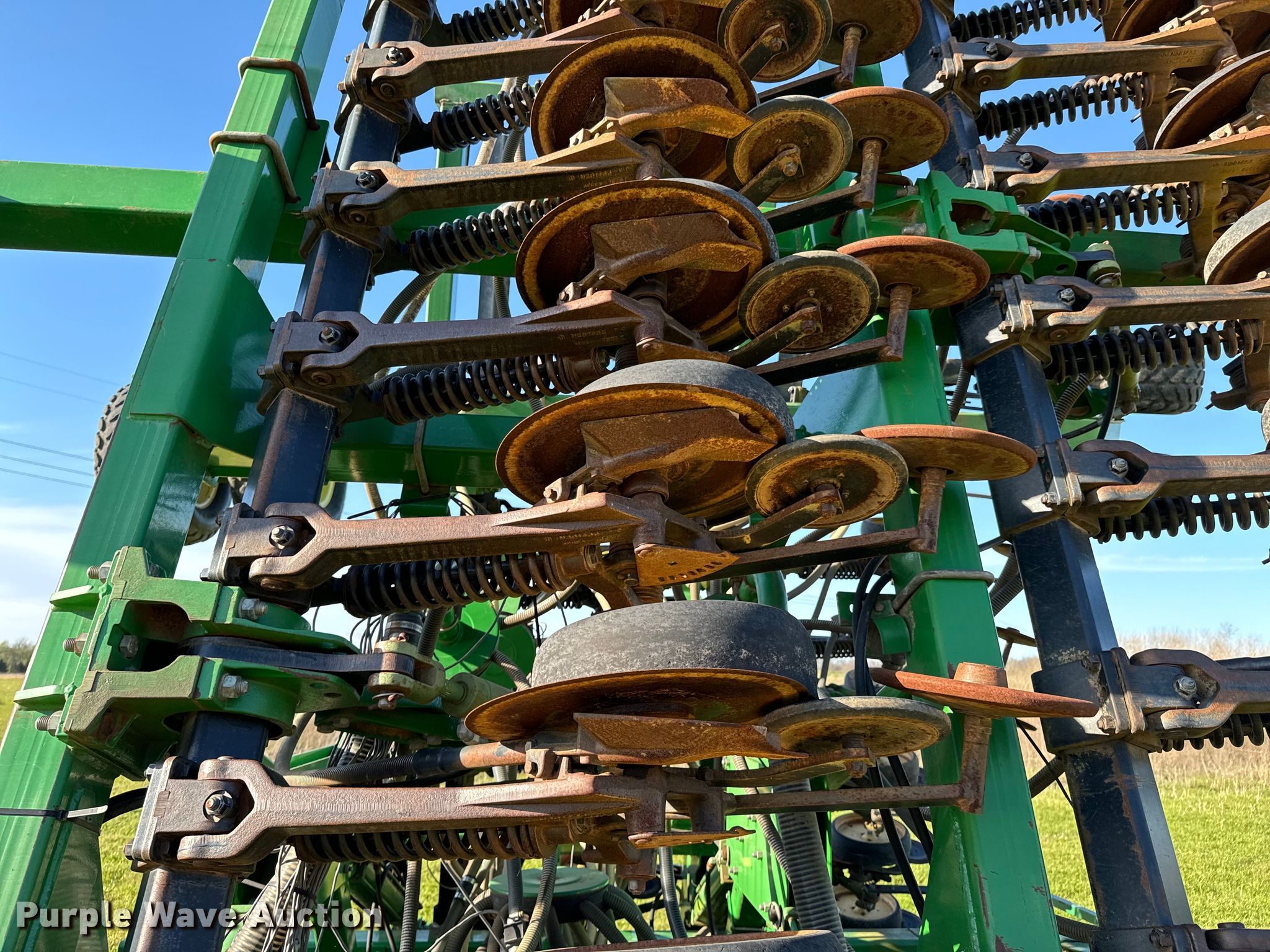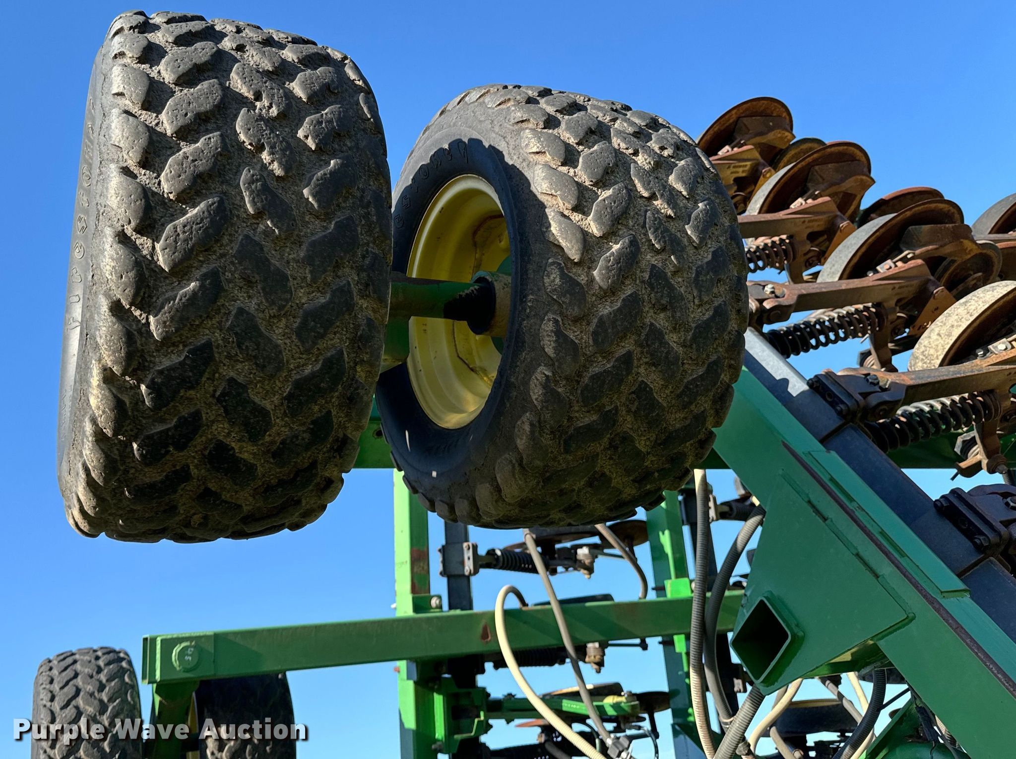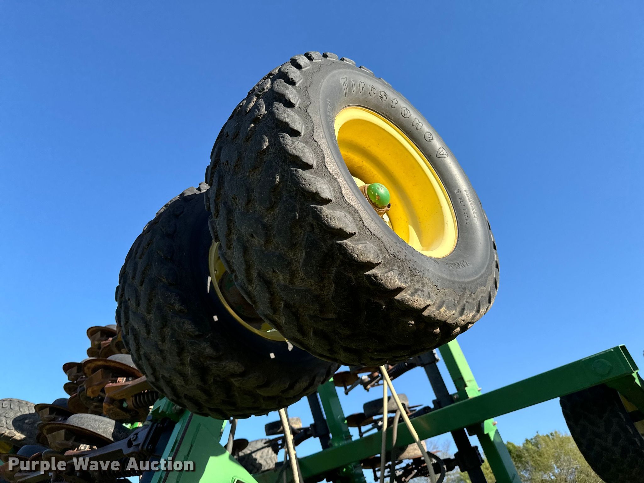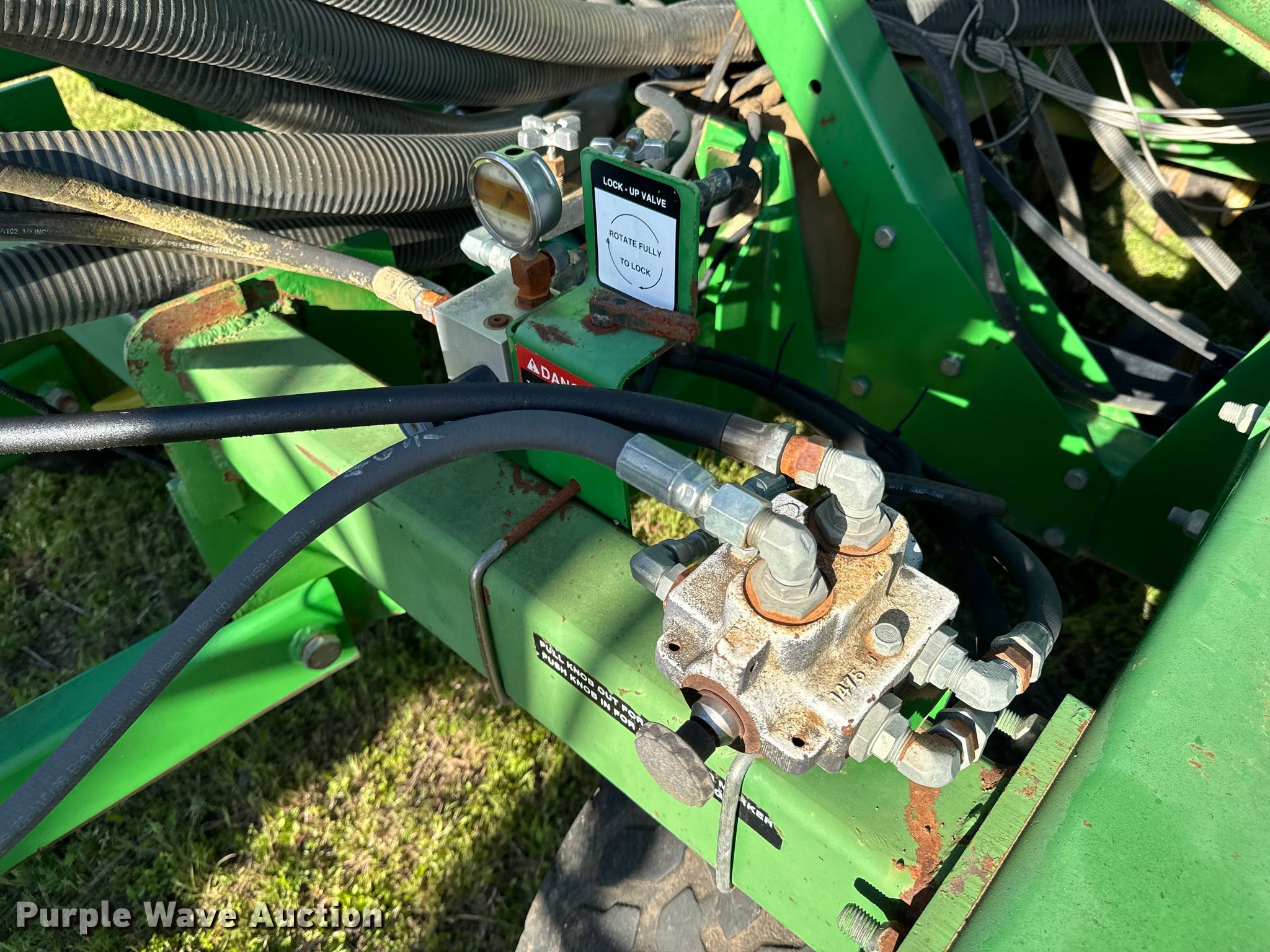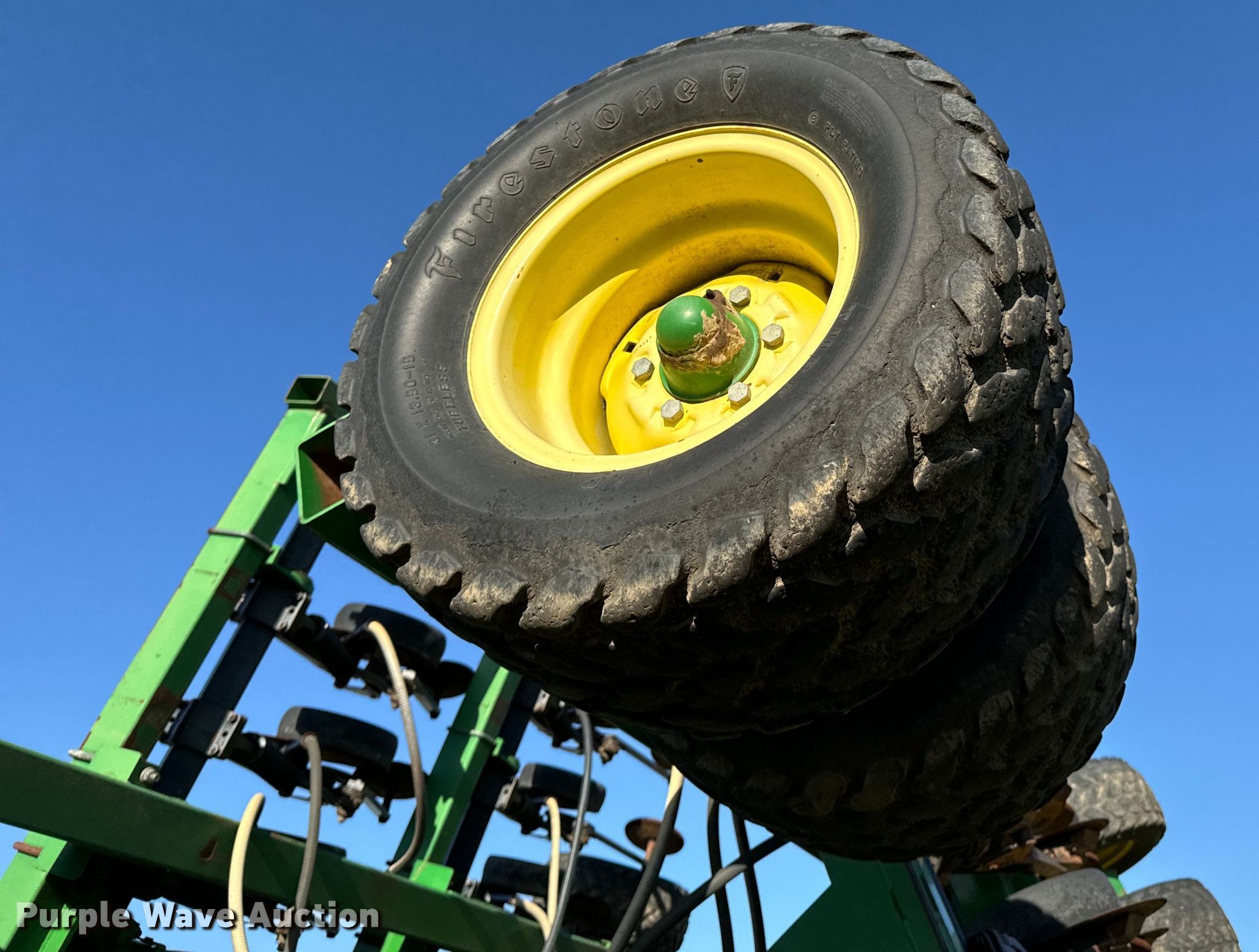 John Deere 1850 air seeder. Width: 42', Row units: 60, Row spacing: 7.5", Serial: H01850X671802. Features Frame Hydraulic fold Wing fold, Seed delivery Bulk fill system, Air commodity cart John Deere 1900, Row units Vacuum metering, Meter drive: Ground, Seed meters: Soybeans, Down pressure: Hydraulic, Disk openers: Single, Gauge wheels: Single, Closing system: Single Type: Cast, Fertilizer/ insecticide Fertilizer Dry capacity: 14,000 lbs.. Tires Transport tire size: 31x13.50-15 Quantity: 8, Drive/ outside tire size: 31x13.50-15 Quantity: 8, Cart tire size: 23.1-26. Franklin Farms. Vinita, OK 74301