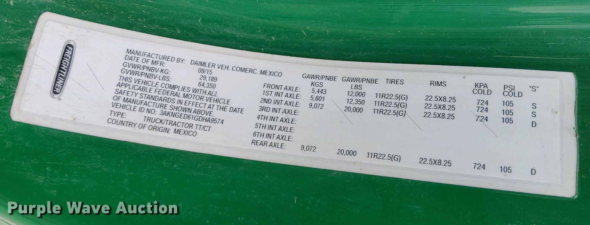 2016 Freightliner Cascadia semi truck. Miles: 599,072 on odometer, Hours: 14,598 on meter, VIN: 3AKNGED61GDHA9574, Unit #: 5010. Engine Detroit Diesel DD15, Displacement: 14.8L, Cylinders: 6, Fuel type: Diesel, Engine brake. Transmission Eaton Fuller, Manual, Speed: 10. Chassis Axles: Triple, Pusher axle Steerable, Differential lock: Inter-axle, Suspension: Spring Dump valves, Brakes: Air, GVWR: 64,350 lbs FAWR: 12,000 lbs, IAWR: 20,000 lbs, RAWR: 20,000 lbs, Lift axle GAWR: 12,350 lbs. Interior AC, Heat, Heated mirrors, Power windows, Power locks, Cruise control, Air ride cab. Features Fifth wheel type: Air operated, Sliding, Fuel tank: Dual. Tires Size: 11R22.5. Notes Dash warning indicator: Check engine, Windshield chipped or cracked, Oil leak, Engine issues, blow by. Nebraska title. Title distribution may be delayed up to 14 days from verification of funds. Transwood Carriers, Inc.- Terminal 826. Evansville, WY 82636