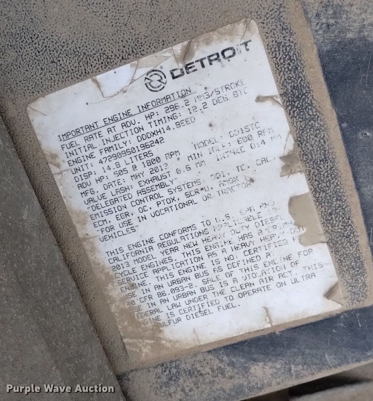 2014 Freightliner Cascadia semi truck. Miles: 907,287 on odometer, Hours: 56,894 on meter, VIN: 3AKJGED69ESFS5169, Unit #: 5759. Engine Detroit Diesel, Displacement: 14.8L, Cylinders: 6, Fuel type: Diesel, HP: 505, Engine brake. Transmission Eaton Fuller, Manual, Speed: 10. Chassis Axles: Tandem, Differential lock: Inter-axle, Suspension: Air Dump valves, Brakes: Air, PTO, GVWR: 52,000 lbs FAWR: 12,000 lbs, IAWR: 20,000 lbs, RAWR: 20,000 lbs. Interior AC, Heat, Heated mirrors, Power windows, Power locks, Cruise control, Air ride cab. Features Deck plate: Aluminum, Fifth wheel type: Air operated, Sliding, Fuel tank: Dual. Tires Front: 11R22.5, Rear: 11R24.5. Notes Common powertrain controller needs replaced , Engine issues, main bearing spun , Windshield chipped or cracked, Interior tires missing, Dead battery, Non-operational unit. Nebraska title. Title distribution may be delayed up to 14 days from verification of funds. Transwood Carriers, Inc.- Terminal 823. Rawlins, WY 82301
