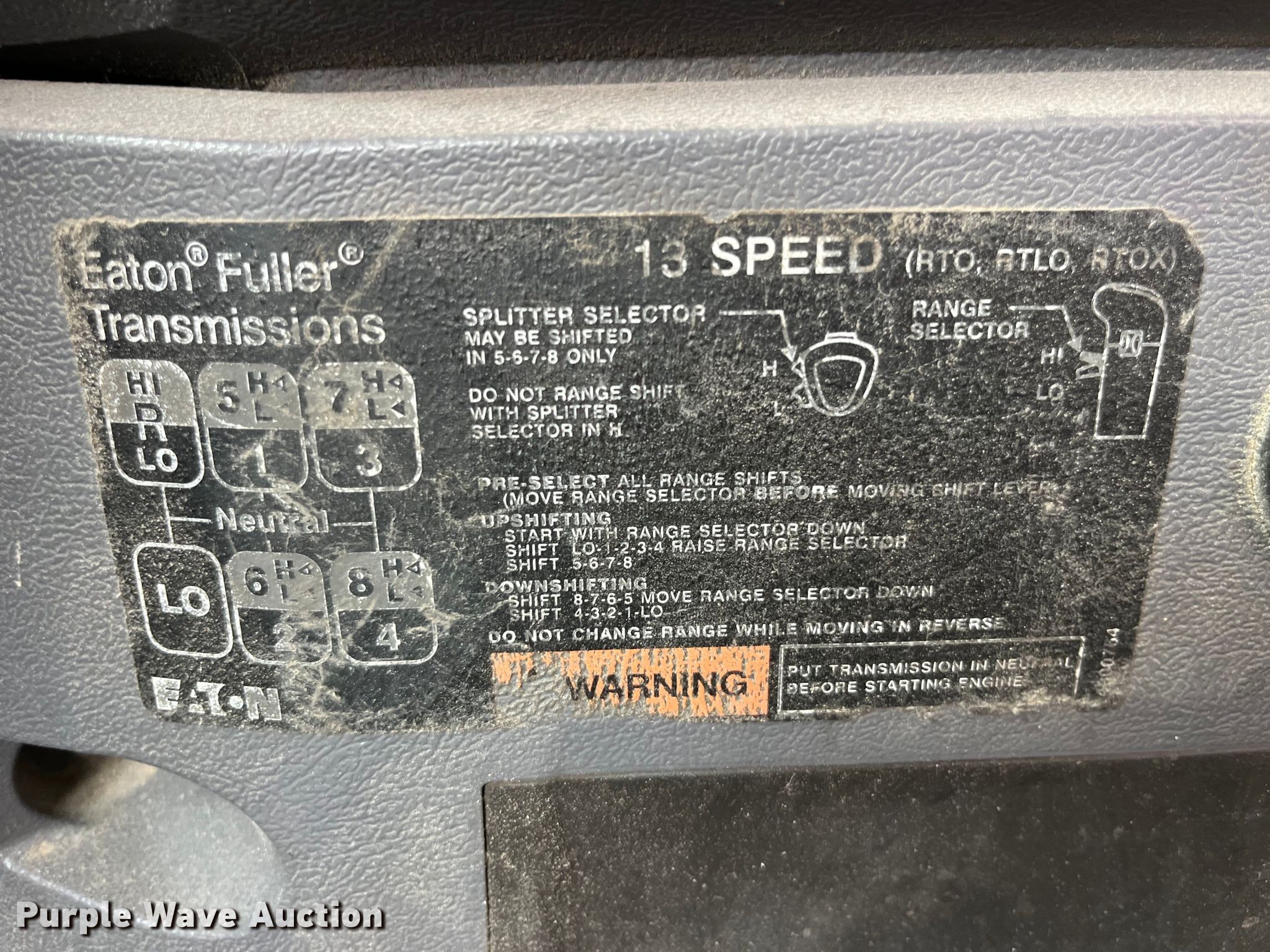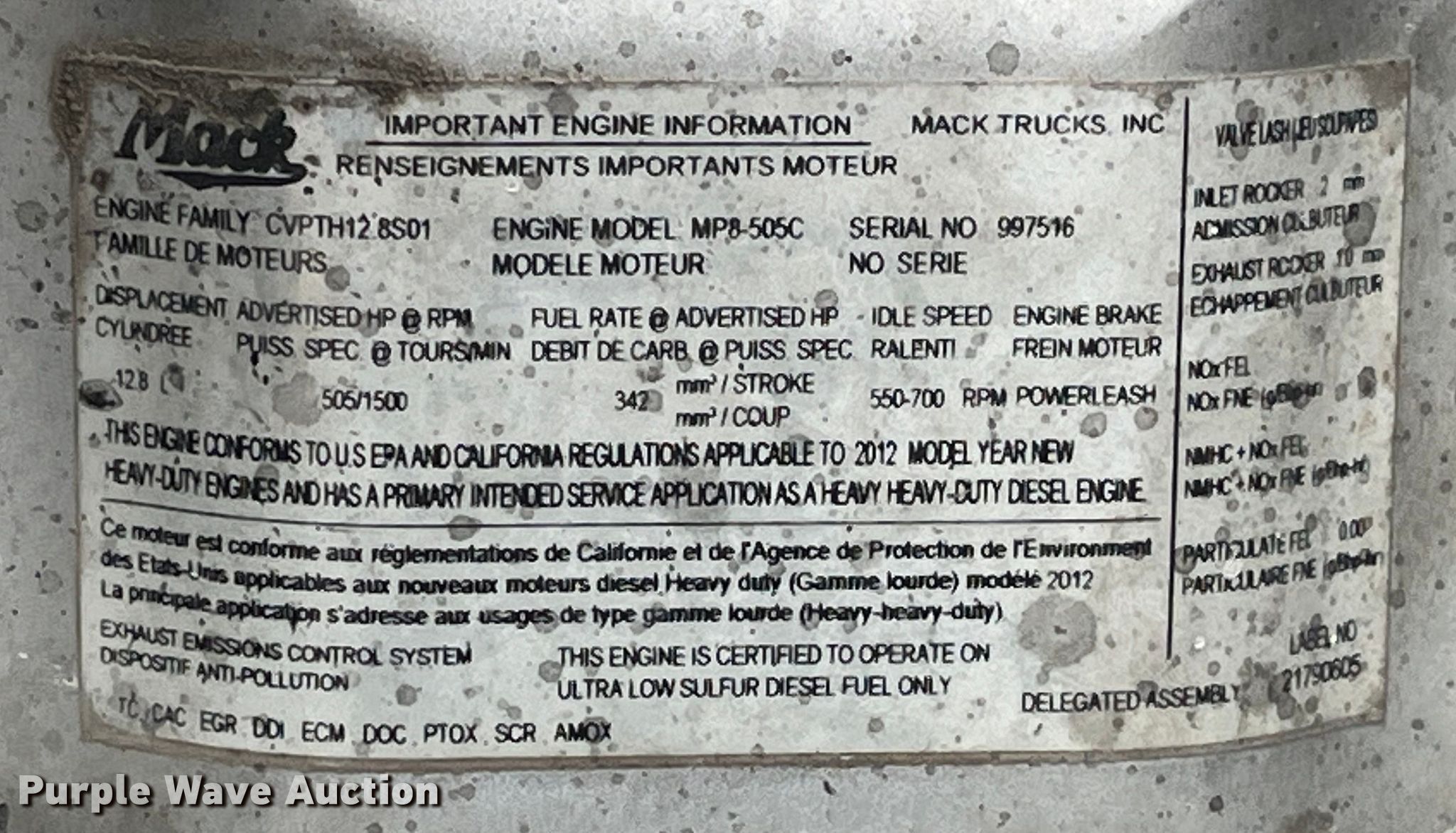 2013 Mack CHU613 semi truck. Miles: 601,047 on odometer, Hours: 20,925 on meter, VIN: 1M1AN07Y3DM013275, Unit #: SH38. Engine Mack MP8-505C, Serial: 997516, Displacement: 12.8L, Cylinders: 6, Fuel type: Diesel, Engine brake. Transmission Eaton Fuller, Manual, Speed: 13. Chassis Axles: Tandem, Differential lock: Inter-axle, Suspension: Air Dump valves, Brakes: Air, PTO, Wet kit, GVWR: 53,220 lbs FAWR: 13,220 lbs, IAWR: 20,000 lbs, RAWR: 20,000 lbs. Interior AC, heat, Heated mirrors, Power windows, power locks, Cruise control, Air ride cab. Features Deck plate: Aluminum, Fifth wheel type: Air operated, sliding, Fuel tank: Dual. Tires Size: 11R24.5. Notes Engine oil fill cap missing Per seller, missing oil fill cap will be fixed before auction date, Dash warning indicator: Check engine, ABS, ATC, Non-operational driver side interior door handle. Illinois title. R D Shaffer Trucking, Inc.. Quincy, IL 62305