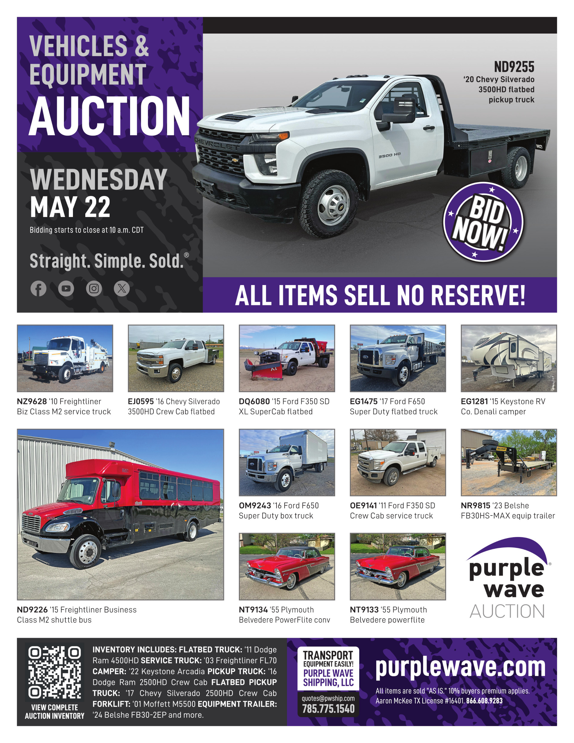 This auction is conducted by Purple Wave, Inc., whose home office is 825 Levee Drive, Manhattan, Kansas. Aaron McKee, Texas auctioneer license # 16401, operates Purple Wave, Inc. Complaints against us may be directed to the Texas Department of Licensing and Regulation, P.O. Box 12157, Austin, Texas 78711, (512) 463-6599. For additional required information, see the attached document.