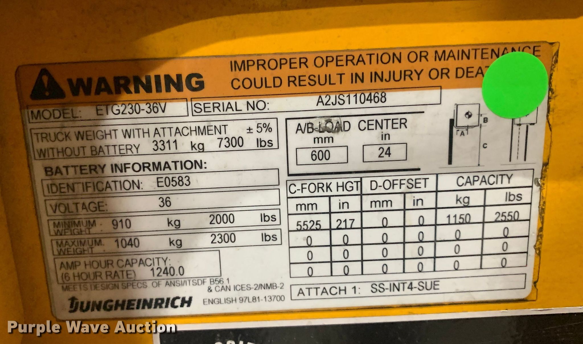 Purple Wave is selling a used Warehouse Forklift in Texas. This item is a Jungheinrich ETG230-36V forklift with the following: Hours: 2,939 on meter, Serial: A2JS110468