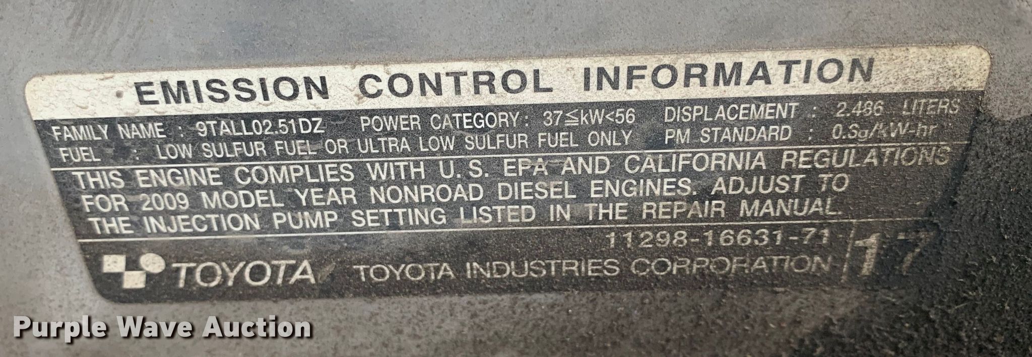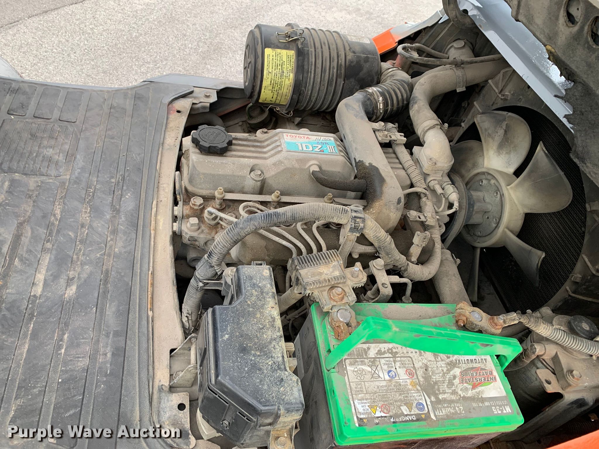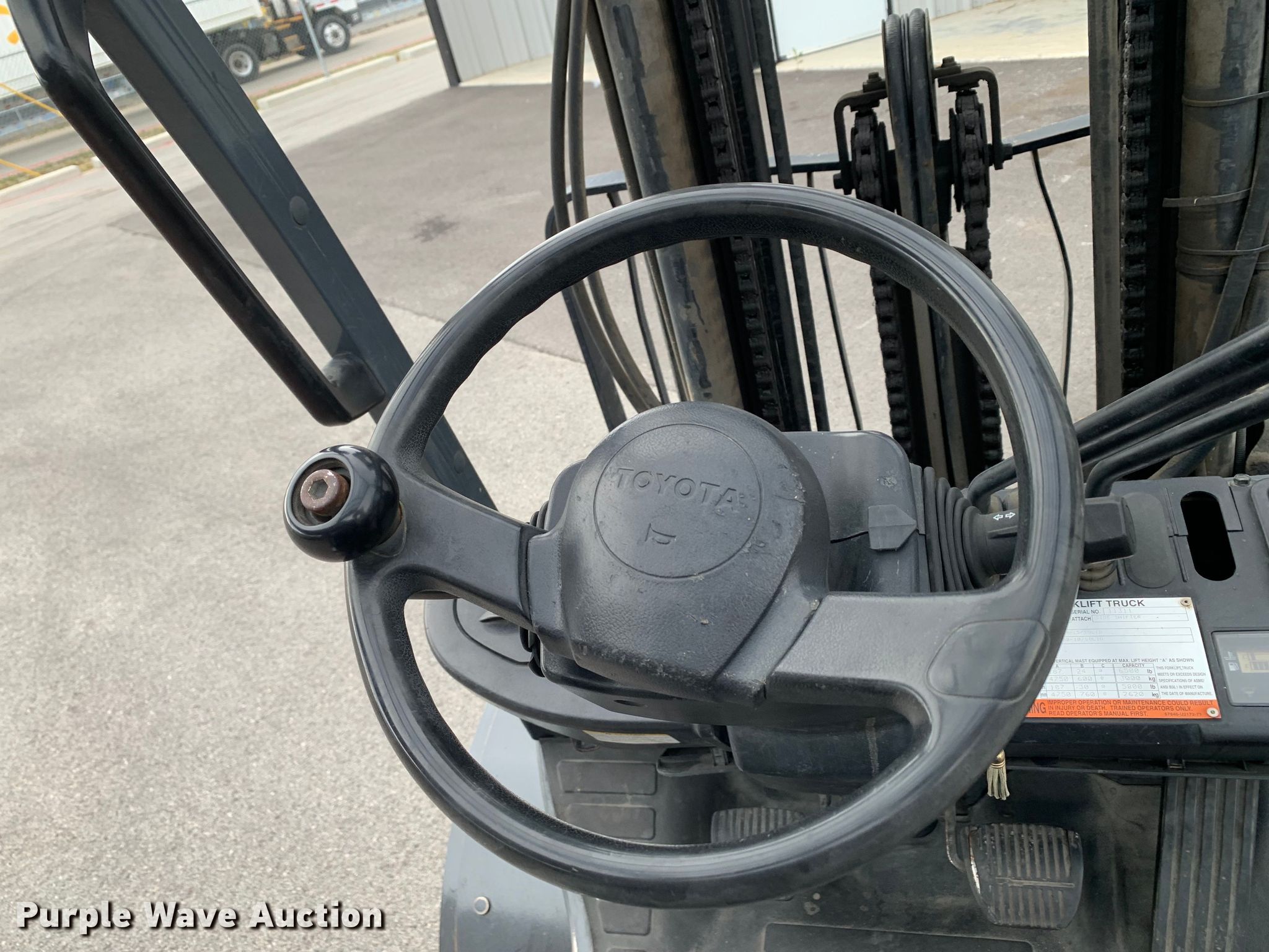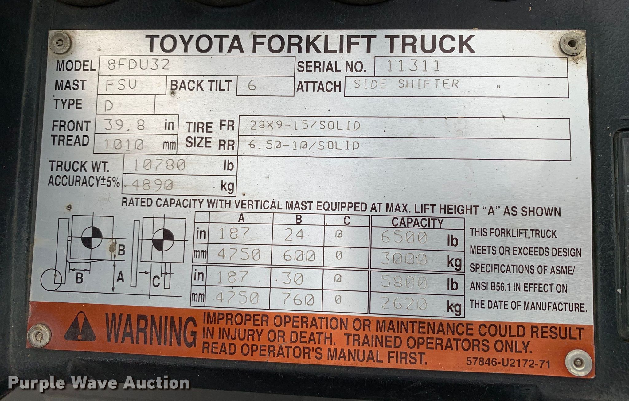 Toyota 8FDU32 forklift. Hours: 11,074 on meter, Serial: 11311. Engine Toyota 1DZ-III, Displacement: 2.486L, Cylinders: 4, Fuel type: Diesel, kW: 37. Transmission Powershift. Operators station OROPS. Features Maximum lift capacity: 6,500 lbs, Maximum lift height: 187", Mast stages: 3, Side shift, Mast tilt, Fork length: 46". Tires Front: 28x9-15, Rear: 6.50-10, Solid. Haslet, TX 76052