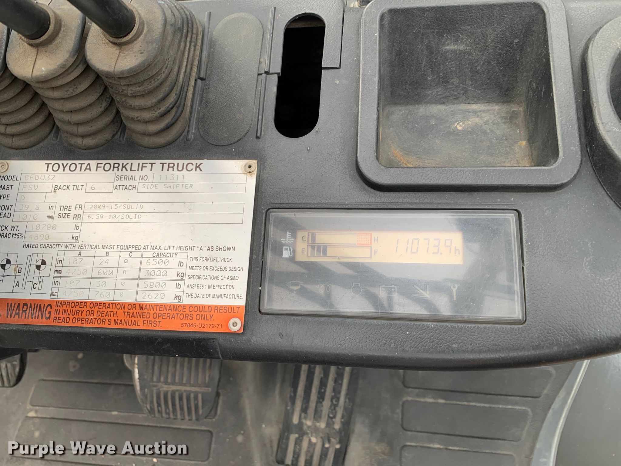 Purple Wave is selling a used Warehouse Forklift in Texas. This item is a Toyota 8FDU32 forklift with the following: Hours: 11,074 on meter, Serial: 11311