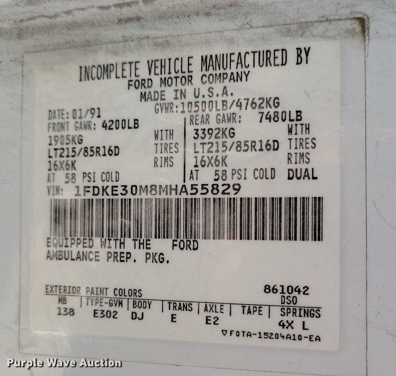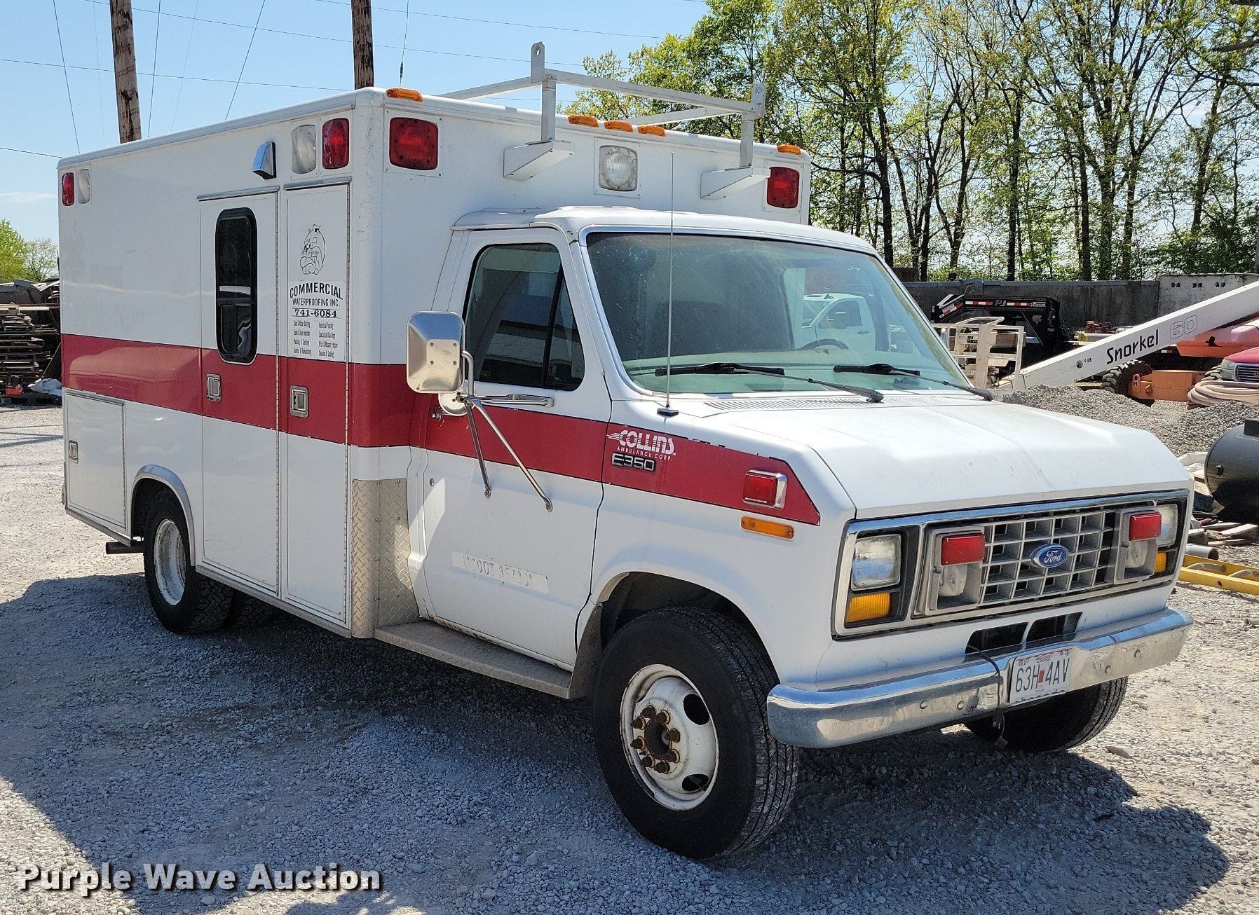 1991 Ford E350 ambulance. Miles: 3,889 on odometer, VIN: 1FDKE30M8MHA55829. Engine Displacement: 7.3L, Cylinders: 8, Fuel type: Diesel. Transmission Automatic. Chassis Axles: Single, Suspension: Spring, Brakes: Hydraulic. Interior Heat, Cruise control, Auxiliary controls. Tires Size: LT215/85R16. Notes Non-operational alternator, needs replaced. Missouri title. Title distribution may be delayed up to 14 days from verification of funds. Commercial Waterproofing, Inc... Kansas City, MO 64152