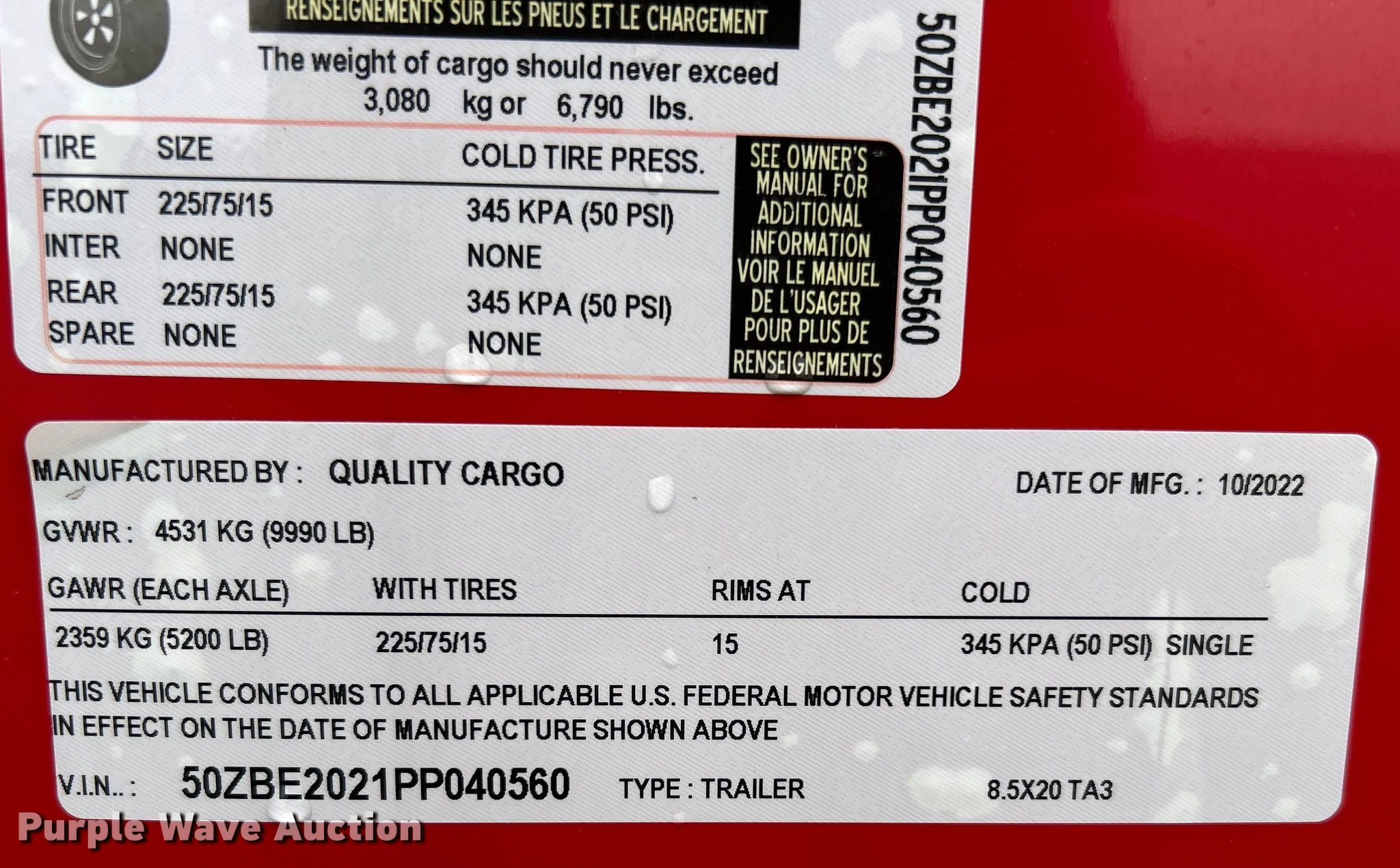 Purple Wave is selling a used Enclosed Cargo Trailer in Oklahoma. This item is a 2023 Quality cargo 8.5X20TA3 food trailer with the following: VIN: 50ZBE2021PP040560
