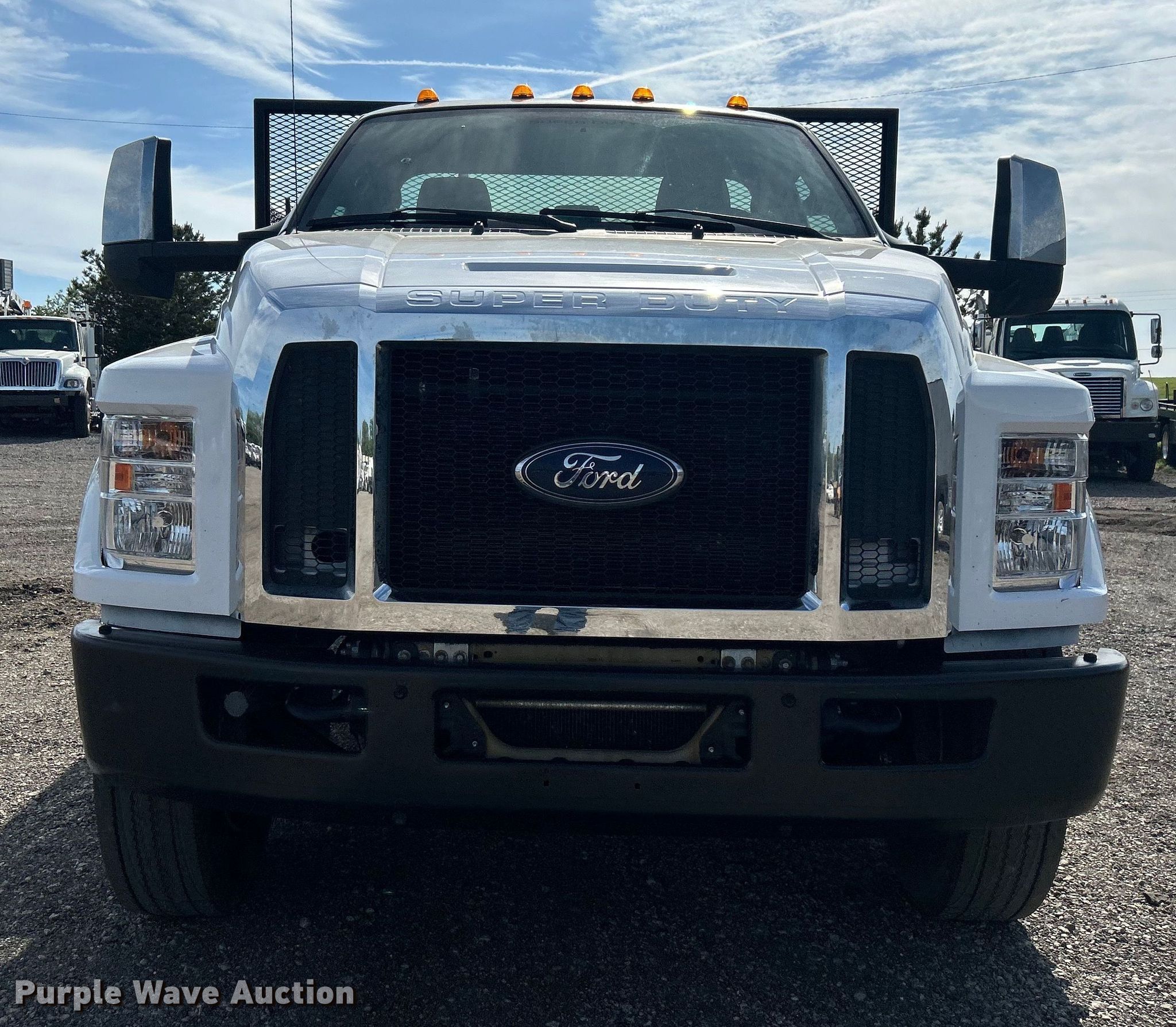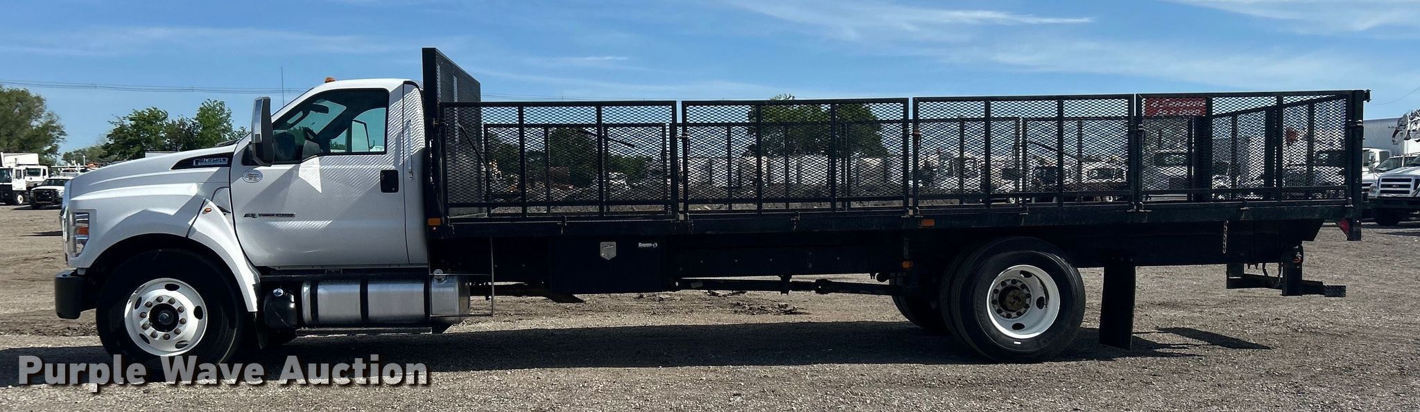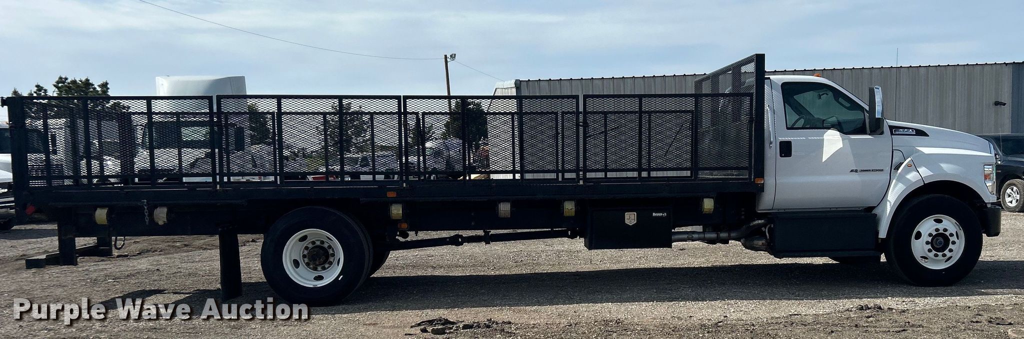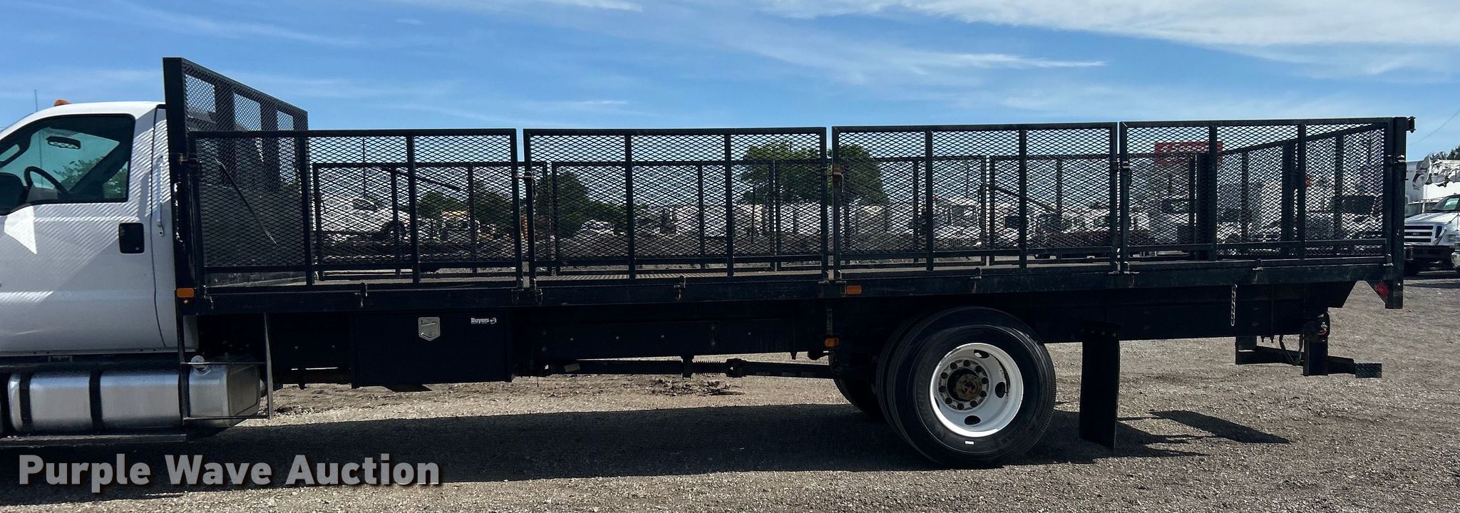 2017 Ford F650 Super Duty flatbed truck. Miles: 127,194 on odometer, VIN: 1FDNF6DC7HDB03010. Engine Displacement: 6.7L, Cylinders: 8, Fuel type: Diesel. Transmission Automatic. Chassis Axles: Single, Suspension: Spring, Brakes: Hydraulic, GVWR: 26,000 lbs, Wheelbase: 260". Interior AC, Heat, Cruise control, Auxiliary controls. Features Flatbed 24' 4" L x 101" W, Removable sides. Tires Size: 11R22.5. Notes Windshield chipped or cracked. Oklahoma title. Title distribution may be delayed up to 14 days from verification of funds. Collinsville, OK 74021