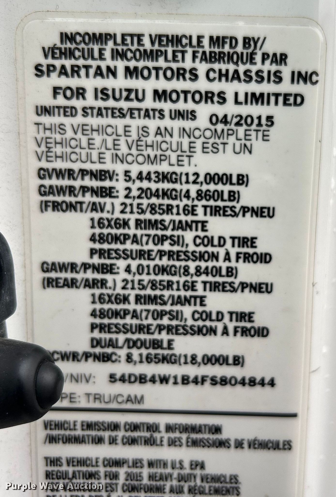 2015 Isuzu NPR box truck. Miles: 229,190 on odometer, VIN: 54DB4W1B4FS804844. Engine Displacement: 6.0L, Cylinders: 8, Fuel type: Gas. Transmission Automatic. Chassis Axles: Single, Suspension: Spring, Brakes: Hydraulic, GVWR: 12,000 lbs. Interior AC, Heat, Heated mirrors, Power windows, Power locks, Cruise control. Features Box bed Brown Industries, LLC 591212141, Serial: 27671, 14' L x 96" W x 91" H, Floor: Wood, Slider ramp Width: 26".. Tires Front: LT215/85R16. Notes Windshield chipped or cracked. Oklahoma title. Title distribution may be delayed up to 14 days from verification of funds. Collinsville, OK 74021