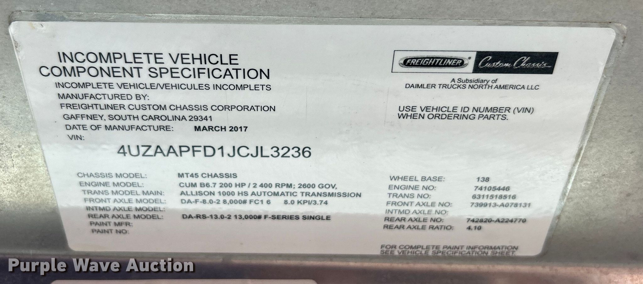 Purple Wave is selling a used Delivery Truck or Van in Oklahoma. This item is a 2018 Freightliner MT45 delivery truck with the following: Miles: 216,730 on odometer, Hours: 17,374 on meter, VIN: 4UZAAPFD1JCJL3236