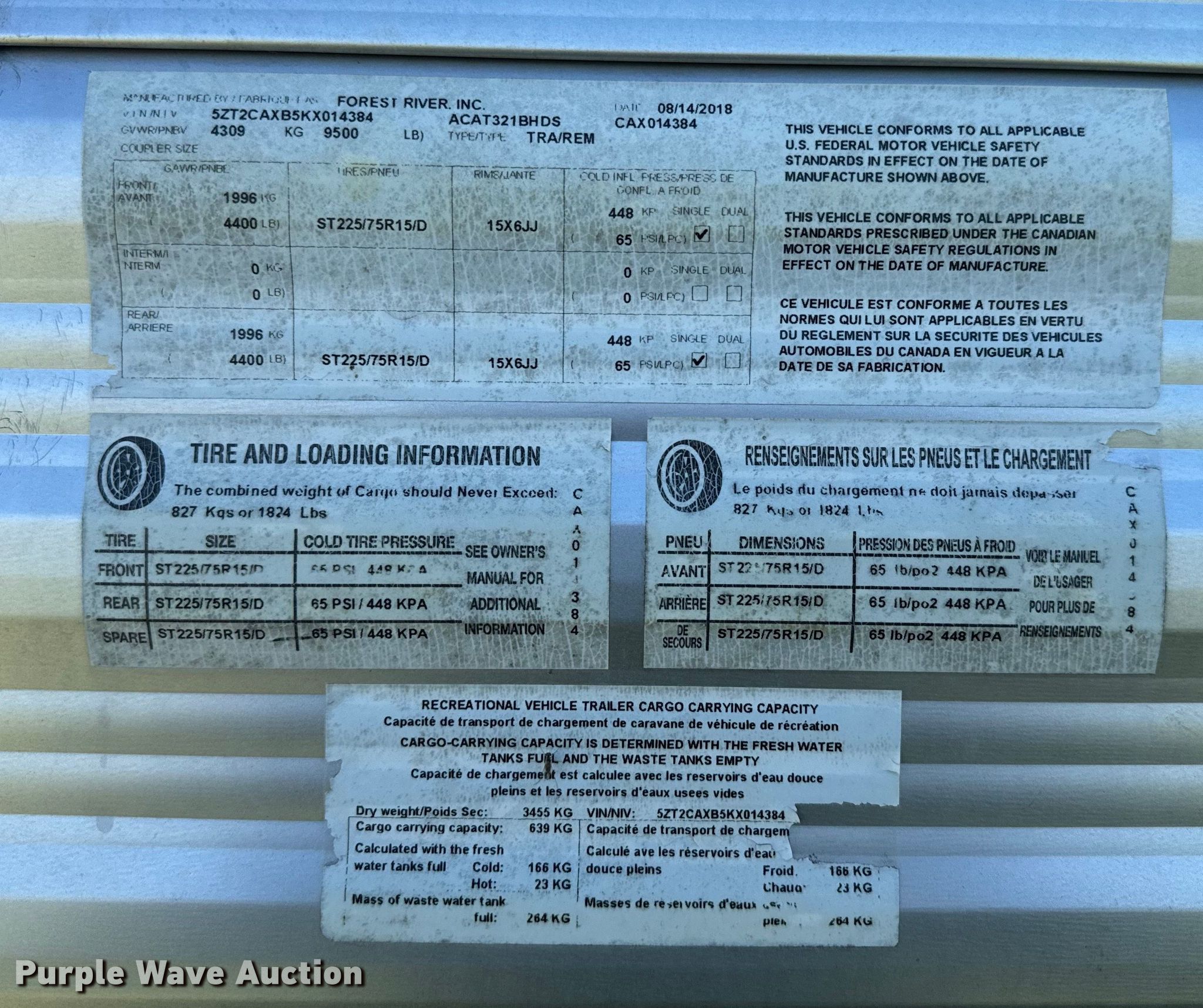 Purple Wave is selling a used RV or Camper in Florida. This item is a 2019 Forest River Coachmen Catalina camper with the following: Camper length: 32', VIN: 5ZT2CAXB5KX014384