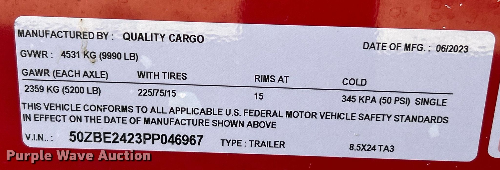 Purple Wave is selling a used Enclosed Cargo Trailer in Missouri. This item is a 2023 Quality Cargo 8.5X24TA3 enclosed cargo trailer with the following: VIN: 50ZBE2423PP046967