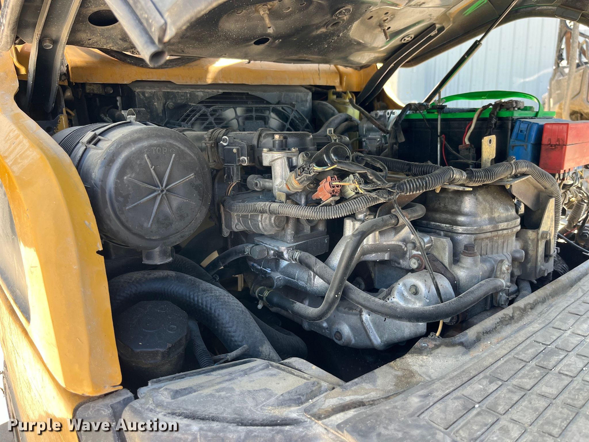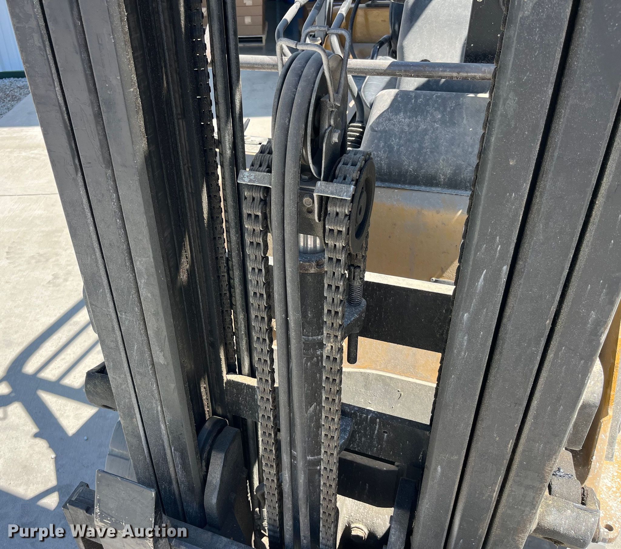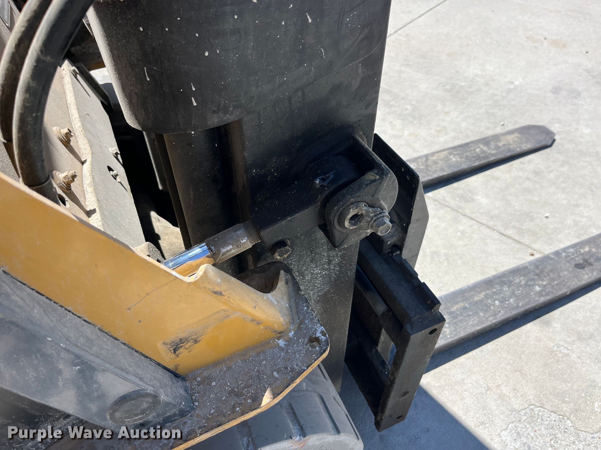 Caterpillar C4000 forklift. Hours: 8,481 on meter, Serial: AT9004390. Engine Displacement: 2.5L, Cylinders: 4, Fuel type: LPG LP bottle: Included. Transmission Powershift, 1F - 1R. Operators station Canopy. Features Maximum lift capacity: 3,750 lbs, Maximum lift height: 187", Mast stages: 3, Side shift, Mast tilt, Fork length: 42". Tires Front: 21x7x15, Rear: 16x6x10 1/2, Solid, Non-marking. Notes Dead battery. NEMO Feed LLC. 50726 State Highway 15. Baring, MO 63531